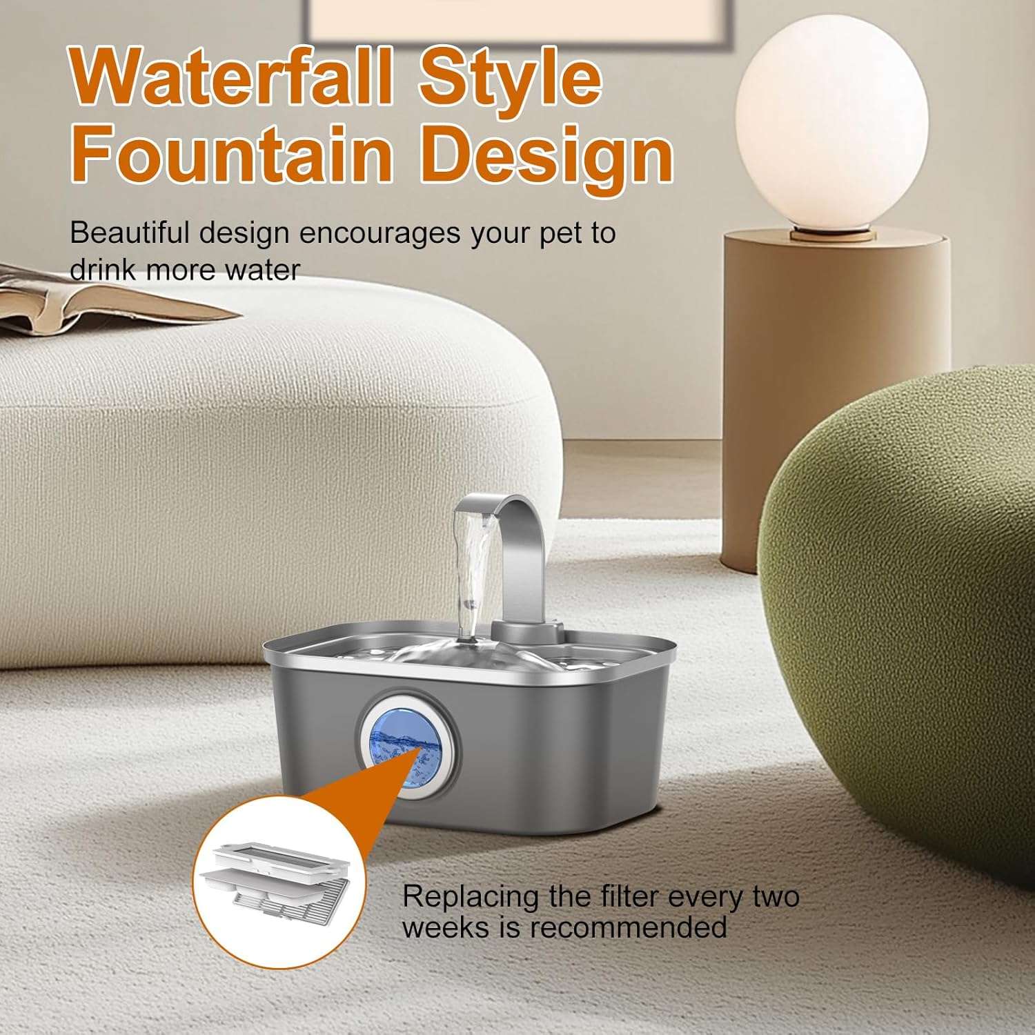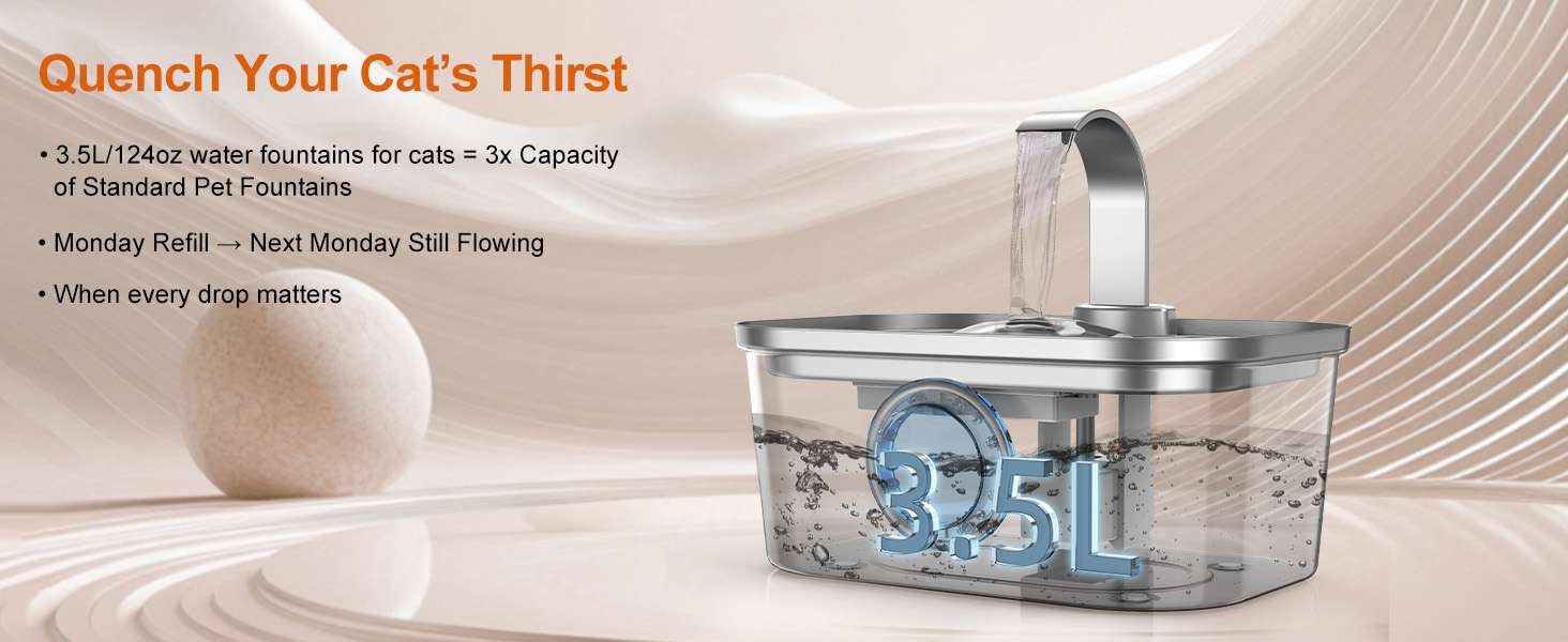 Con una gran capacidad de 3.5 Litros (124 oz), esta fuente es la estación de hidratación perfecta tanto para gatos exigentes como para perros pequeños y medianos. Su diseño de cascada curva atrae a las mascotas a beber más, mientras que el depósito grande asegura agua fresca hasta por 2 semanas, dándote libertad total para viajes cortos o días de oficina largos.