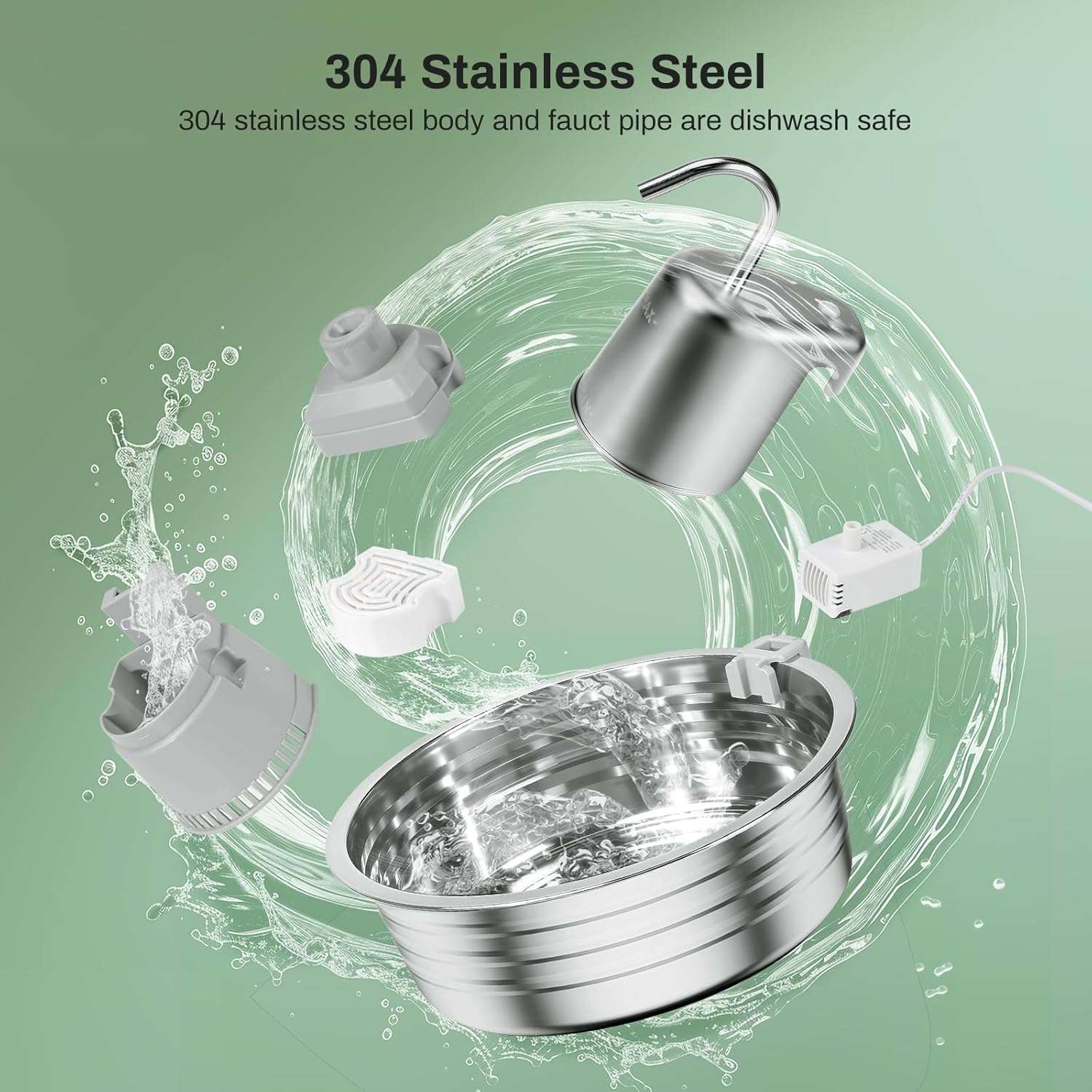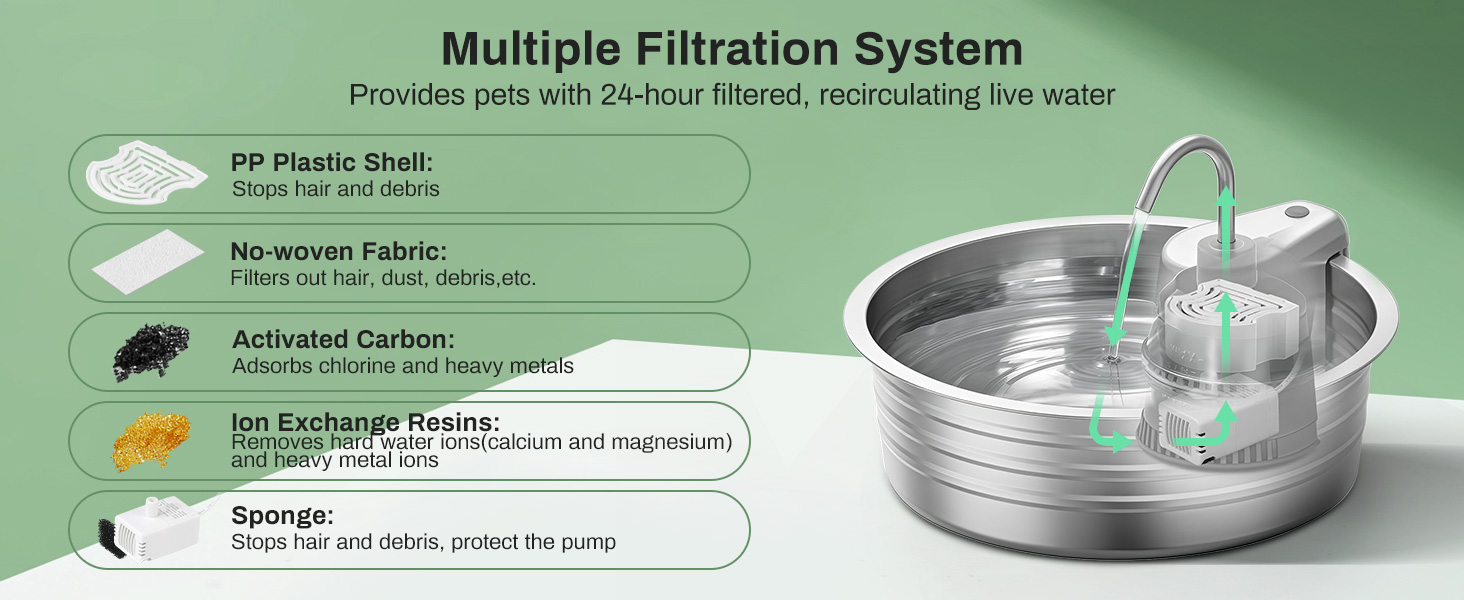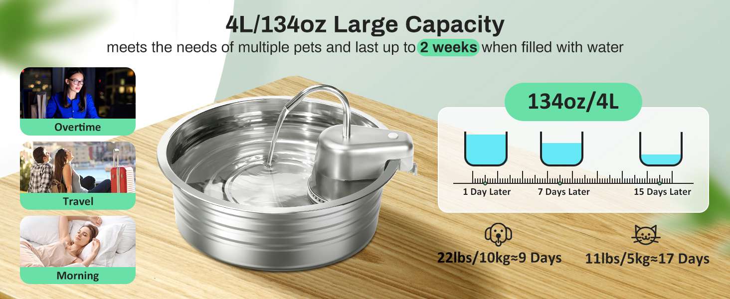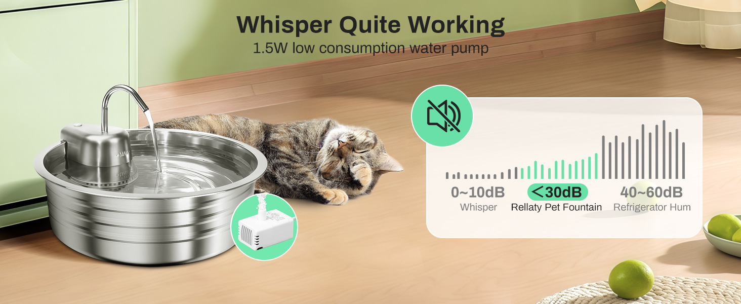 Olvídate del plástico y los ruidos molestos. Fabricada en Acero Inoxidable 304 de grado alimenticio, esta fuente es higiénica, libre de BPA y apta para lavavajillas. Su bomba de tecnología avanzada es ultra silenciosa (menos de 25 dB), garantizando que el único sonido que escucharás será el suave fluir del agua, creando un ambiente relajante en tu hogar.