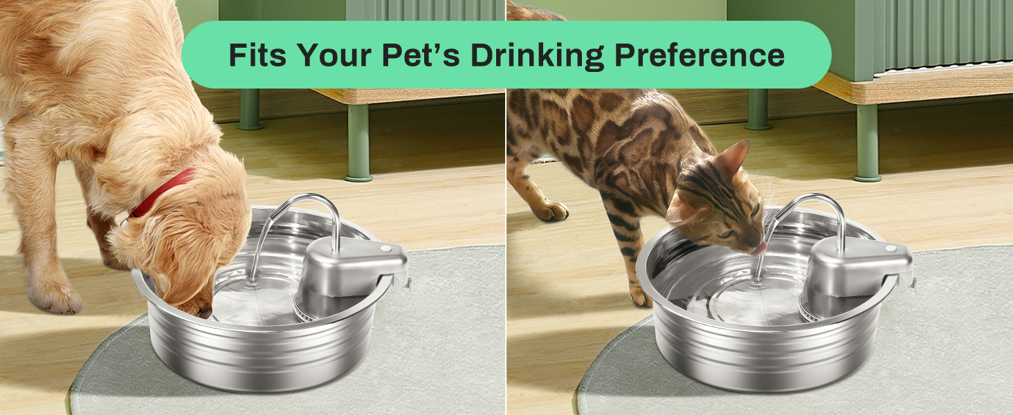 Atracción Dual: Chorro tipo grifo para gatos y cuenco abierto para perros.