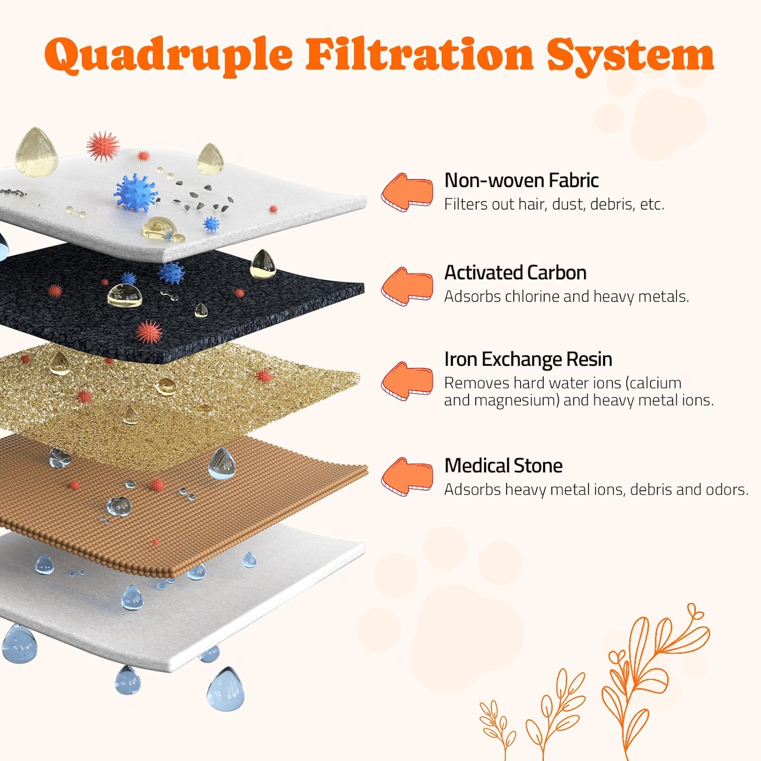 Filtración Cuádruple: Sistema de 4 etapas con carbón activado que elimina olores, pelos y suaviza el agua, protegiendo la salud renal de tu mascota.