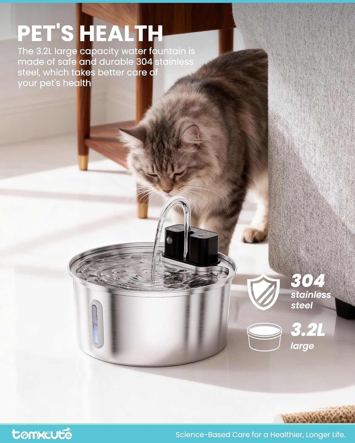 Tecnología que cuida su salud y tu tranquilidad El plato de acero inoxidable garantiza que tu mascota beba sobre una superficie limpia y libre de bacterias, previniendo el acné felino. Su sensor inteligente no solo ahorra batería, sino que despierta el instinto natural de beber al activar el flujo de agua cuando ellos se acercan. Además, la ventana transparente te permite revisar el nivel de los 3.2 litros de un vistazo, asegurando que tus regalones siempre tengan su hidratación al día.