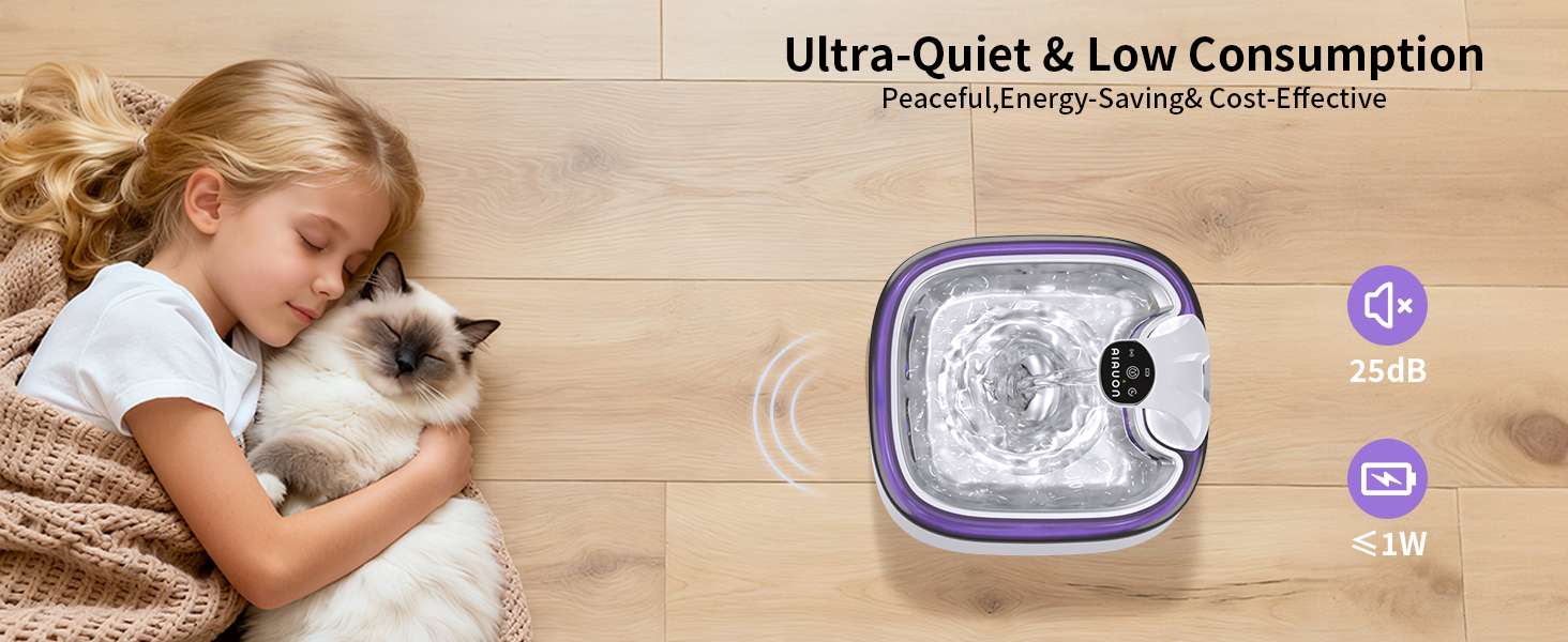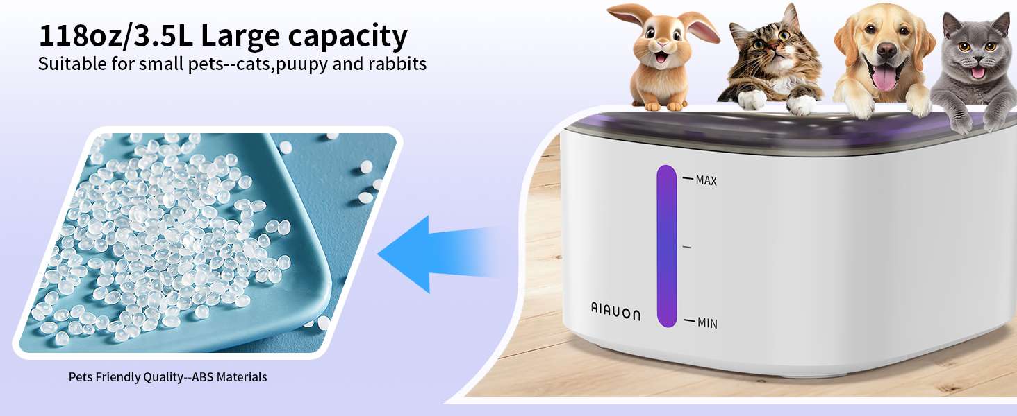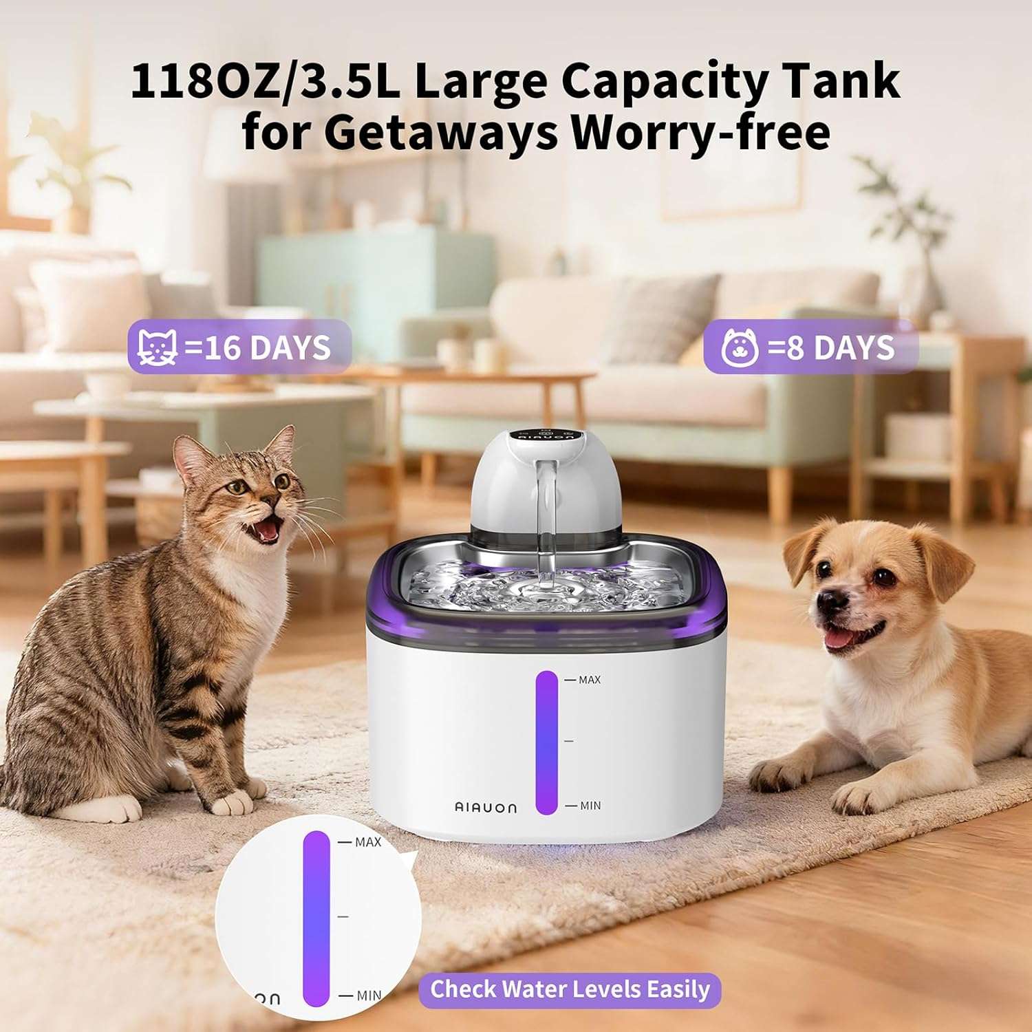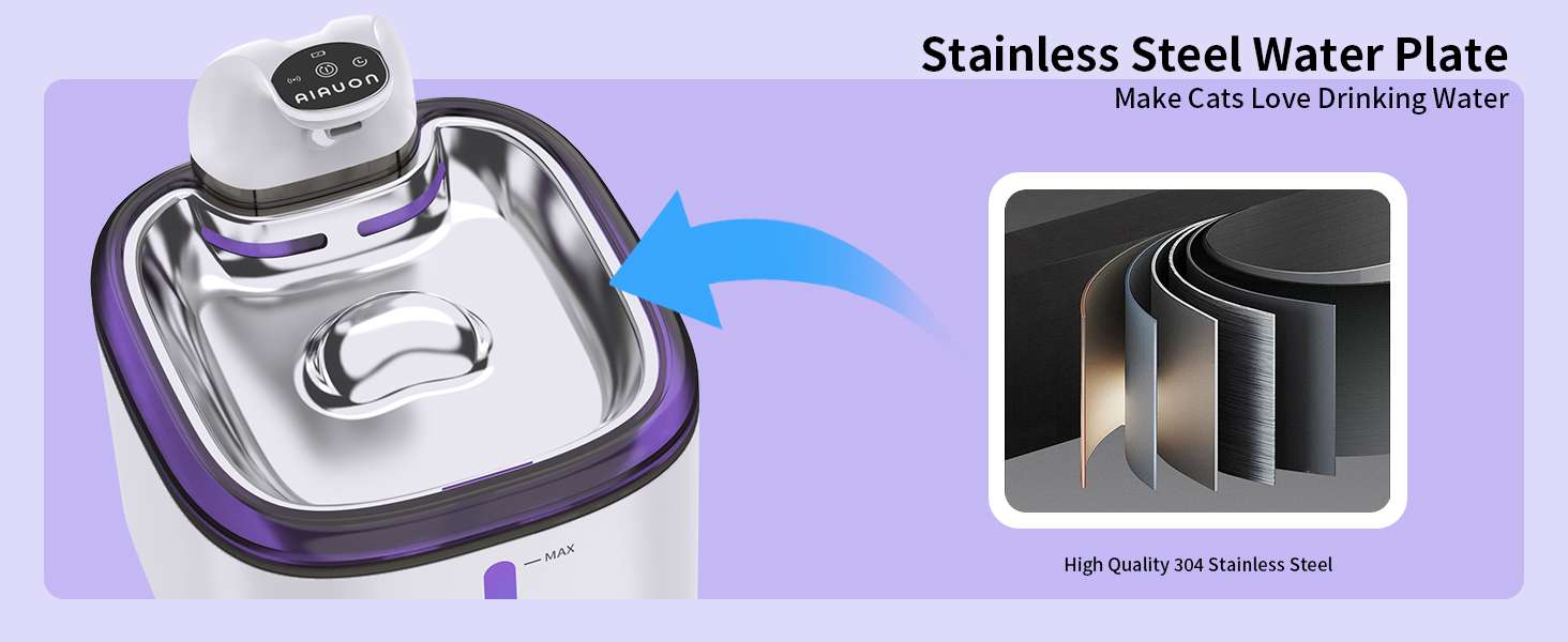 La bandeja para beber está hecha de Acero Inoxidable, la superficie recomendada por expertos para prevenir el acné felino y facilitar la limpieza. Con un tanque de 3.5 Litros, tendrás agua fresca por hasta 10 días. Todo esto funciona con una bomba ultra silenciosa (menos de 30 dB), asegurando un ambiente tranquilo para ti y tu mascota.