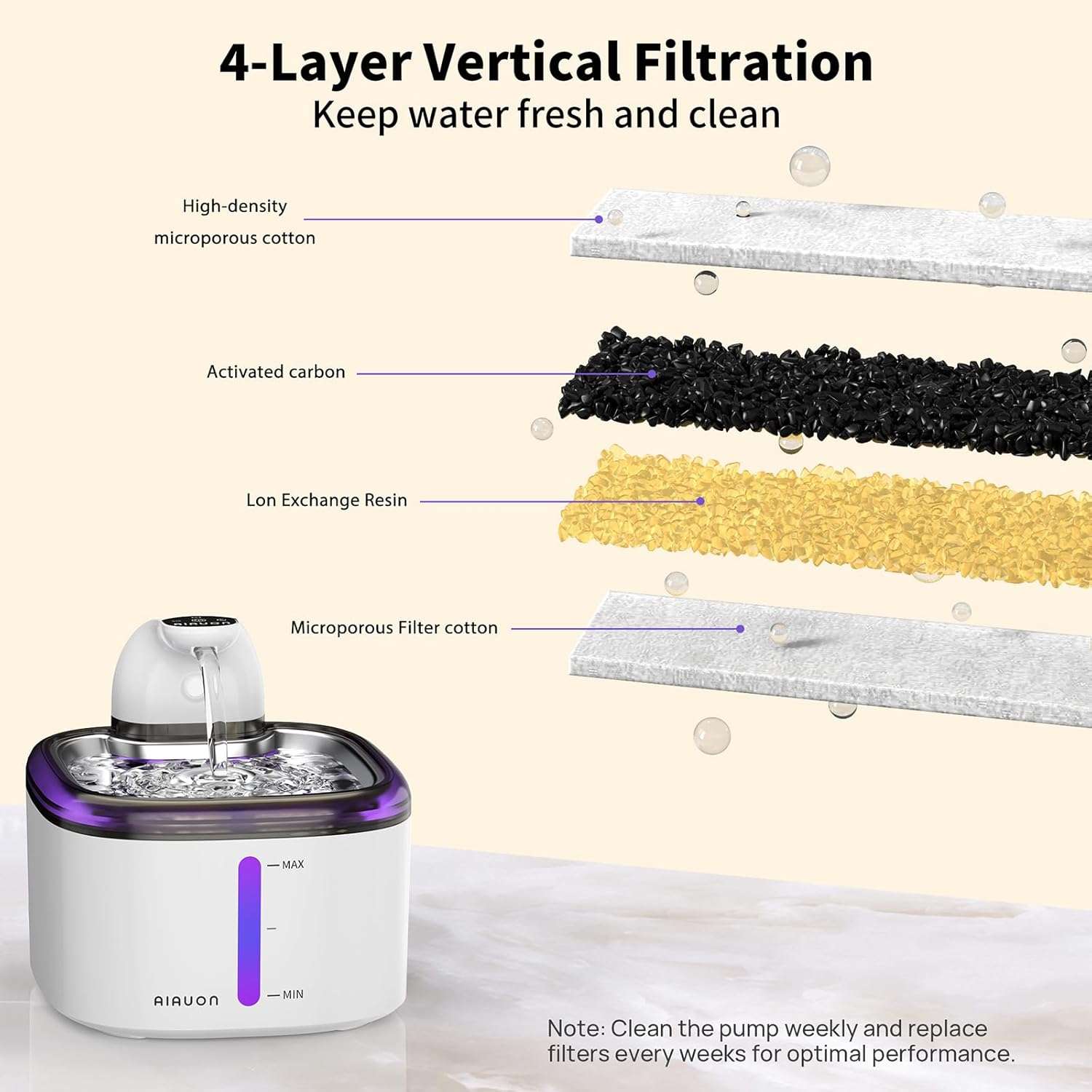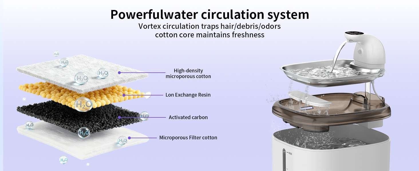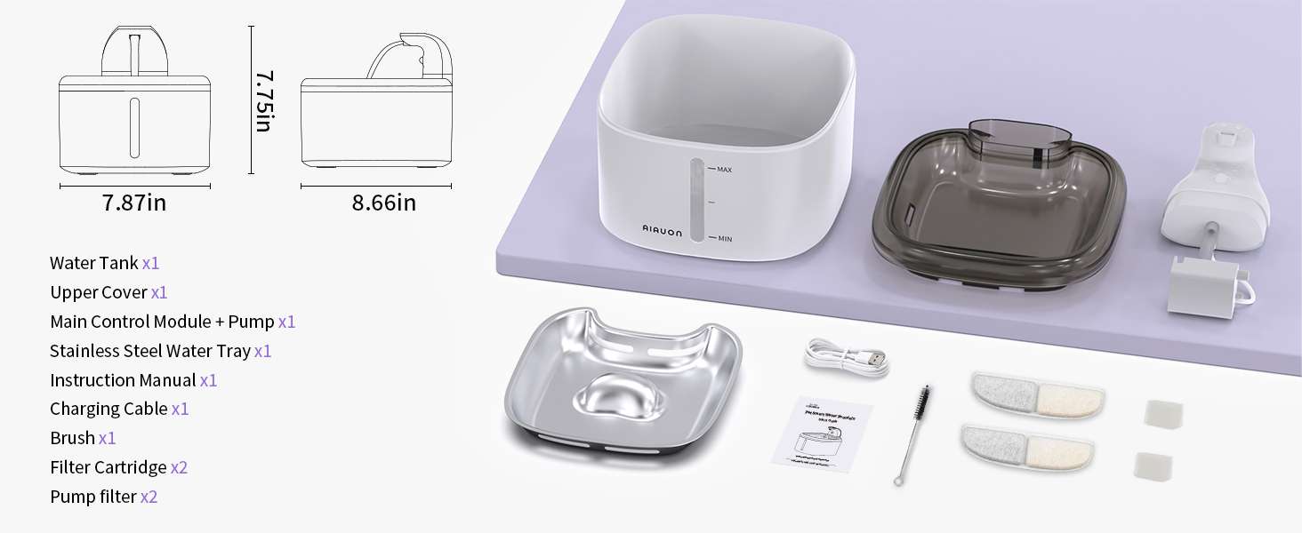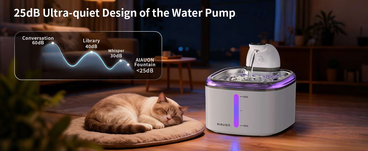La bandeja para beber está hecha de Acero Inoxidable, la superficie recomendada por expertos para prevenir el acné felino y facilitar la limpieza. Con un tanque de 3.5 Litros, tendrás agua fresca por hasta 10 días. Todo esto funciona con una bomba ultra silenciosa (menos de 30 dB), asegurando un ambiente tranquilo para ti y tu mascota.