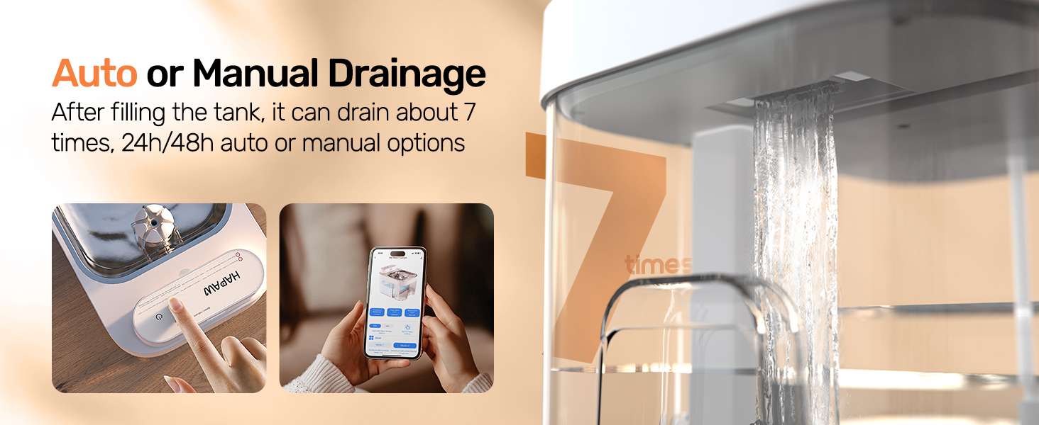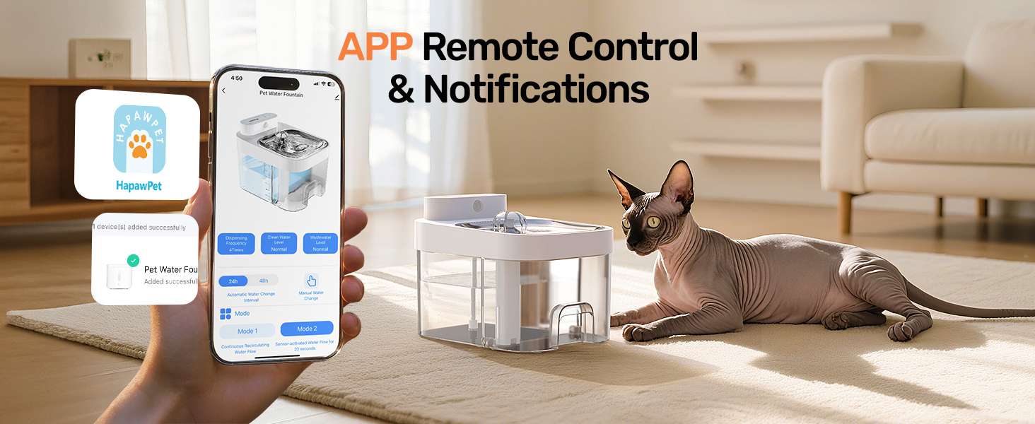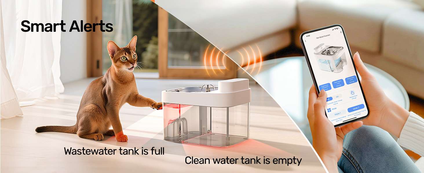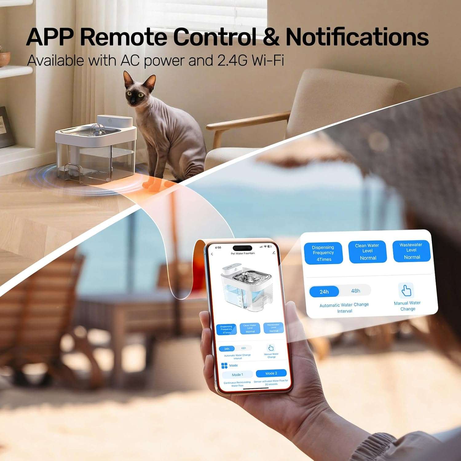 Gestiona la hidratación de tu gato desde tu celular. Conectada a la App móvil, puedes monitorear los niveles de agua limpia y sucia, programar horarios de drenaje y recibir alertas instantáneas donde sea que estés. (Nota: Las funciones WiFi requieren que la fuente esté enchufada a la corriente).