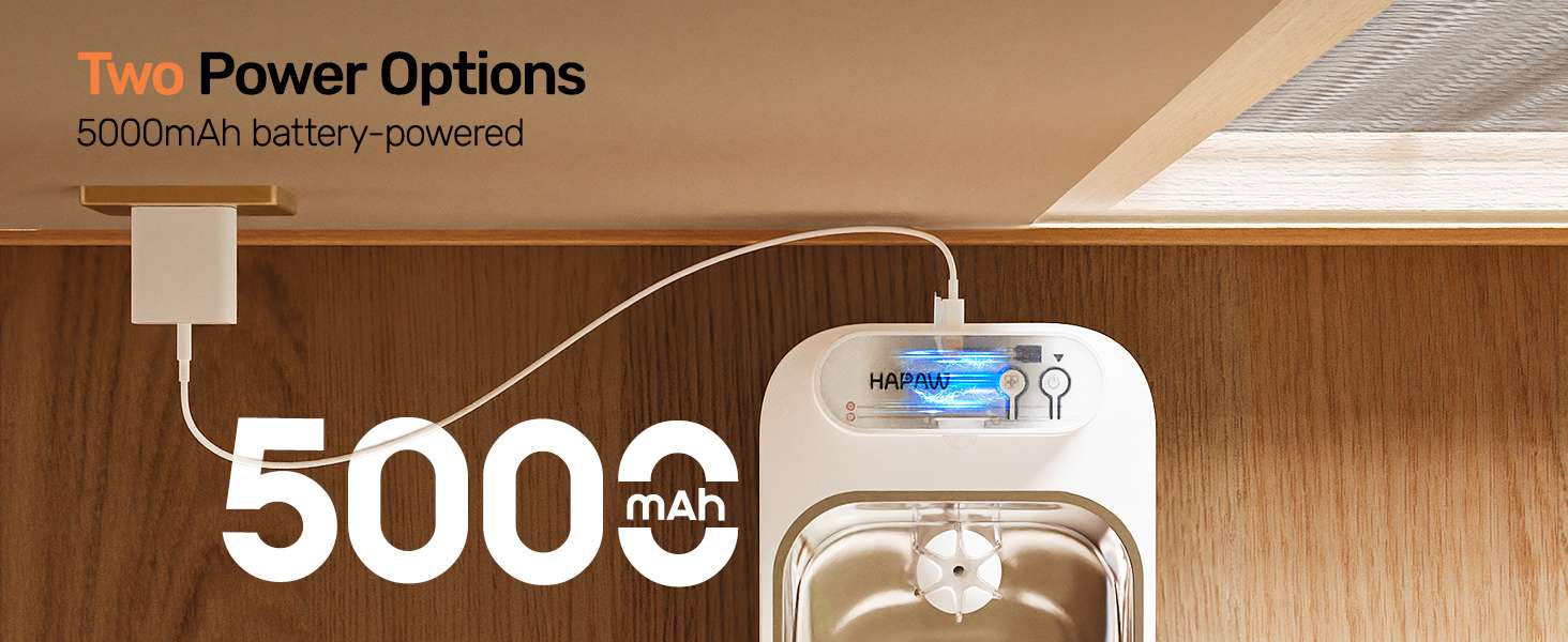 Nunca dejes a tu mascota sin agua. Esta fuente ofrece alimentación dual: úsala enchufada para funciones inteligentes o confía en su batería integrada de 5000 mAh que dura más de 15 días. Si se corta la luz, la fuente cambia automáticamente a modo batería, garantizando el suministro continuo.