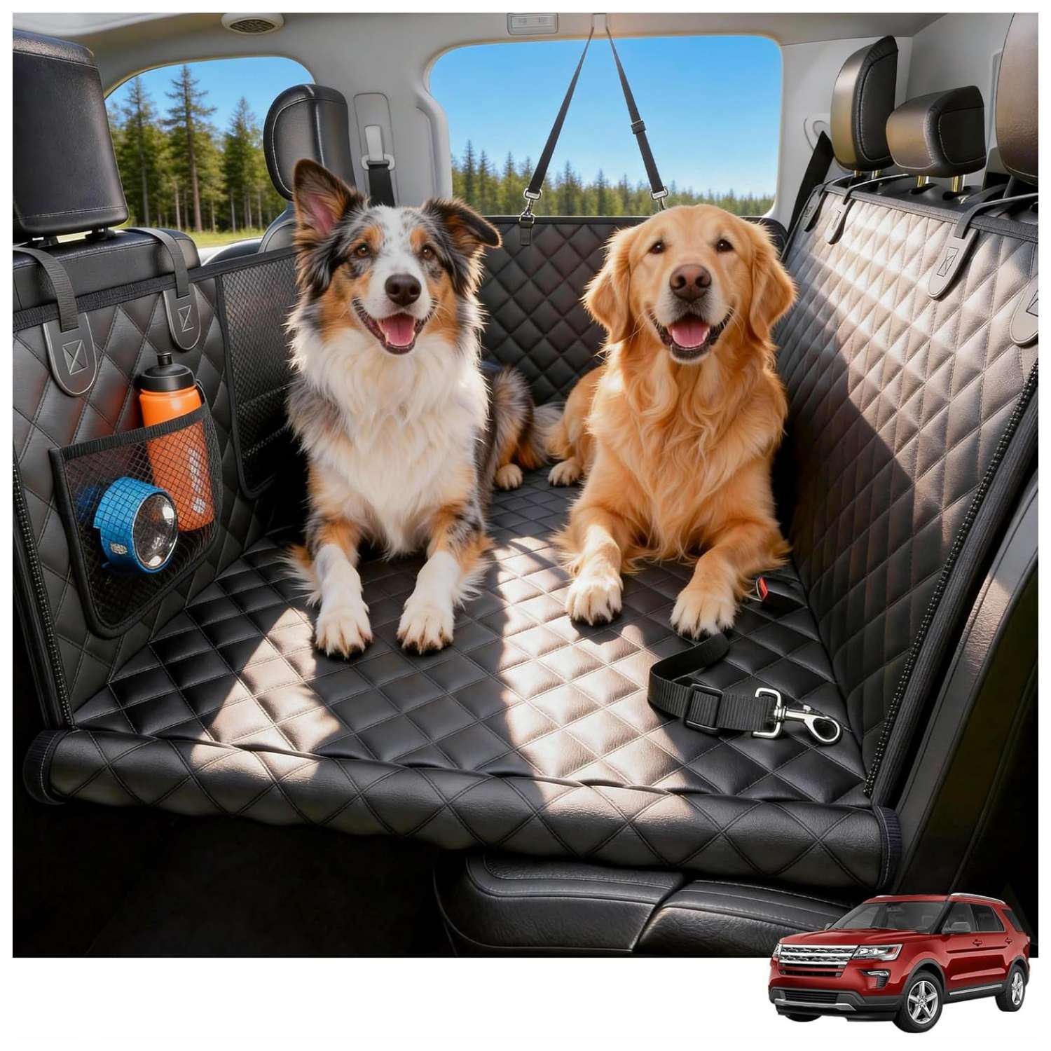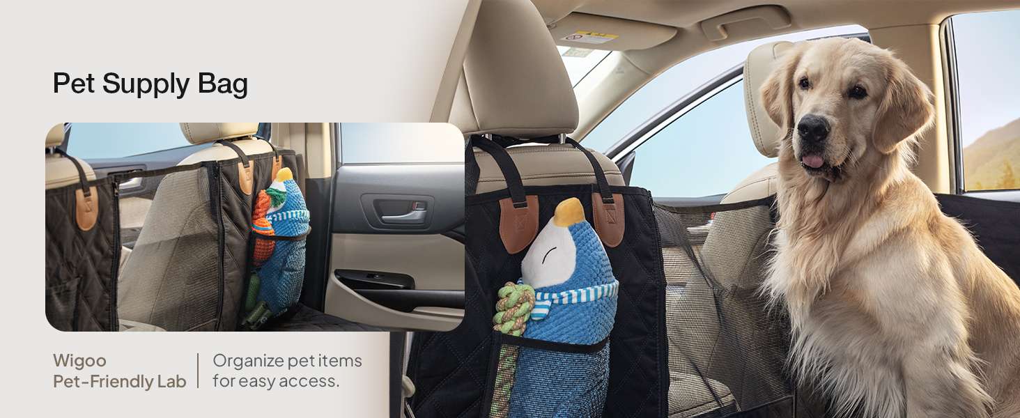 Instalacion Rapida en Tres Minutos Preparate para salir casi de inmediato. No necesitas herramientas ni manuales complicados para instalarla, solo debes ajustar las correas y hebillas a los apoyacabezas del auto. Para mayor seguridad, el diseno incluye un cinturon integrado y dos bolsillos muy amplios para que lleves comodamente sus juguetes, correas y premios.