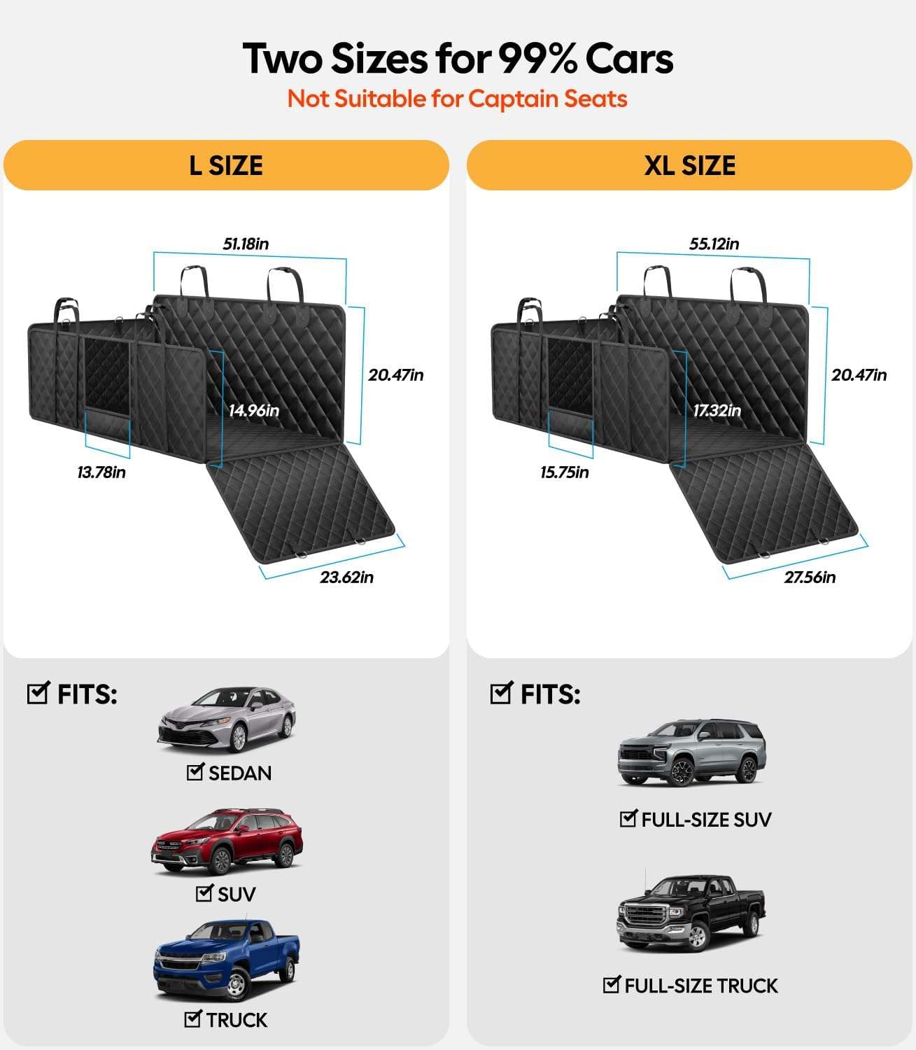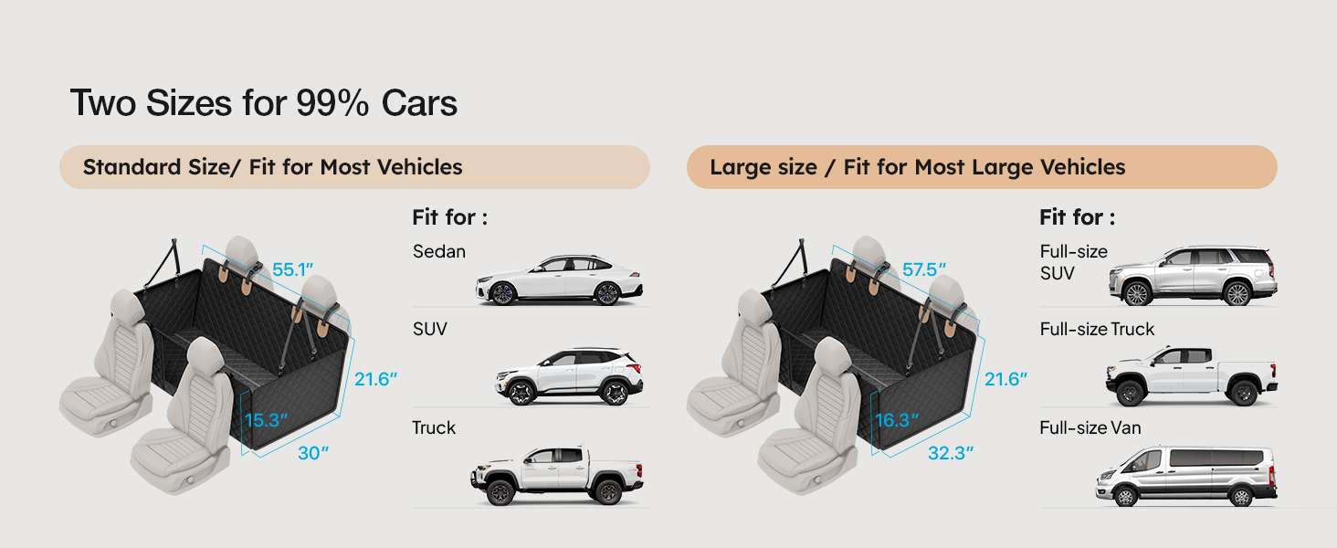 Dos Tallas para un Ajuste Perfecto Elige la medida ideal para tu vehiculo. Contamos con la talla L que mide 130 centimetros de largo por 60 de ancho, perfecta para la mayoria de los autos y SUV medianos. Si tienes una camioneta grande, la talla XL de 140 centimetros de largo por 70 de ancho y 52 de alto cubrira todo el espacio trasero sin problemas. Ten en cuenta que este modelo es para asientos enteros y no sirve para butacas individuales.