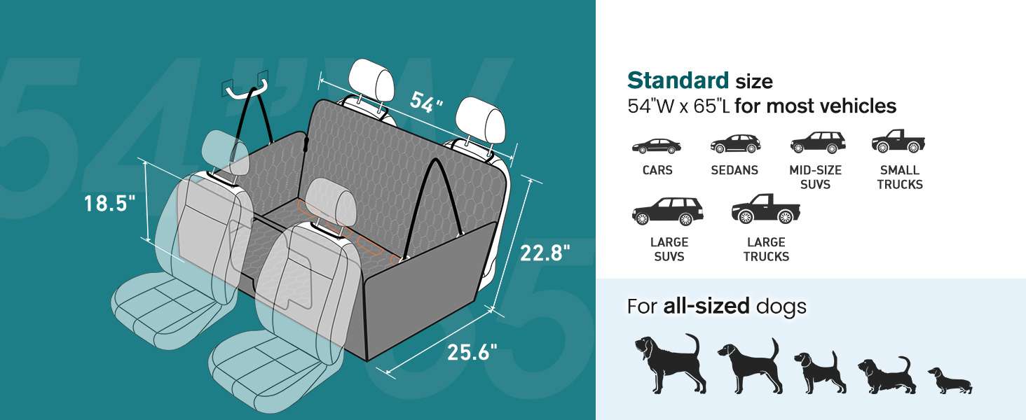 Proteccion Total para tu Tapiz Cuida el interior de tu auto al cien por ciento. Esta hamaca proporciona una cobertura completa para todo el asiento trasero y las puertas gracias a sus resistentes solapas laterales con cierres. Asi evitas que los rasgunos, los pelos y la suciedad lleguen a la tapiceria original.