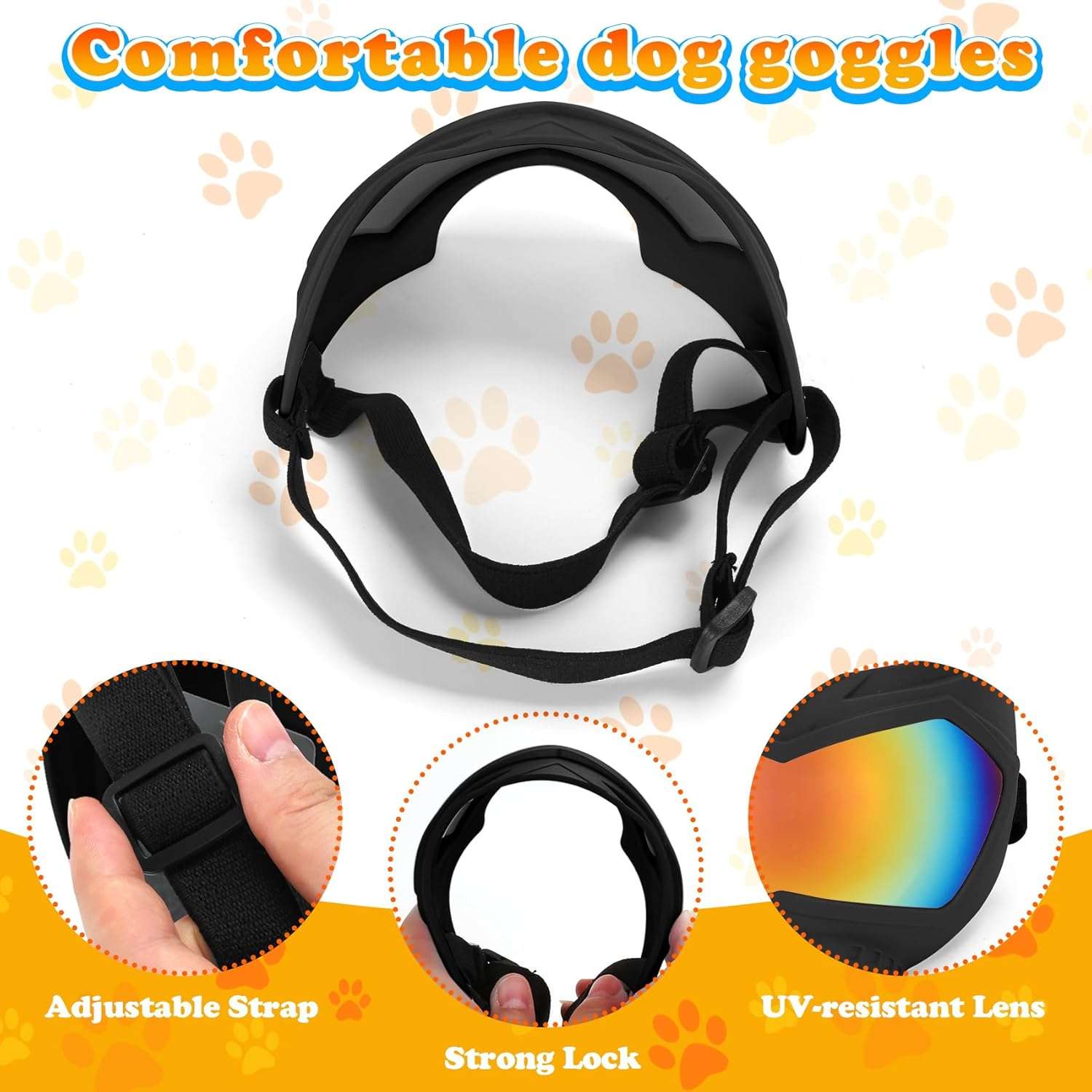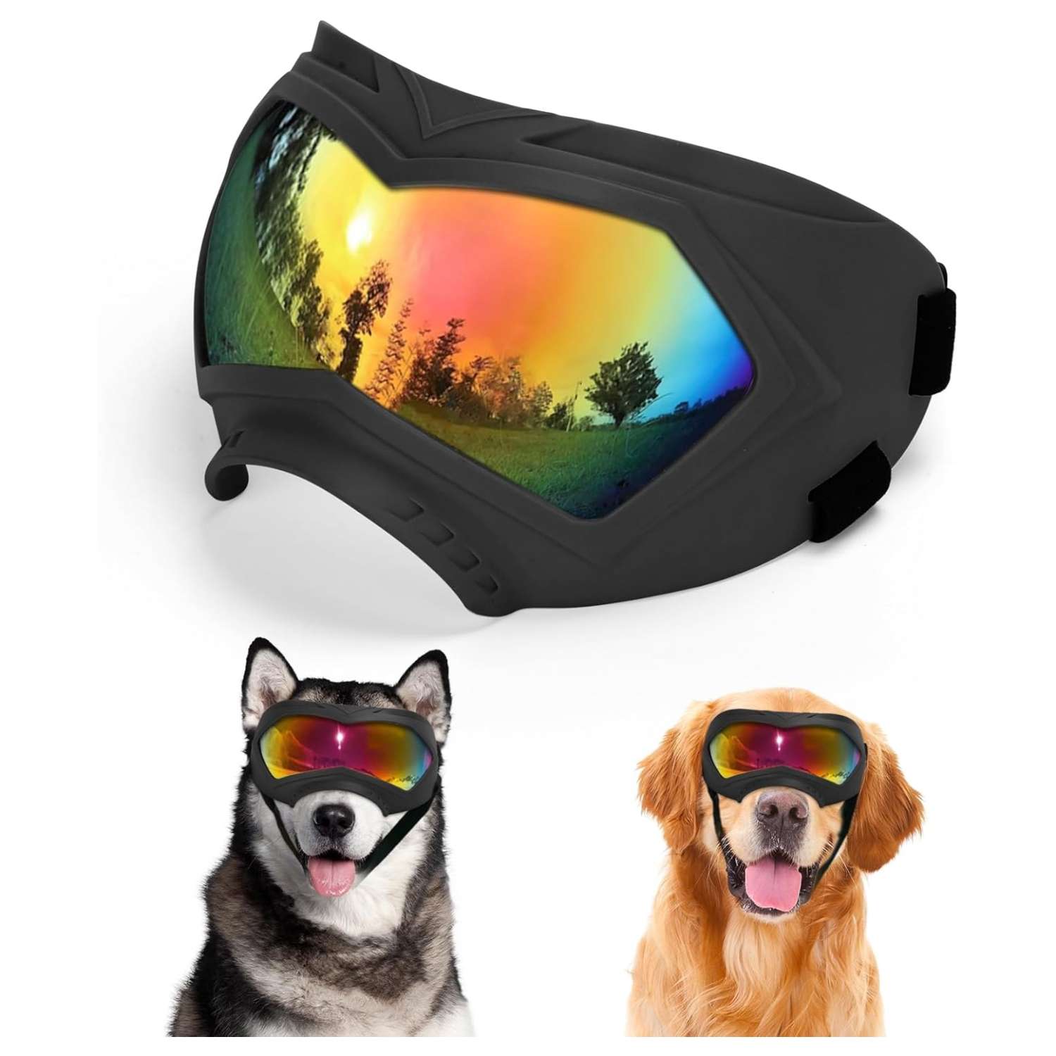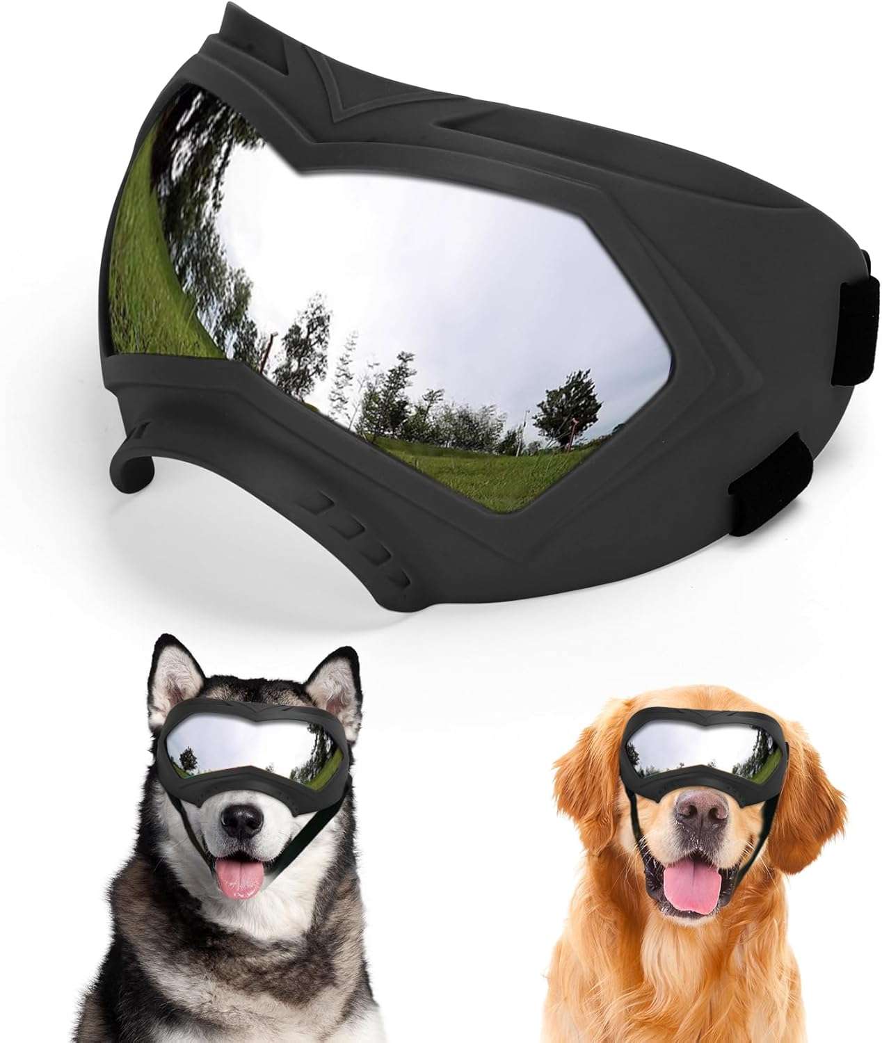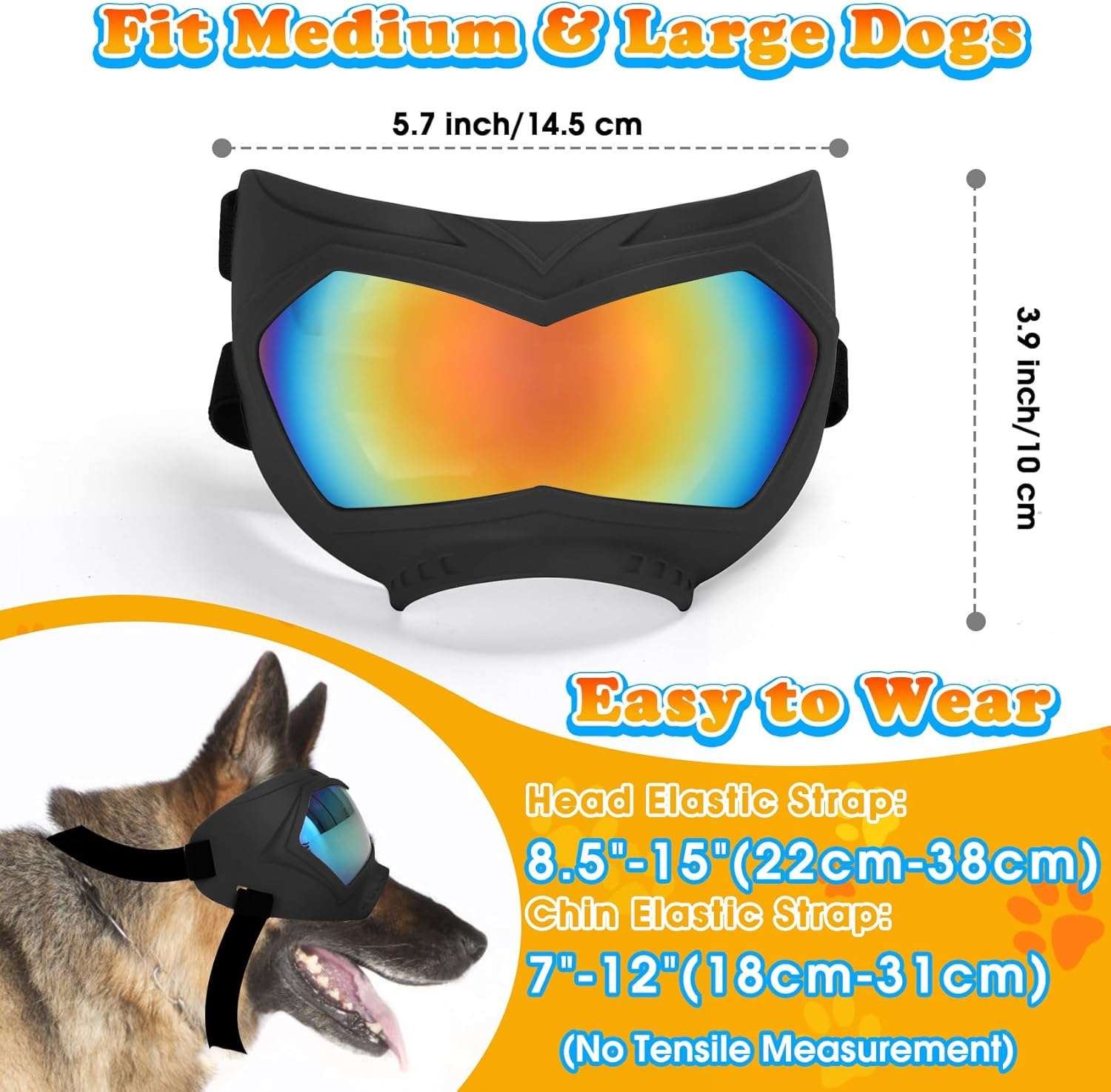 Ajuste Seguro para Razas Medianas y Grandes: Calce perfecto. Correa de Cabeza: 21 a 38 cm. Correa de Barbilla: 18 a 30 cm. Sus correas elasticas de alta calidad permiten un ajuste personalizado y firme, ideal para razas activas que corren o saltan, asegurando que las gafas no se muevan de su lugar.