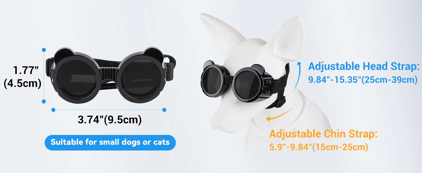 Talla XS para Perros Toy y Gatos: El ajuste que los pequeños necesitan. La mayoria de las antiparras quedan grandes, pero estas son especificas para cabezas pequeñas como Chihuahua, Yorkshire Terrier, Pomerania, Poodle Toy, Salchicha Mini y tambien para Gatos. (No sirven para perros medianos).