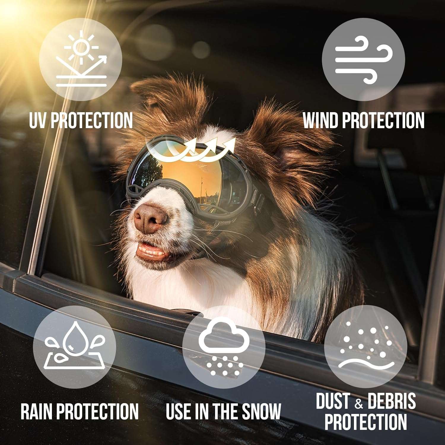 Proteccion Solar Certificada UV400: Bloqueo total de radiacion. Estas gafas cuentan con filtro UV400 real, que bloquea el 100 por ciento de los rayos UVA, UVB y UVC. Esta caracteristica es critica en el territorio chileno para prevenir daños corneales por el reflejo intenso del sol en la nieve o la arena, evitando la irritacion y la fatiga ocular del can.