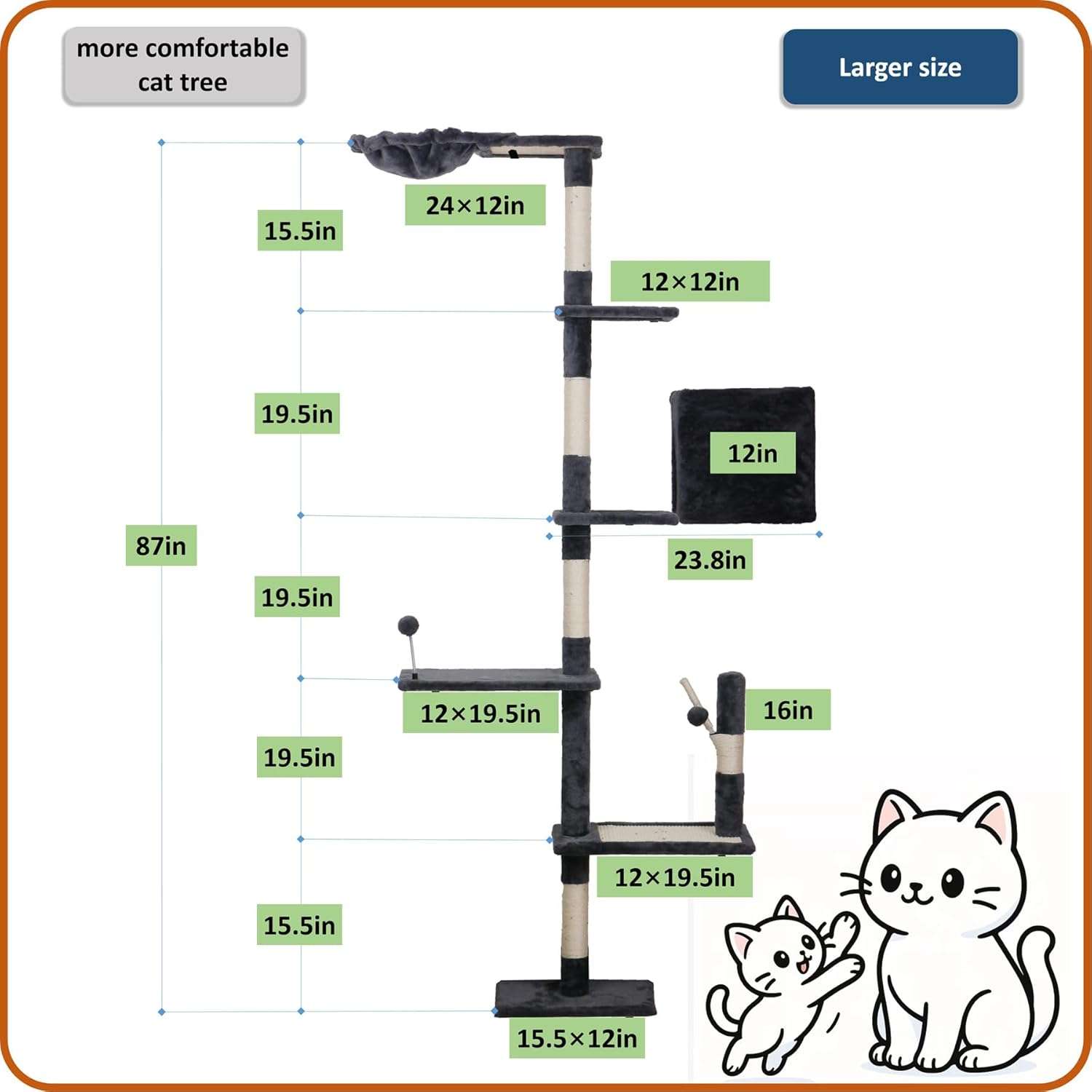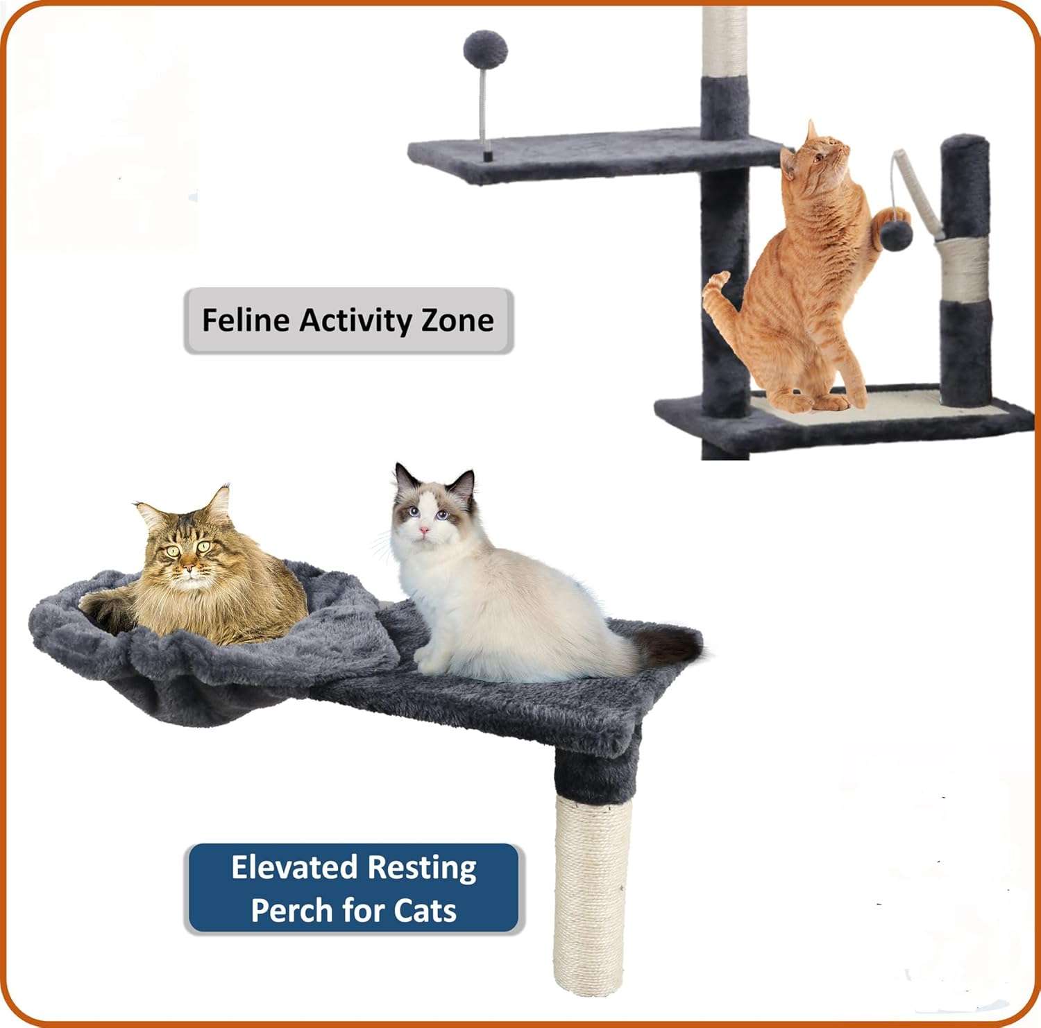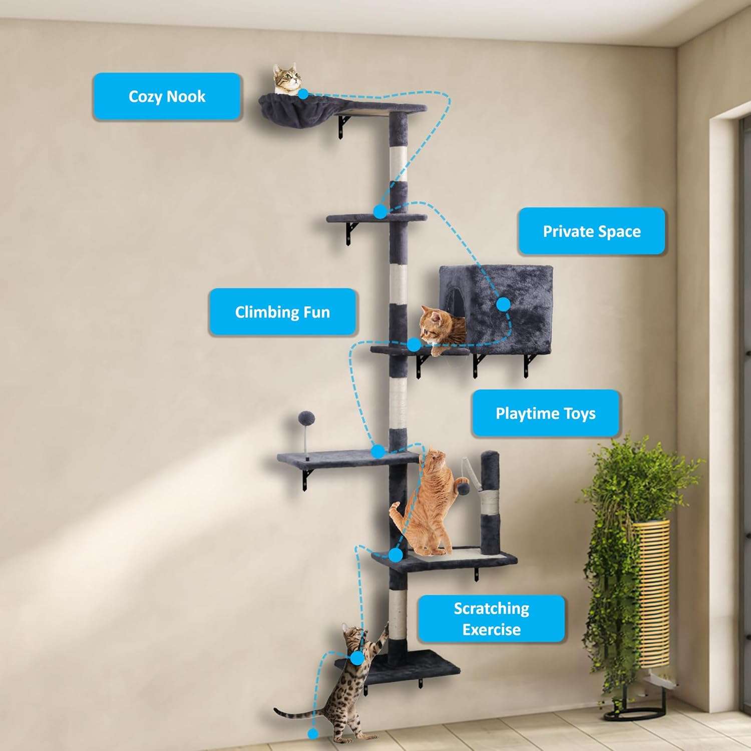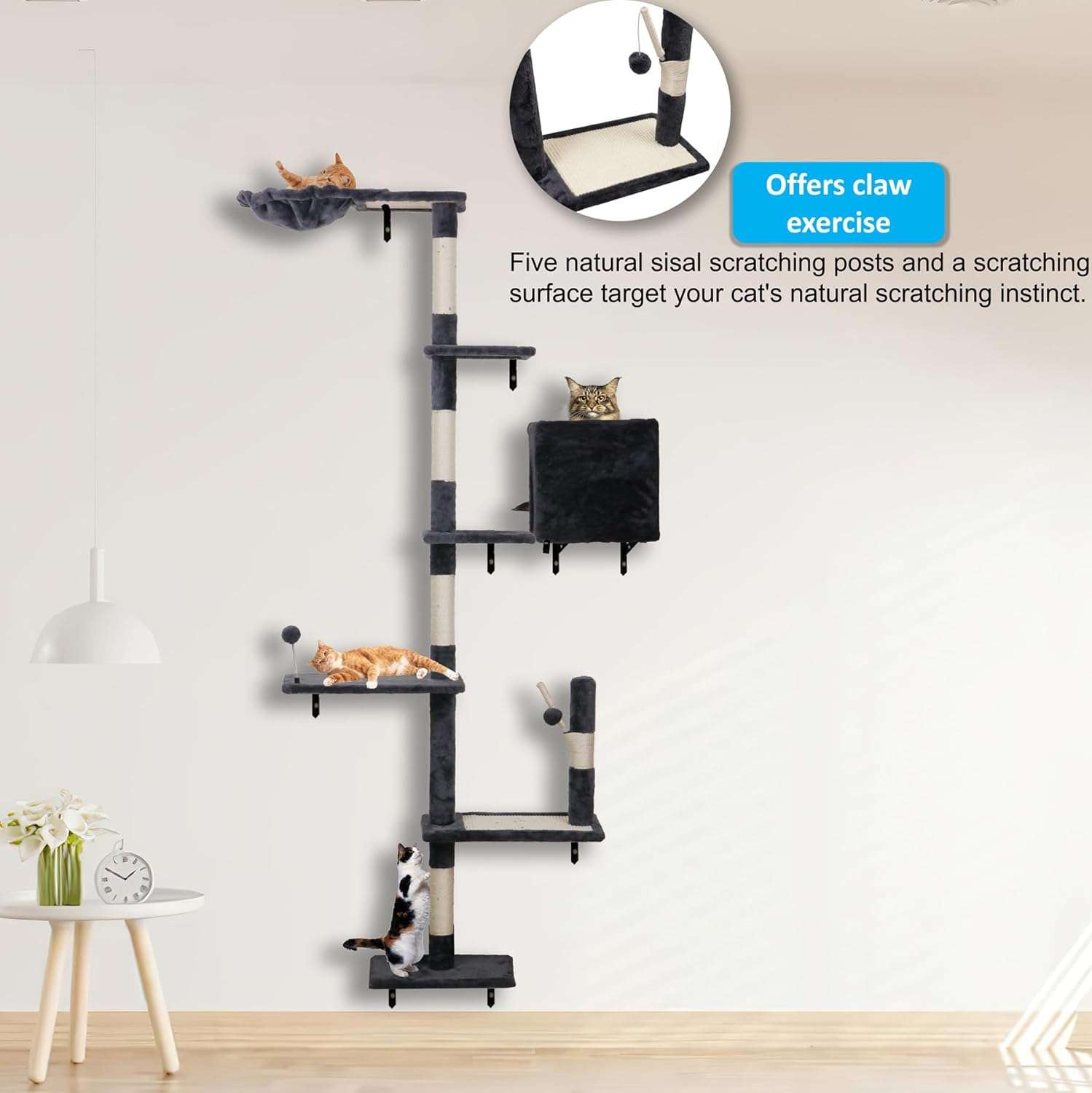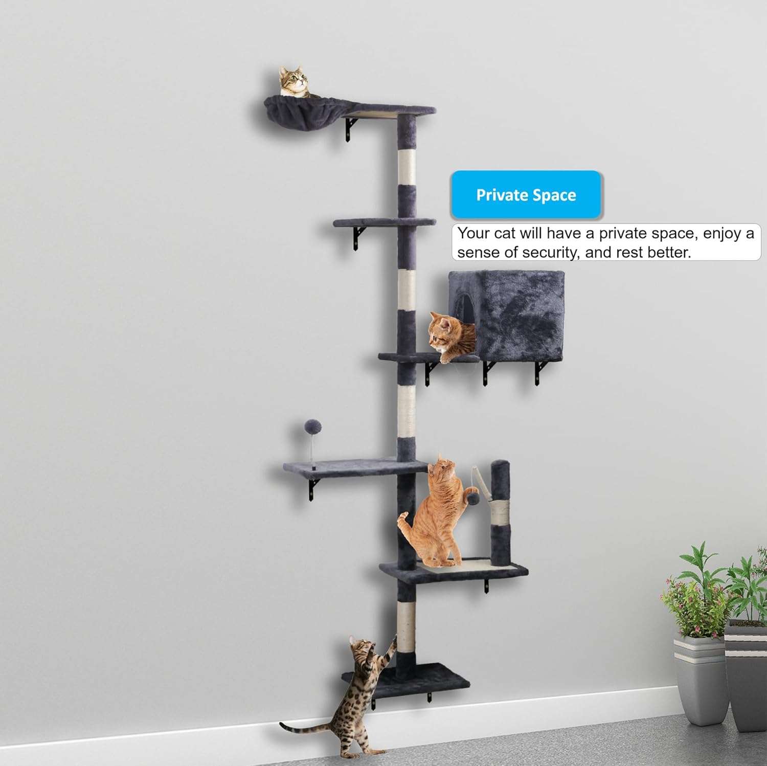 Centro de Actividades de Gran Altura: Con una altura de 224 centimetros, este gimnasio aprovecha al maximo la pared. Incluye un poste rascador, un condominio privado para dormir y una bola de resorte. Permite que su gato trepe hasta lo mas alto y juegue con total libertad.