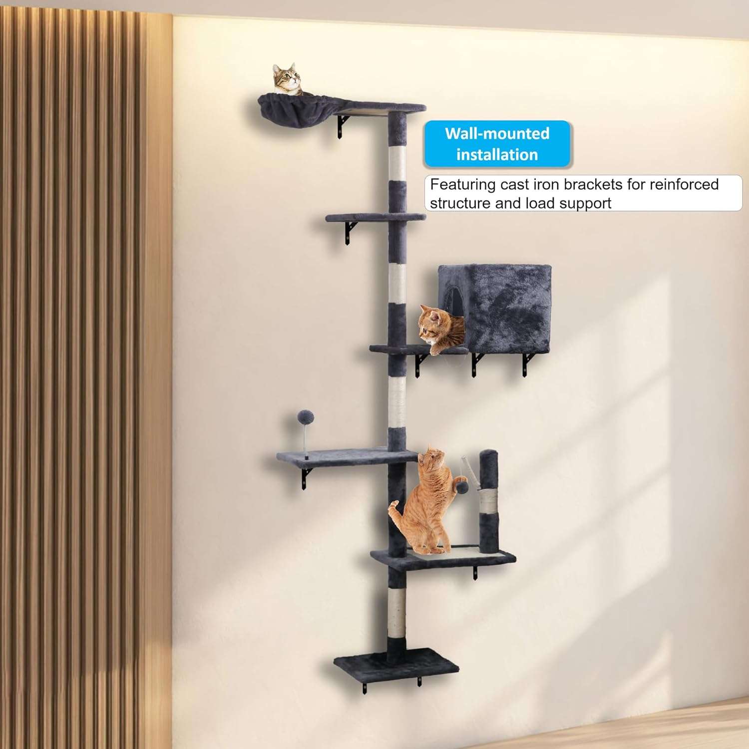 Gimnasio de Pared para Gatos (224x81x30 cm) Set Completo con Rascador y Casa.