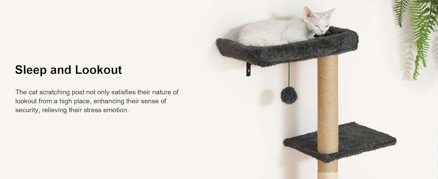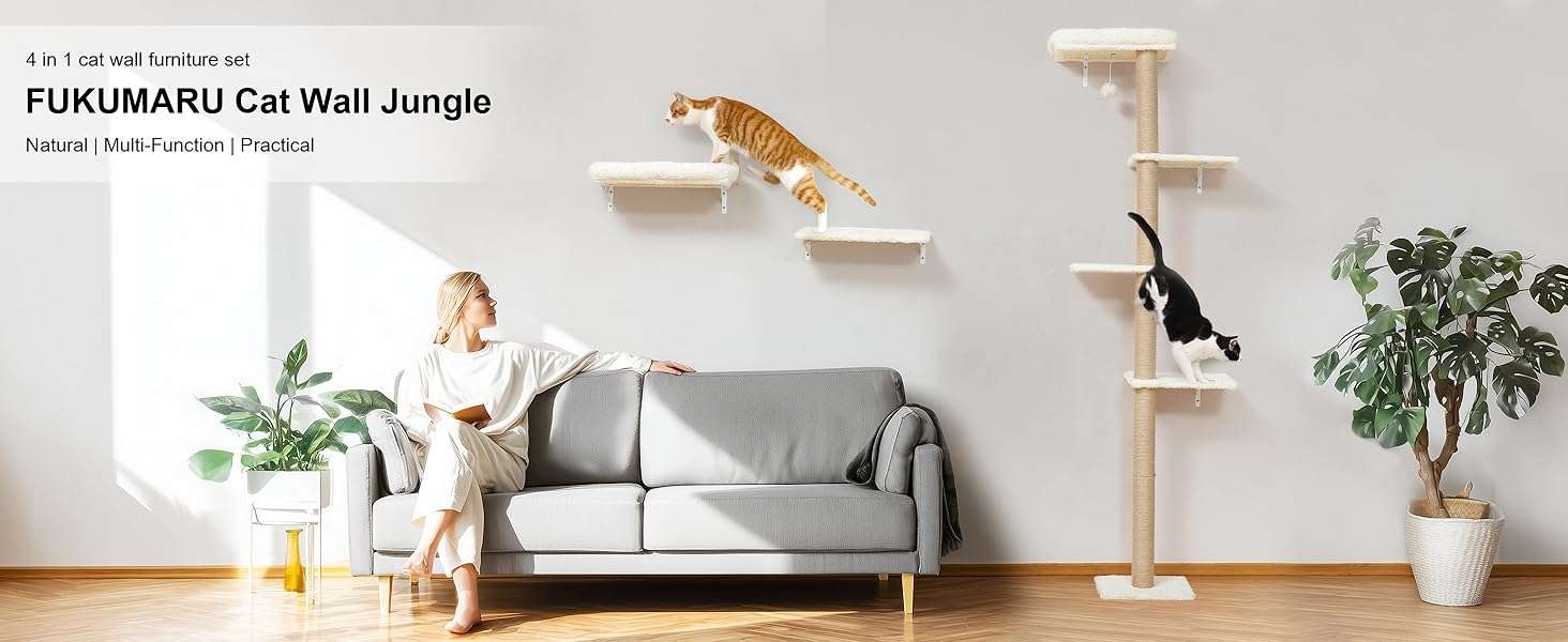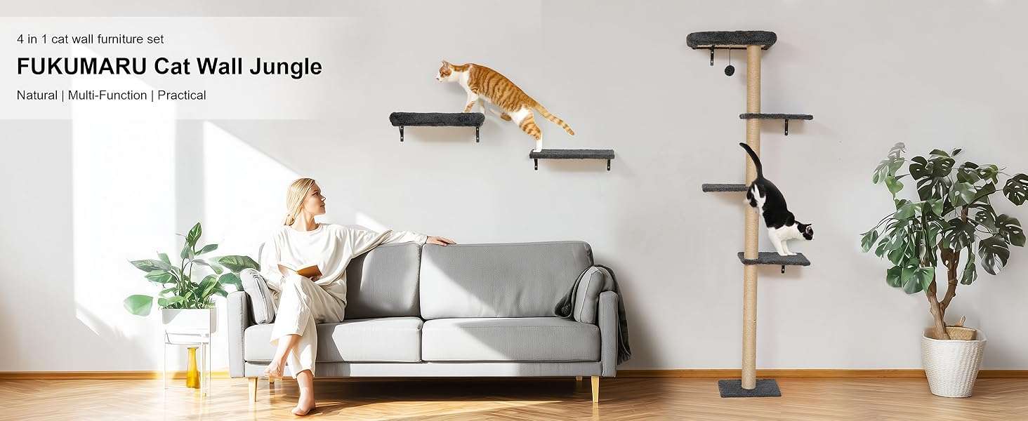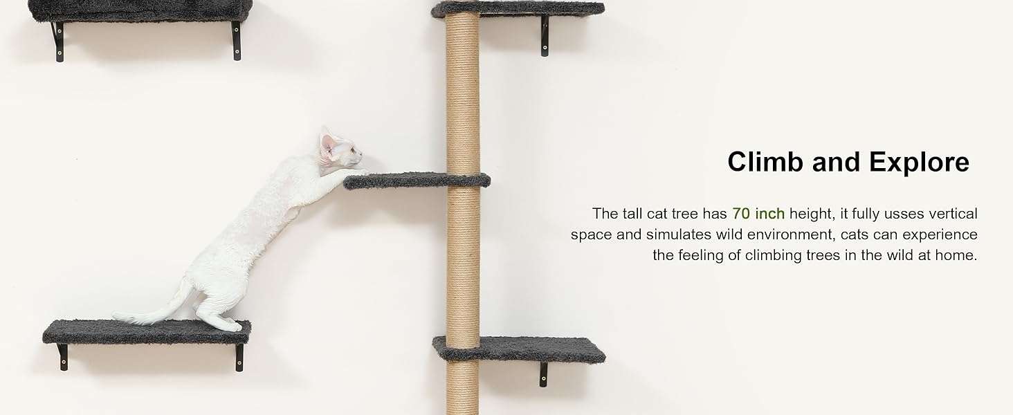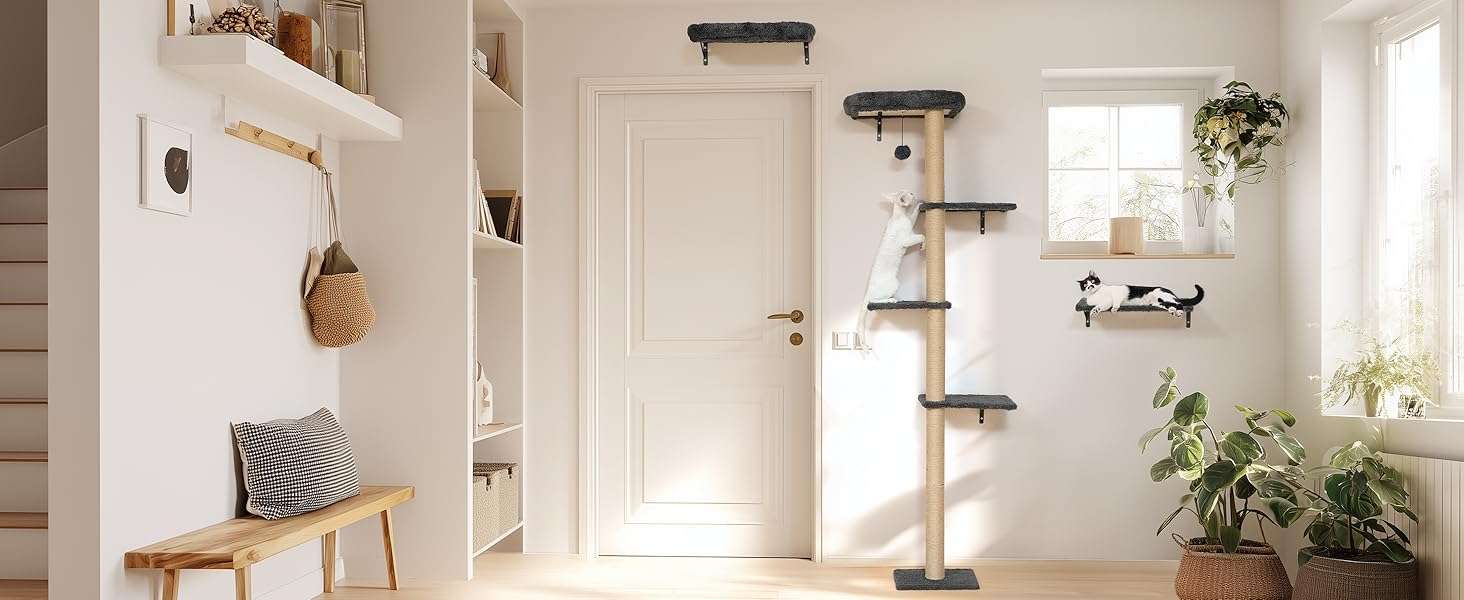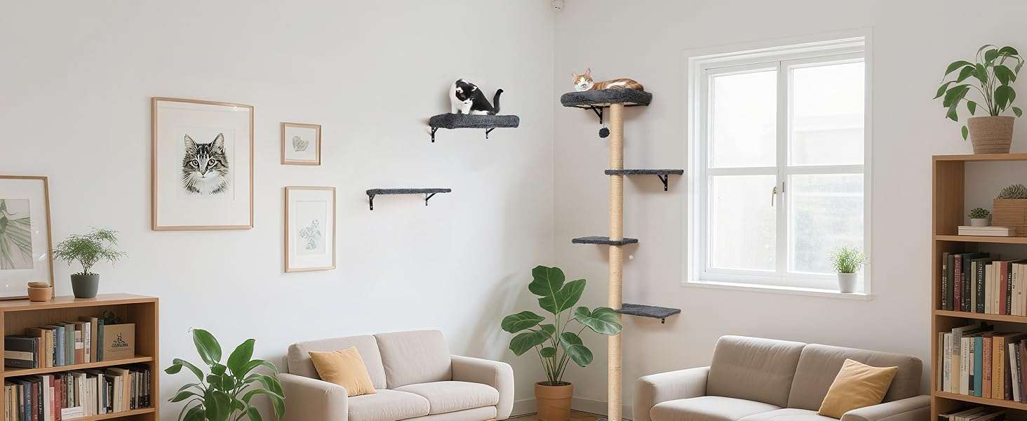 Set Todo en Uno con Cama y Rascador: El juego incluye una cama de pared, un arbol rascador mural y estantes. Sus gatos pueden dormir, saltar, rascar y jugar en un solo lugar. Puede crear su propio gimnasio de jungla personalizado segun el espacio de su pared.
