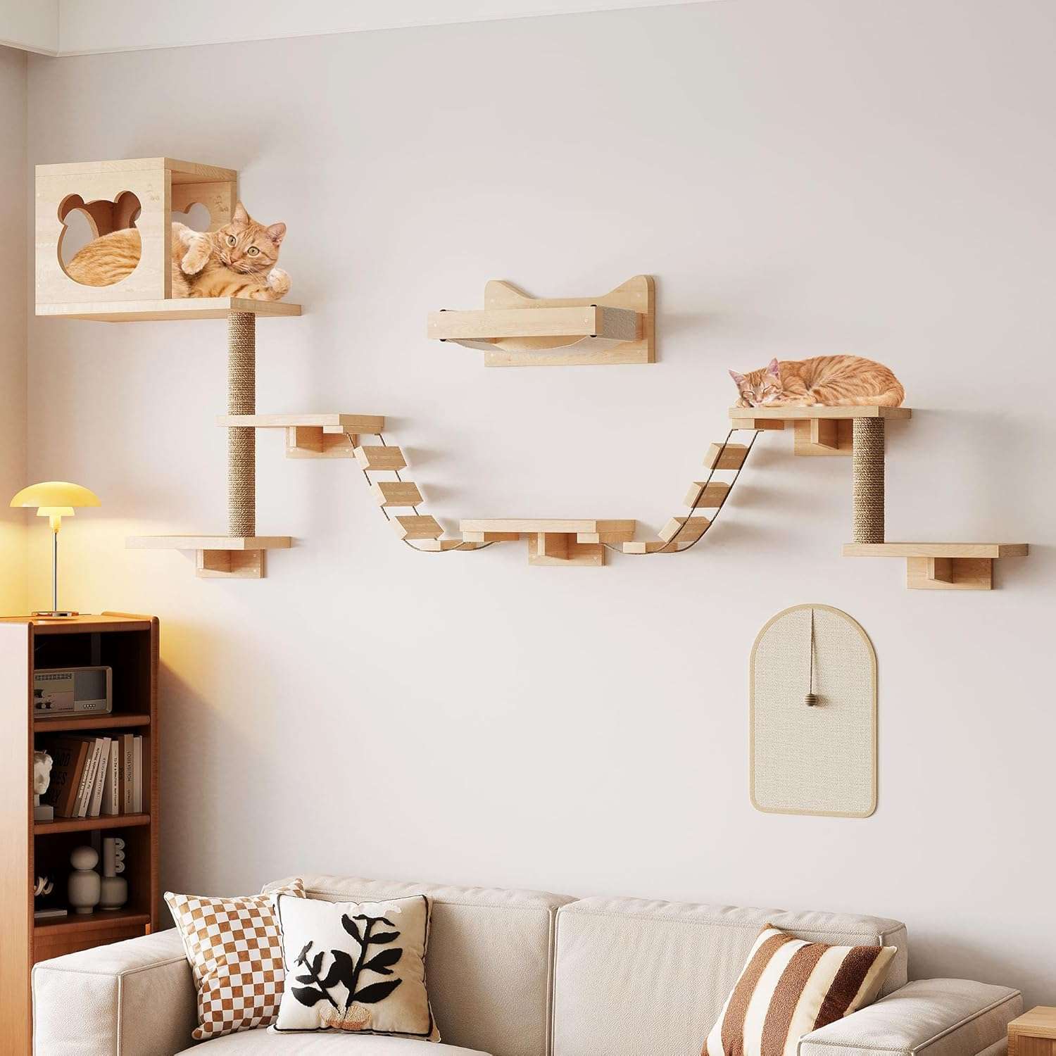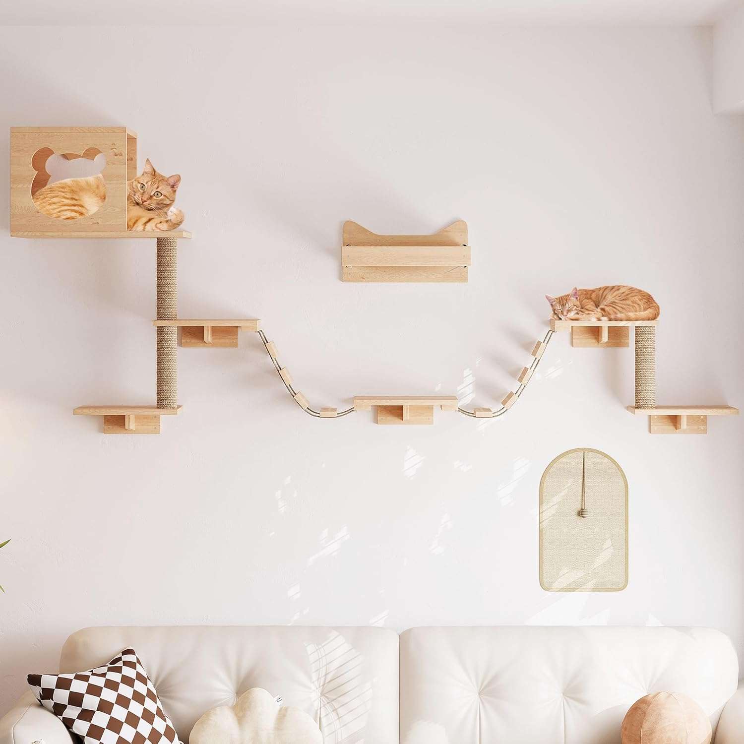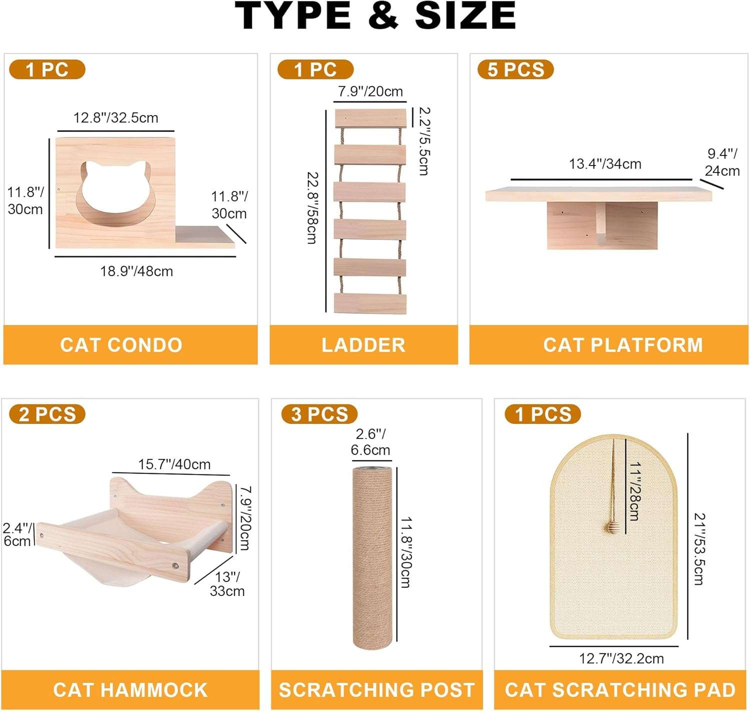 Gimnasio de Pared para Gatos Set 13 Piezas de Madera Pino Pintable con Rascador y Escalera.
