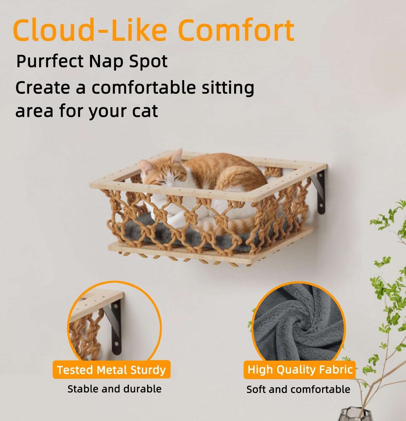 Set Completo 5 en 1 para Diversion Total: Este kit incluye 5 piezas esenciales para armar un gimnasio perfecto en su pared. Combina estantes de escalada y una cesta de descanso, creando un circuito dinamico que satisface todas las necesidades de movimiento y relax de su mascota en un solo producto.