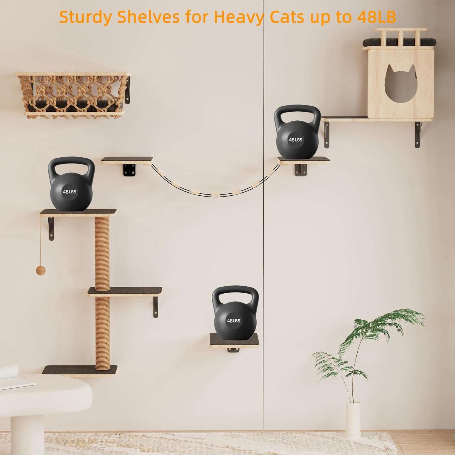 Gimnasio de Pared para Gatos Set 5 en 1 de Madera Solida con Cesta y Estantes Reforzados.
