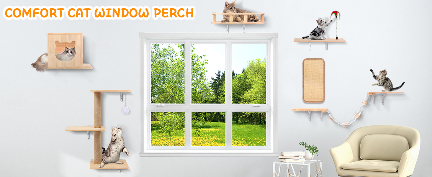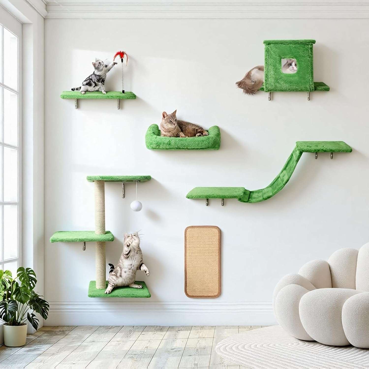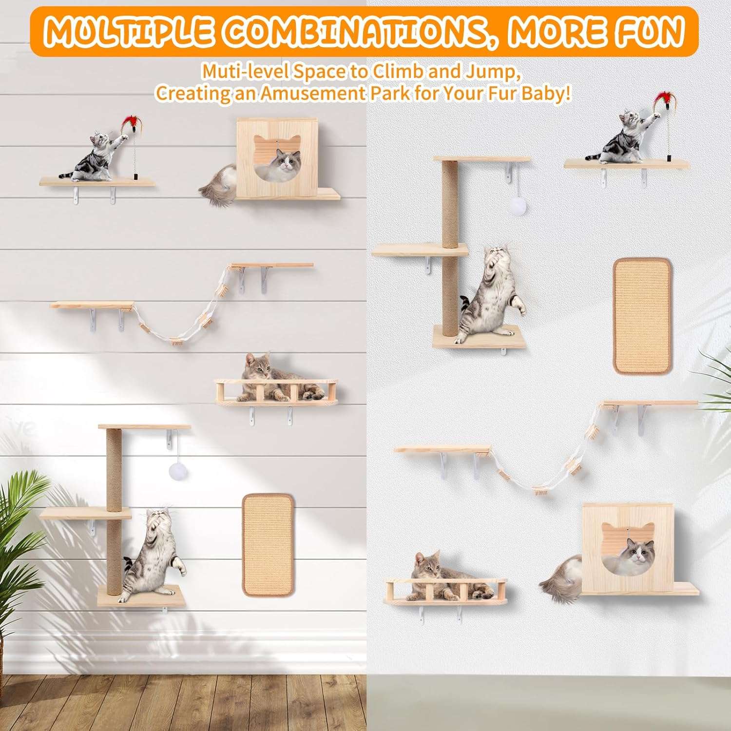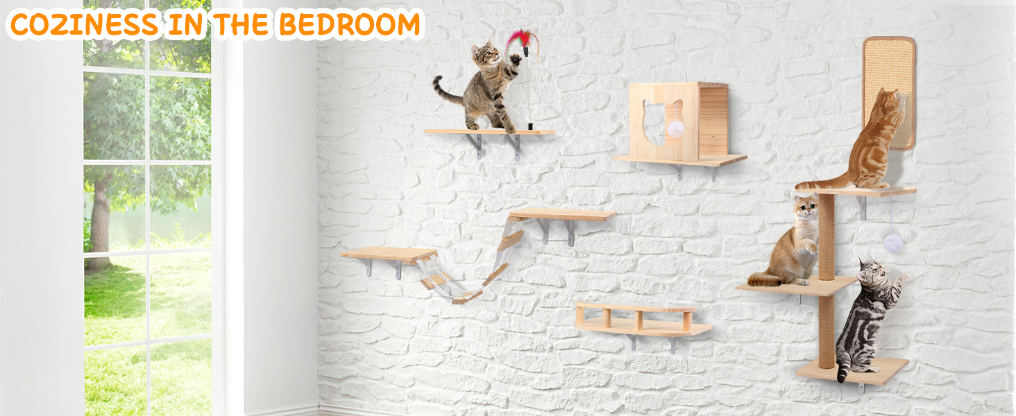 Gimnasio de Pared para Gatos Set 6 Piezas: Puente, Casa y Rascador de Madera Solida.