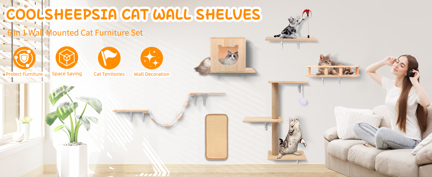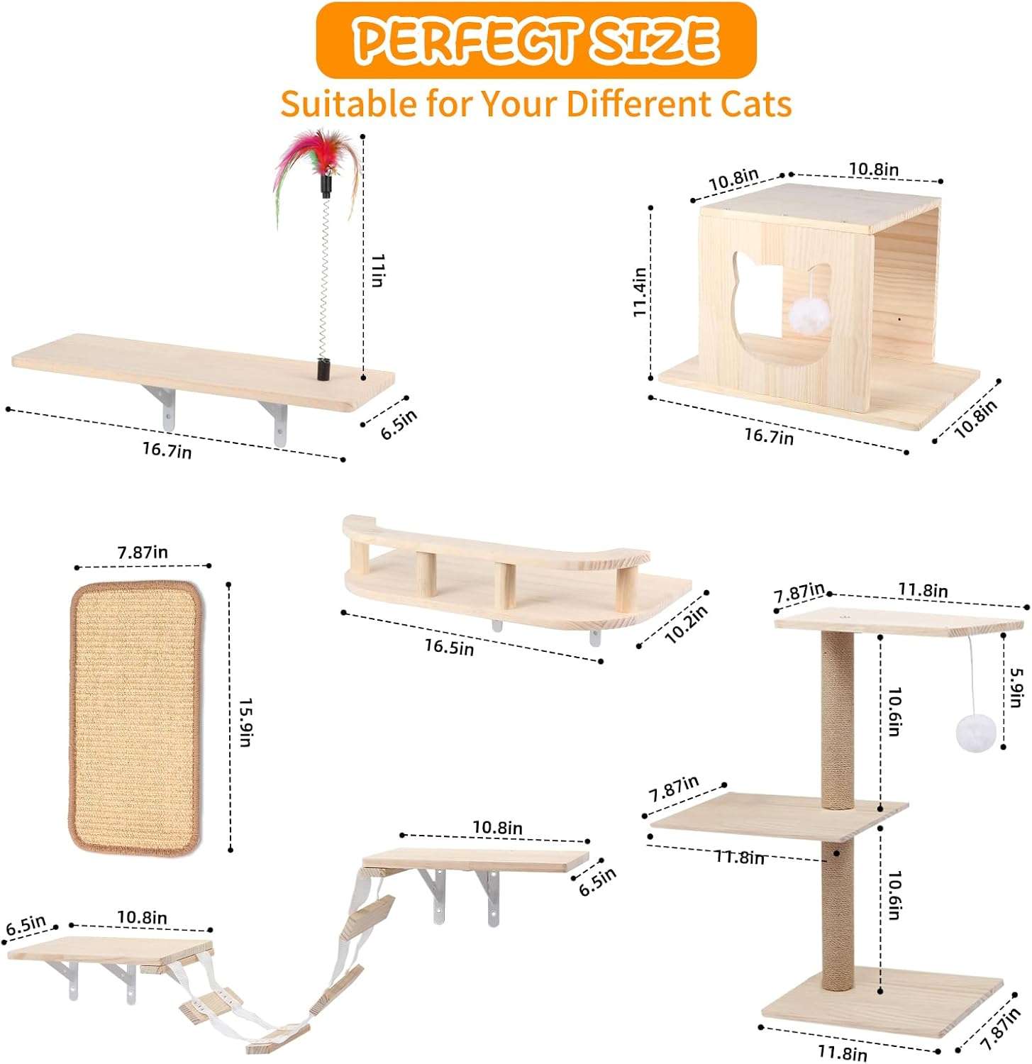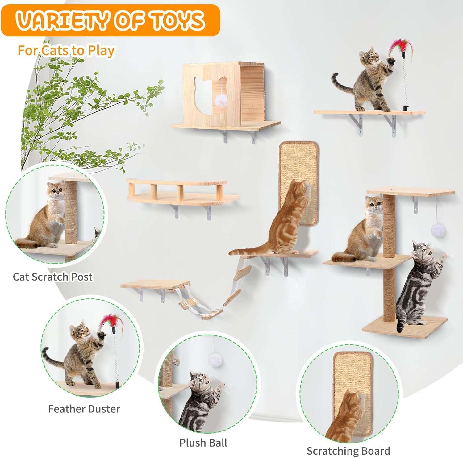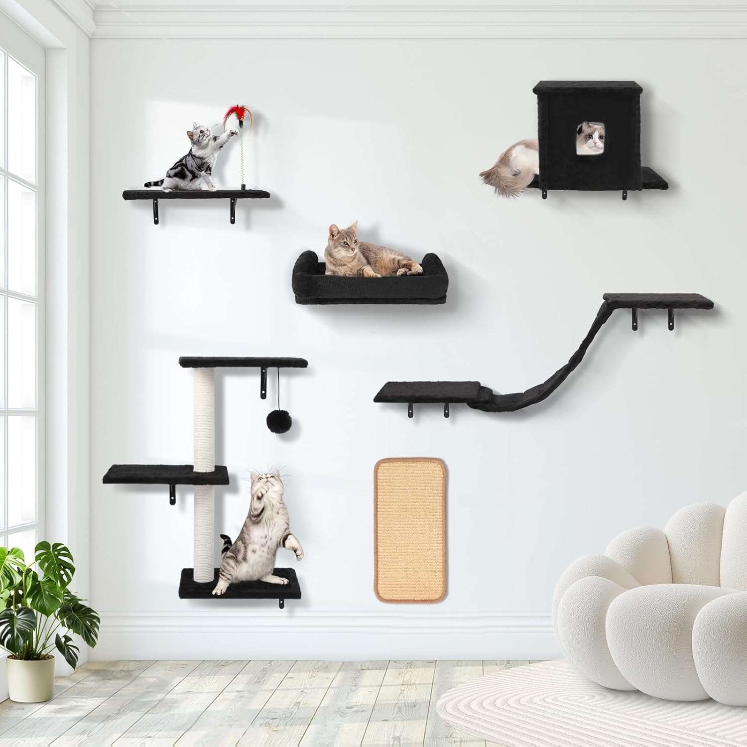 Gimnasio de Pared para Gatos Set 6 Piezas: Puente, Casa y Rascador de Madera Solida.