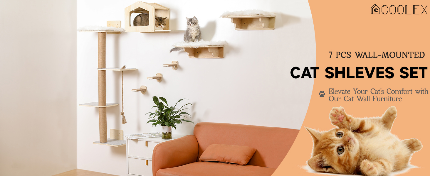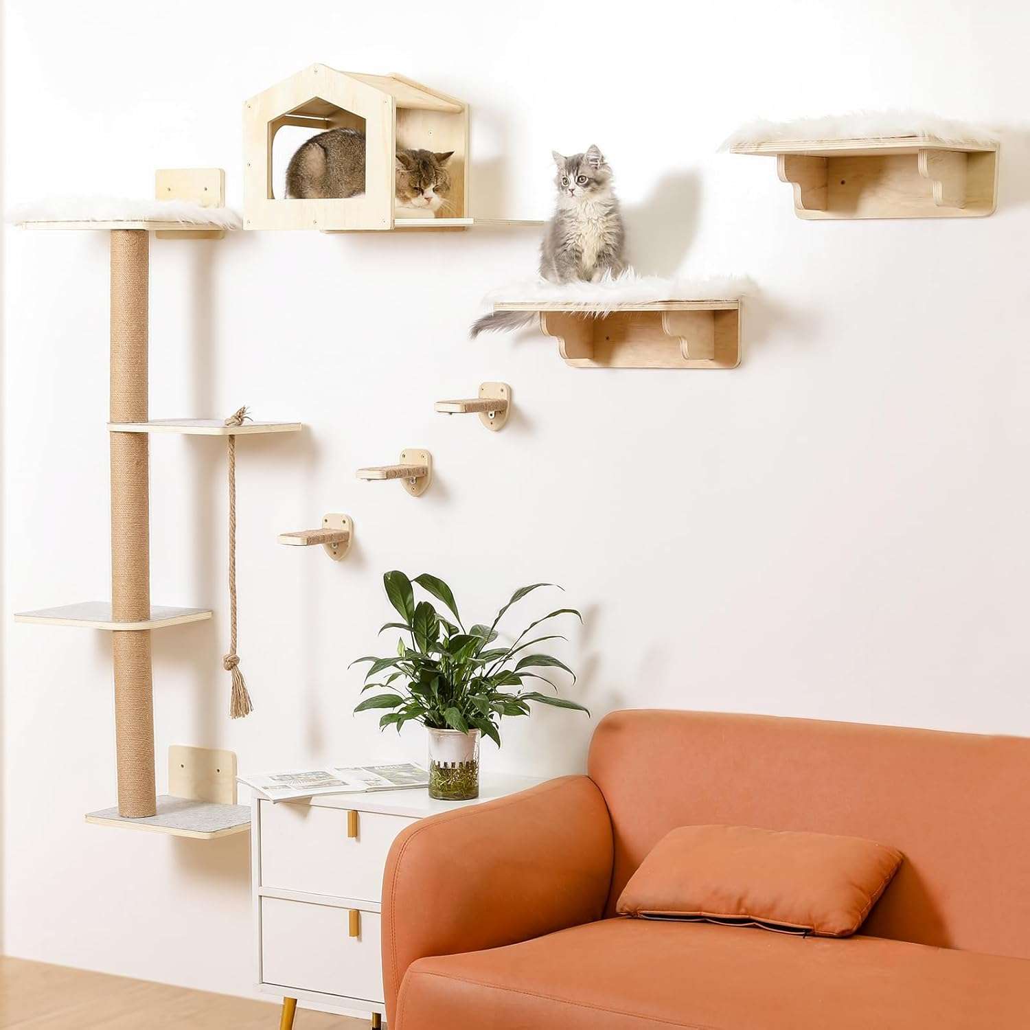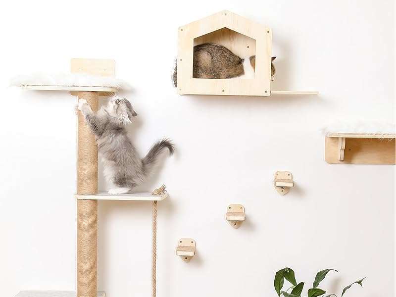 Instalación Flexible y Fácil: Usted decide el diseño. Puede organizar los estantes y escalones según el espacio de su pared y la capacidad de salto de su gato. El kit viene con tablas preperforadas y todos los accesorios necesarios para una instalación sin complicaciones, mezclándose perfectamente con la decoración de su hogar.