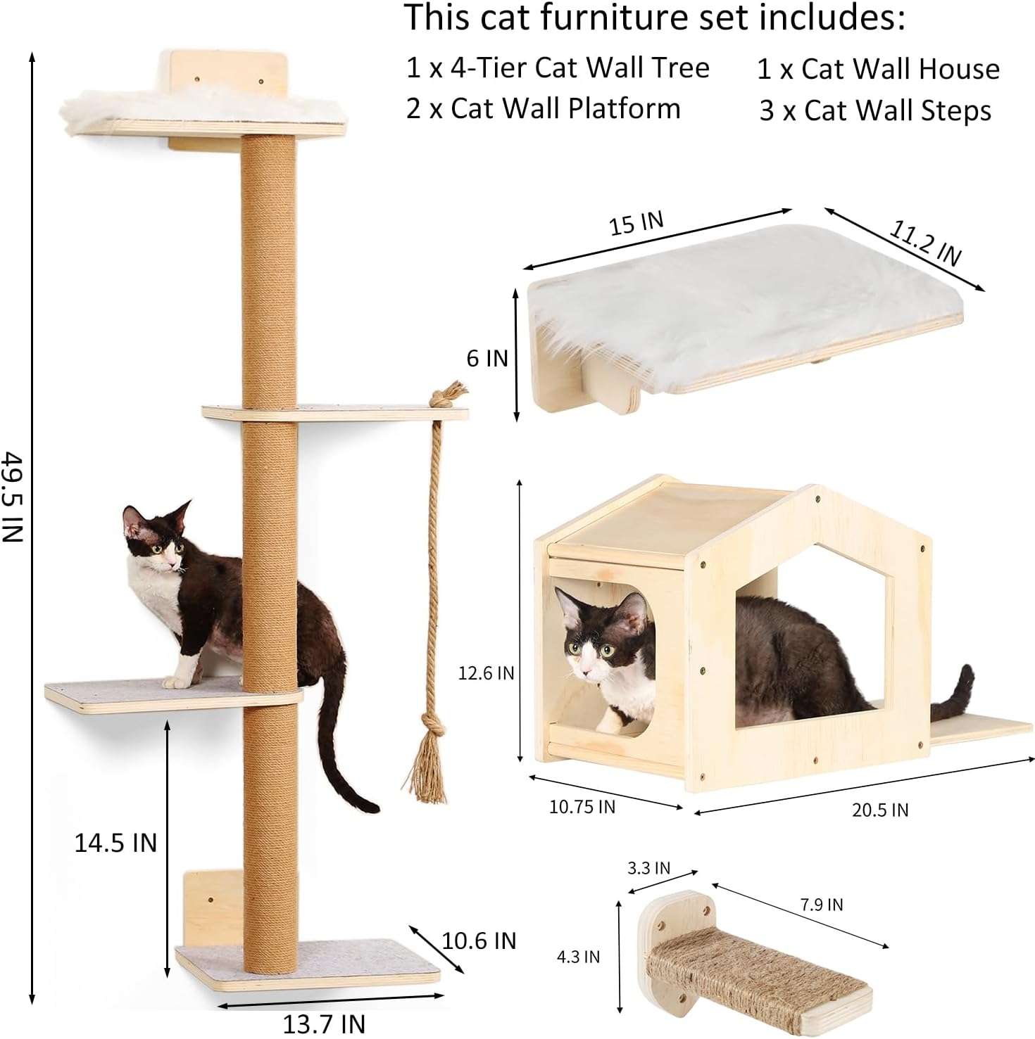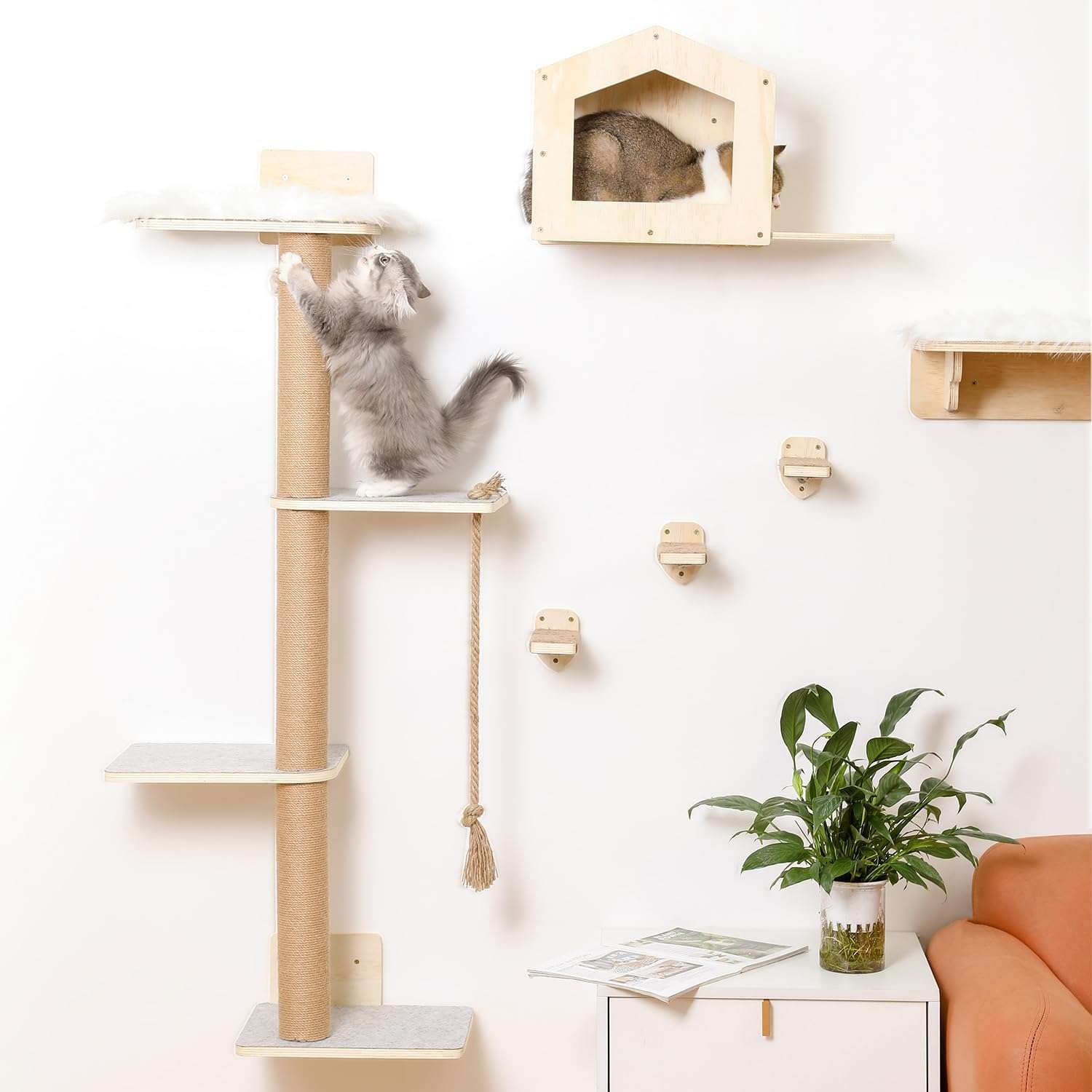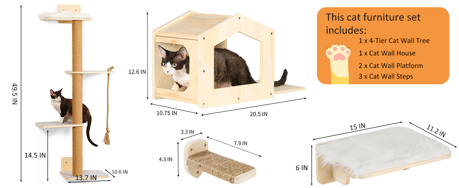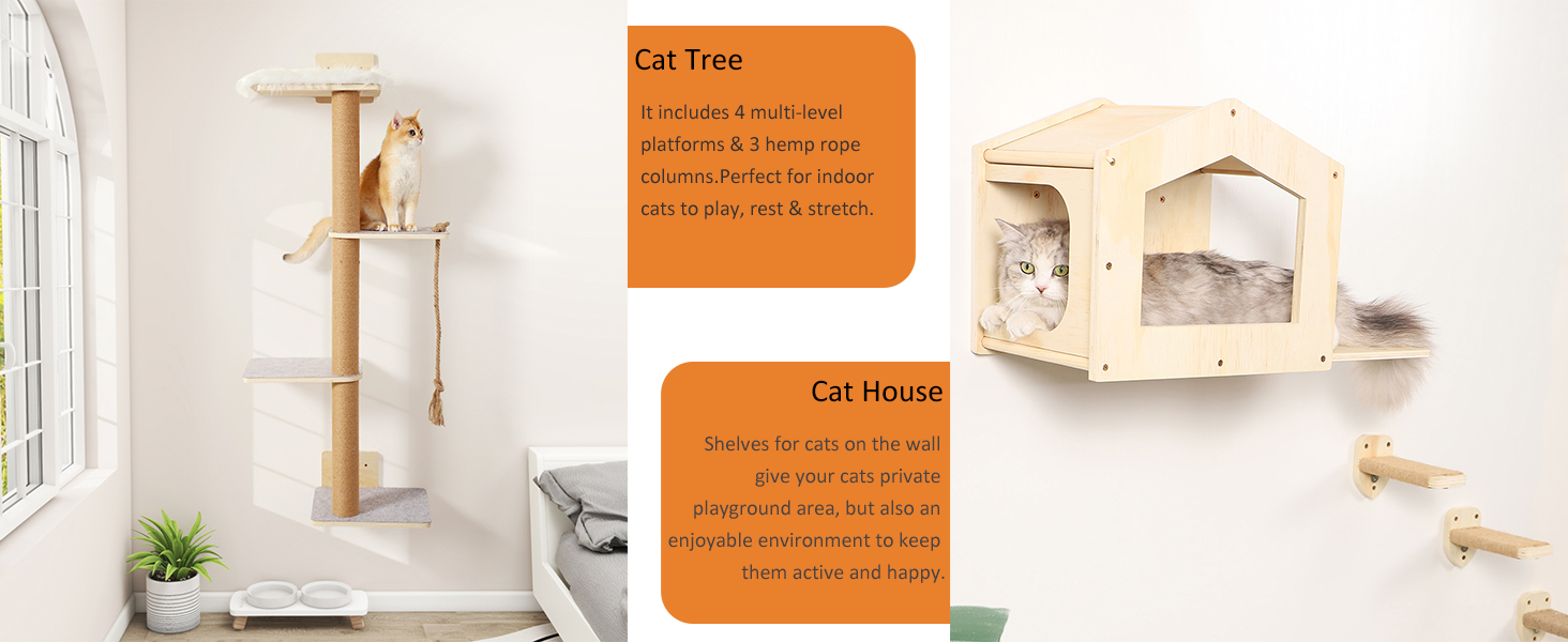 Gimnasio de Pared para Gatos Set Completo: Arbol 4 Niveles, Casa y Escalones con Soportes Metalicos.