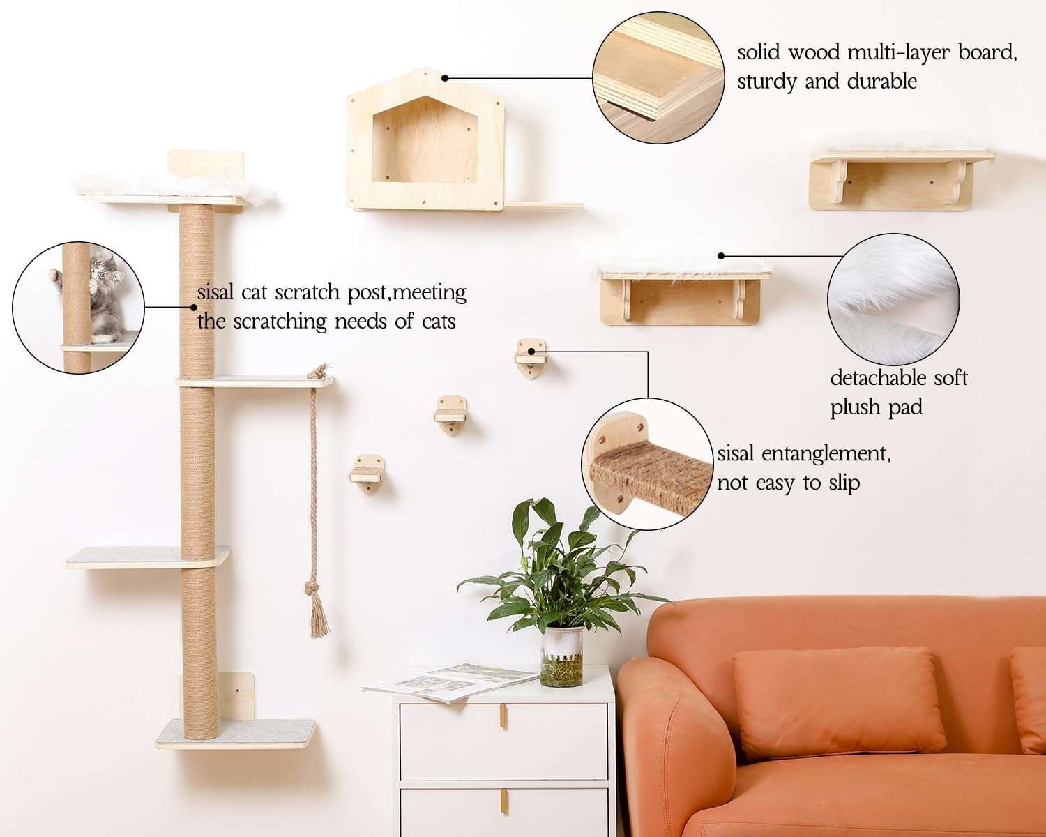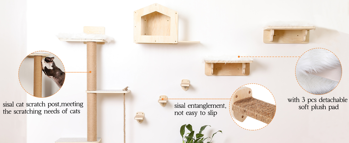 Robustez con Soportes Metálicos: La seguridad es lo primero. Cada pieza está hecha de madera resistente y cuenta con soportes de metal reforzados debajo de cada estante. Esto garantiza una capacidad de carga superior y una estabilidad total, permitiendo que su gato salte con confianza. Además, incluye almohadillas de felpa suave desmontables para mayor comodidad e higiene.