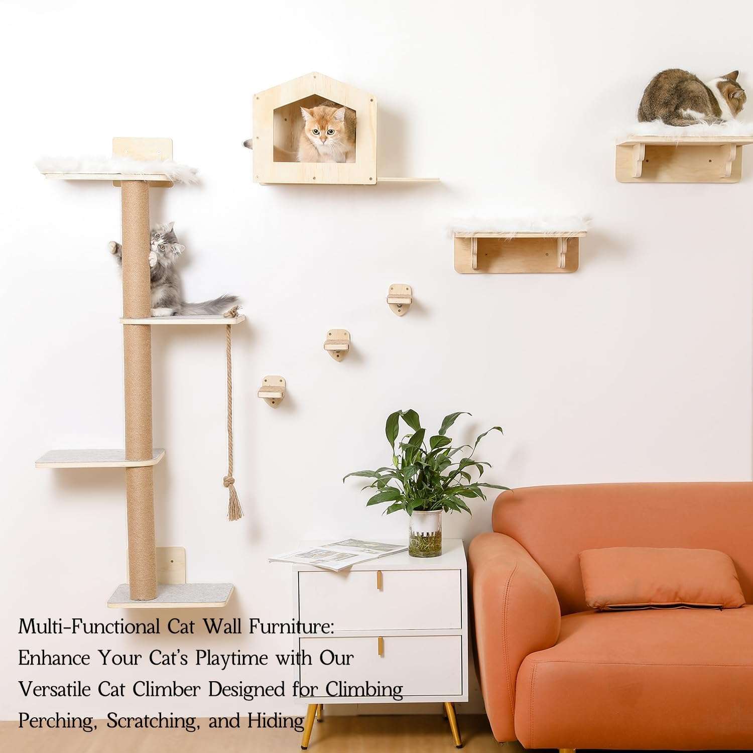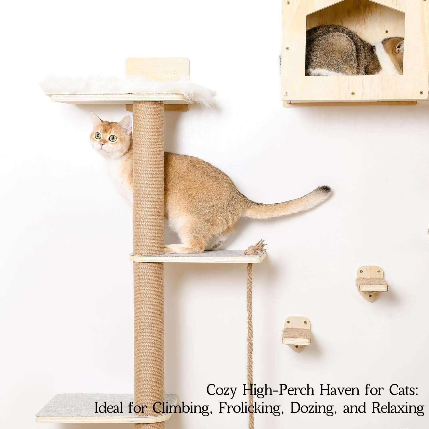 Diseño Multifuncional Completo: Este no es solo un mueble, es una suite completa. Incluye un árbol rascador de pared de 4 niveles, una casa refugio privada, 2 perchas de descanso y 3 escalones forrados con cuerda de yute. Ofrece el espacio perfecto para que sus mascotas descansen, salten, arañen y se diviertan en un solo lugar.