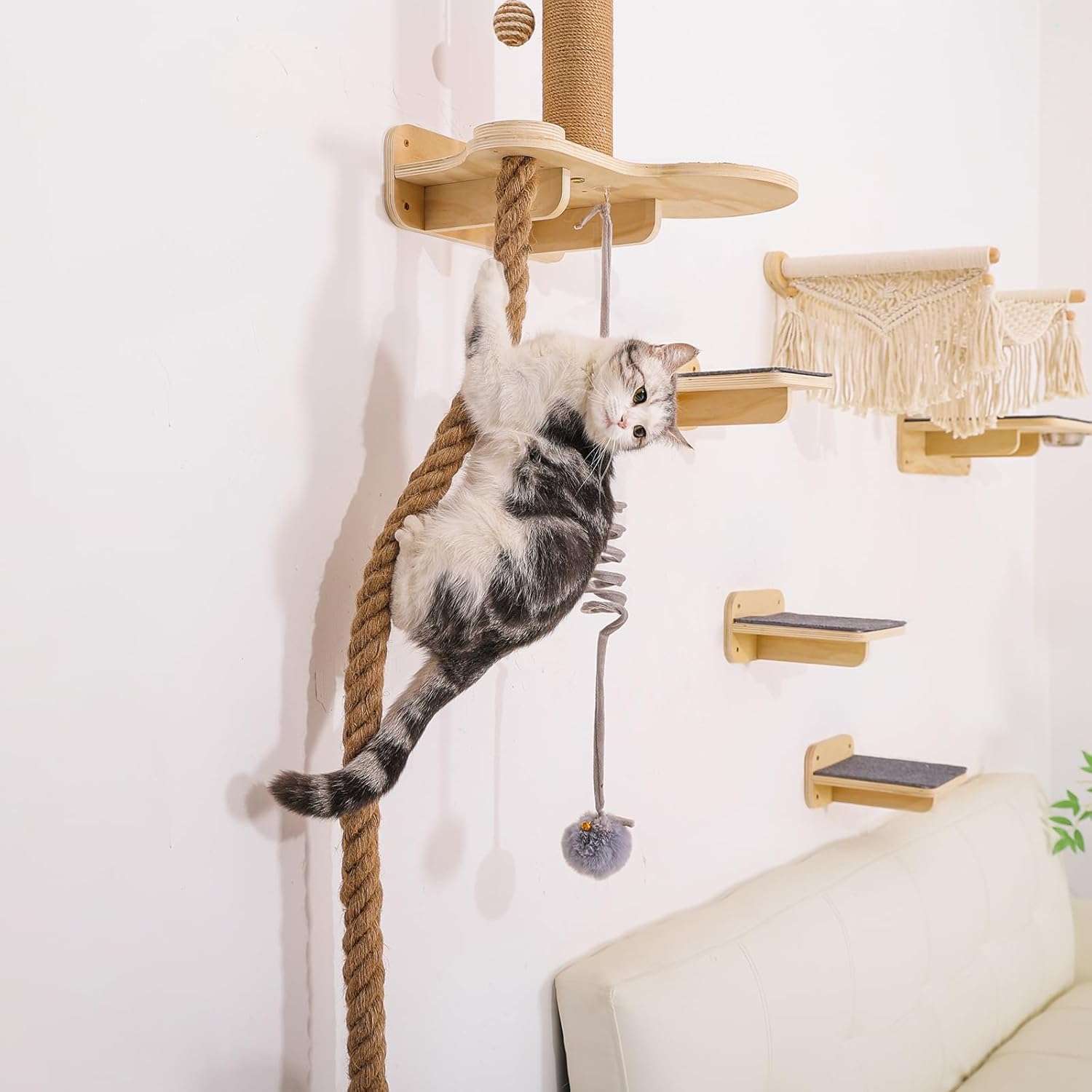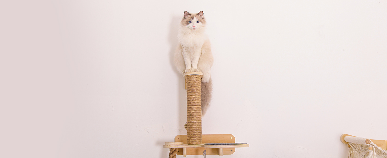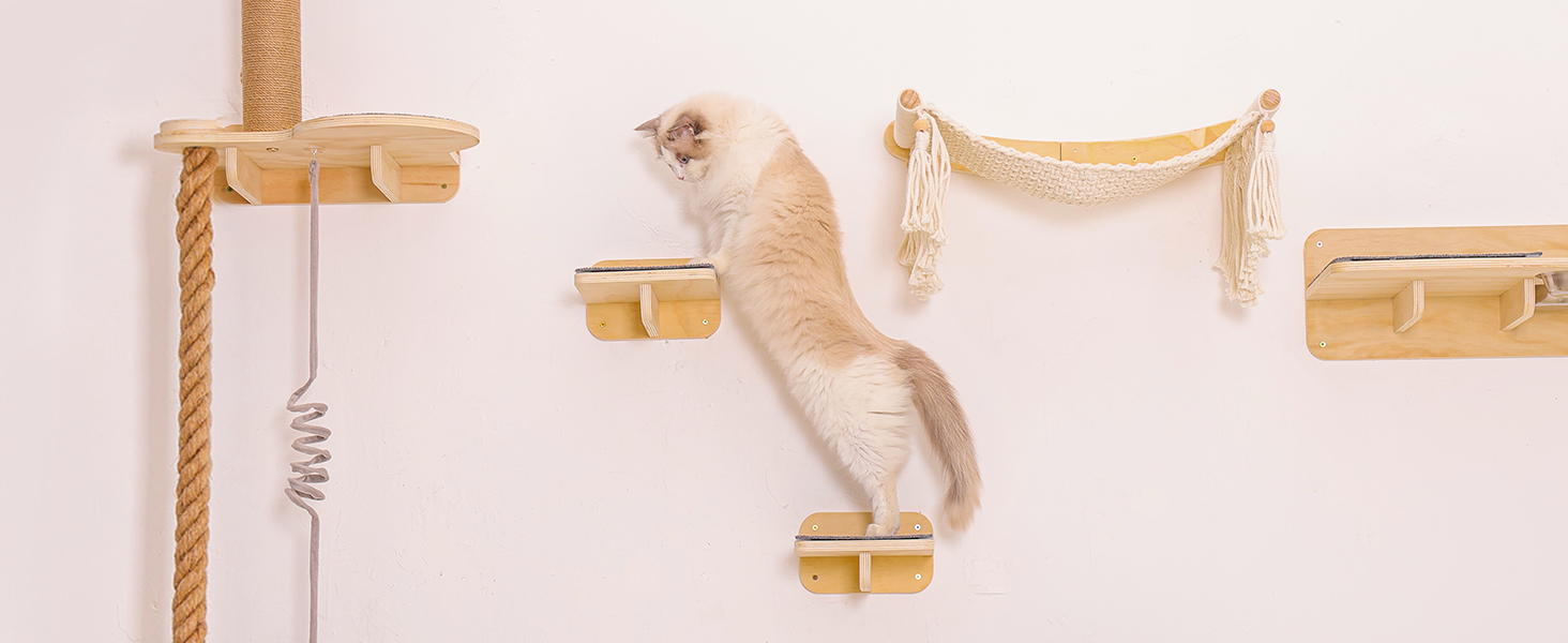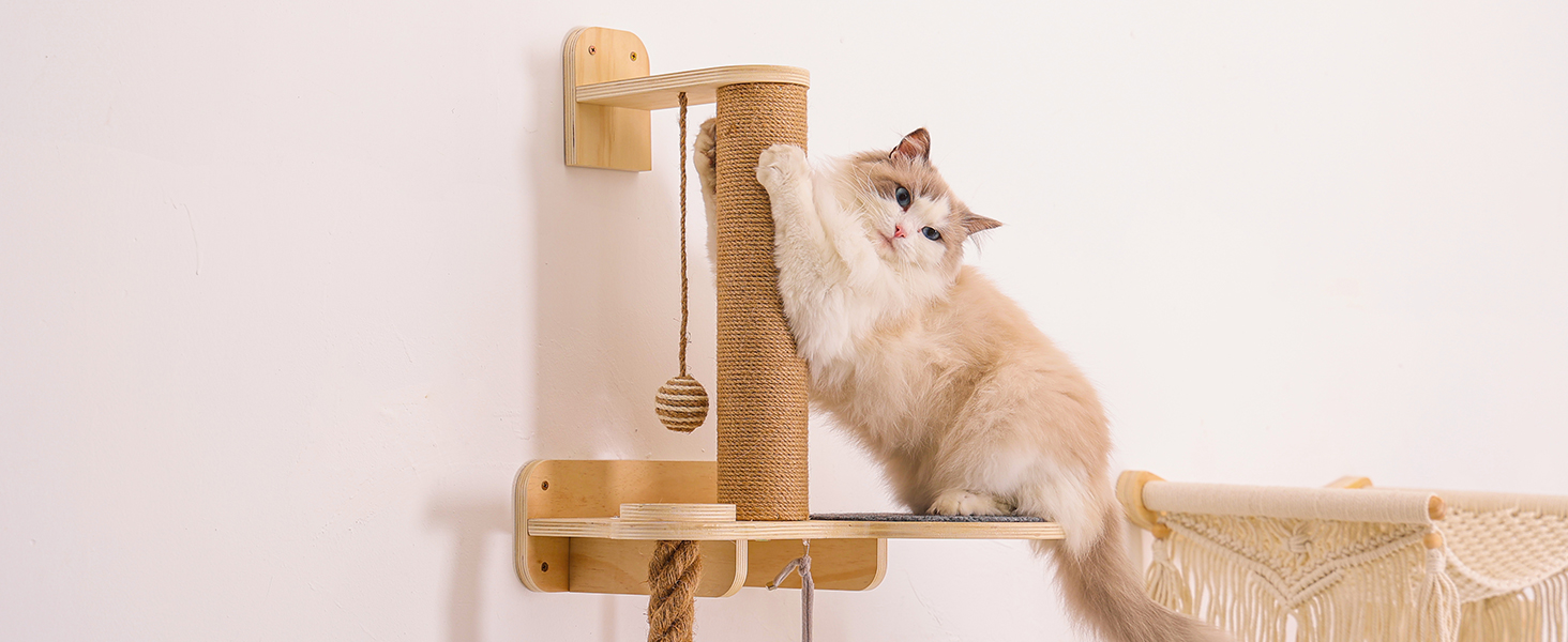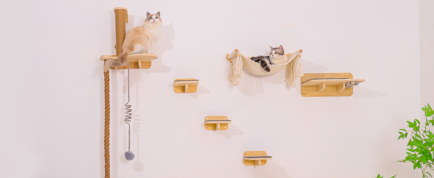Habitat Todo en Uno con Comedero: Mas que simples repisas, es un centro de vida completo. El set incluye una torre rascadora resistente, una acogedora cama trenzada de cuerda de algodon, una estacion de juguetes colgantes y una bandeja desmontable para el plato de comida. Su gato puede saltar, dormir, jugar, comer y marcar territorio en un solo lugar.