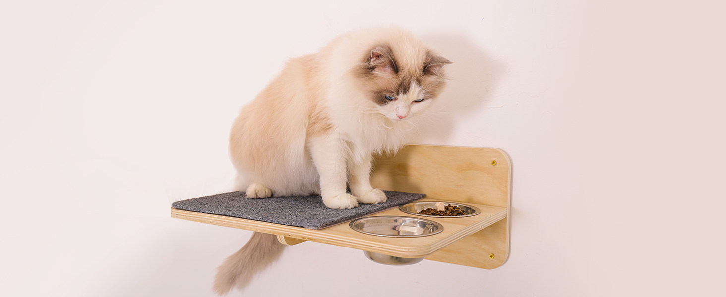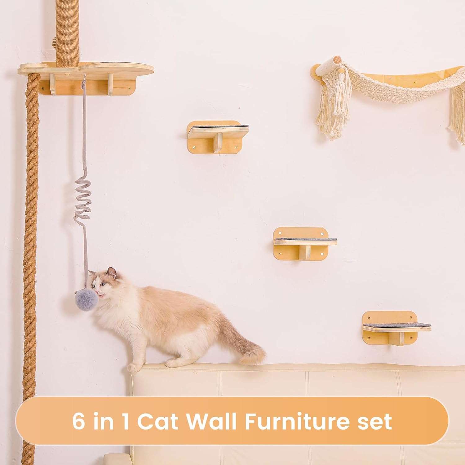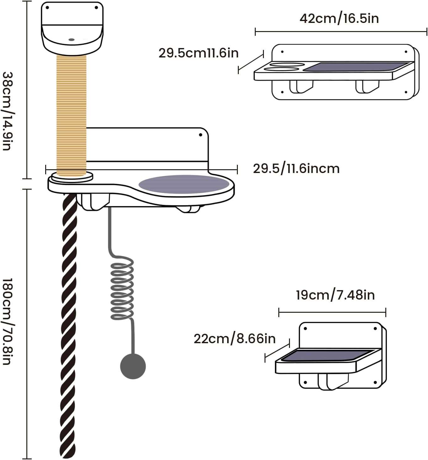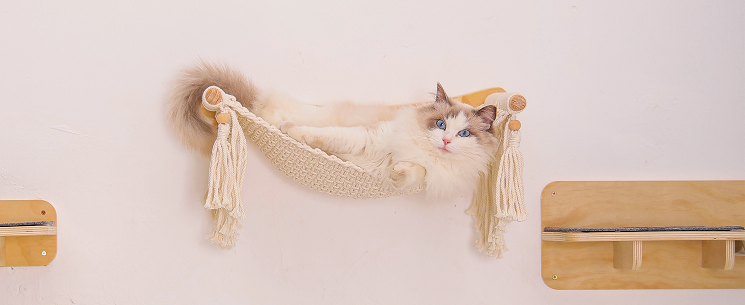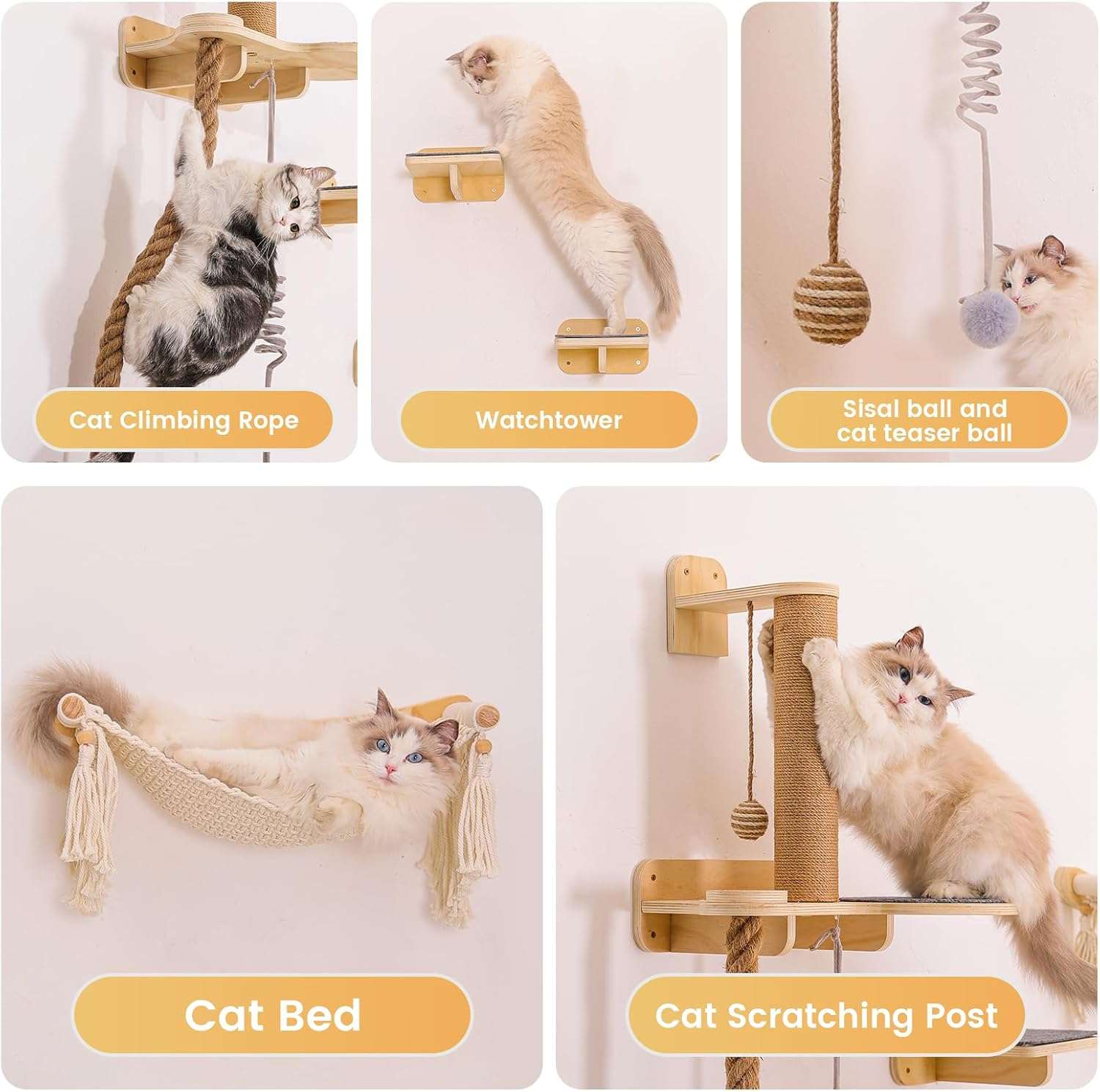 Habitat Todo en Uno con Comedero: Mas que simples repisas, es un centro de vida completo. El set incluye una torre rascadora resistente, una acogedora cama trenzada de cuerda de algodon, una estacion de juguetes colgantes y una bandeja desmontable para el plato de comida. Su gato puede saltar, dormir, jugar, comer y marcar territorio en un solo lugar.