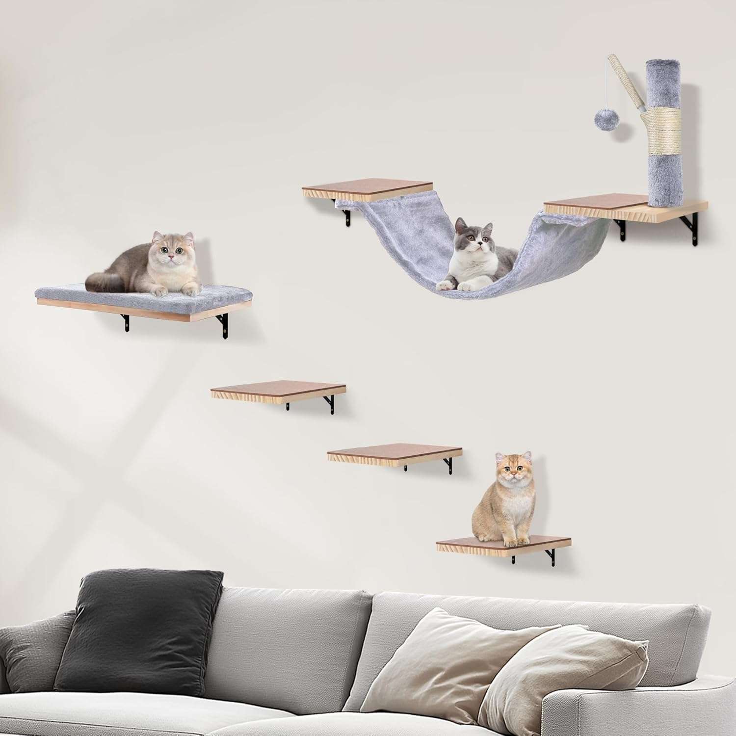 Gimnasio de Pared para Gatos Set Completo: Madera Pino, Hamaca, Sofa y Rascador.