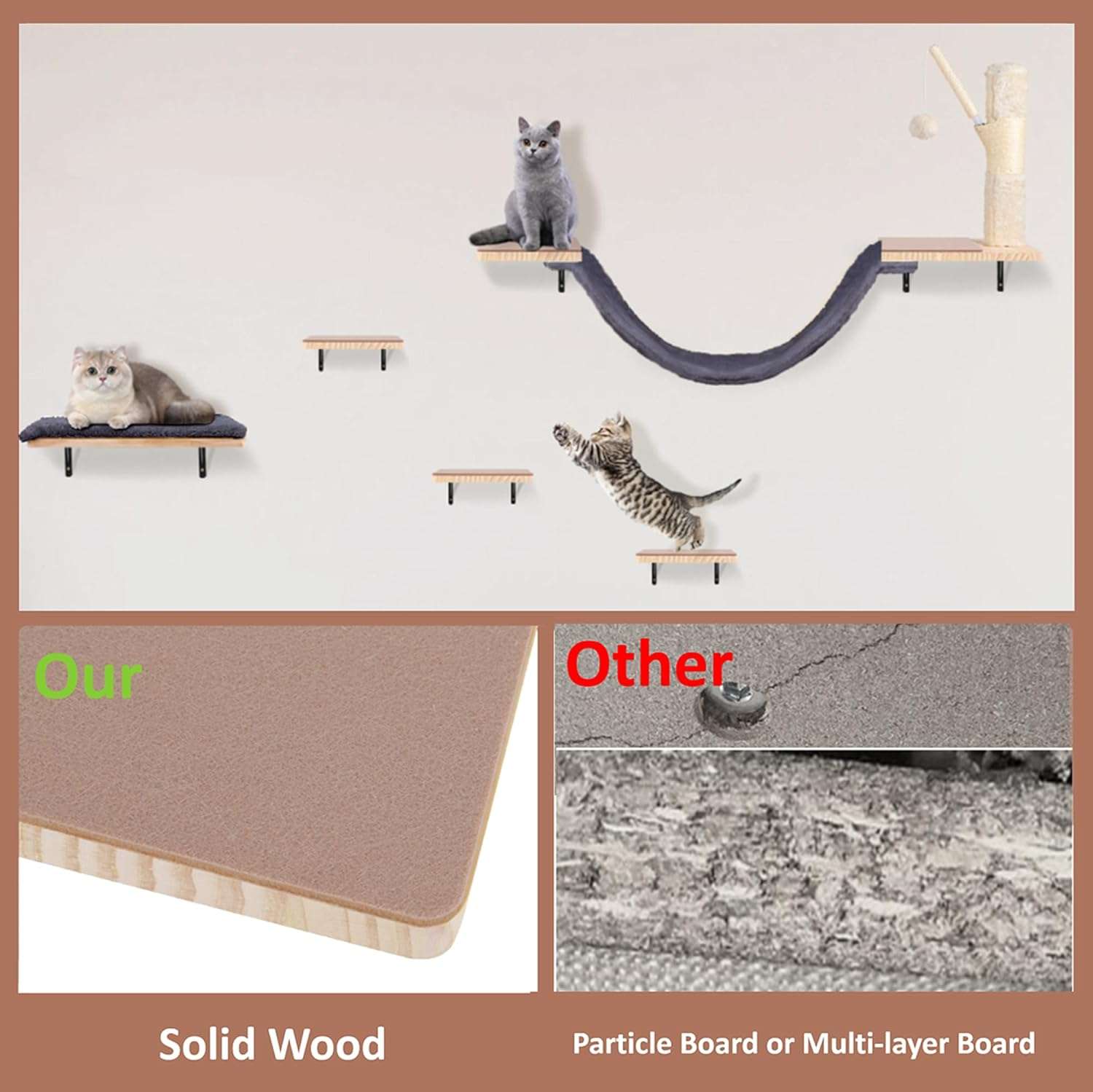 Seguridad y Calidad en Madera de Pino: Fabricado con tablas de pino gruesas y soportes extendidos para una estabilidad superior. Incluye almohadillas de fieltro antideslizantes en las superficies, lo que evita que los gatos se resbalen durante el juego y garantiza su seguridad en cada salto.
