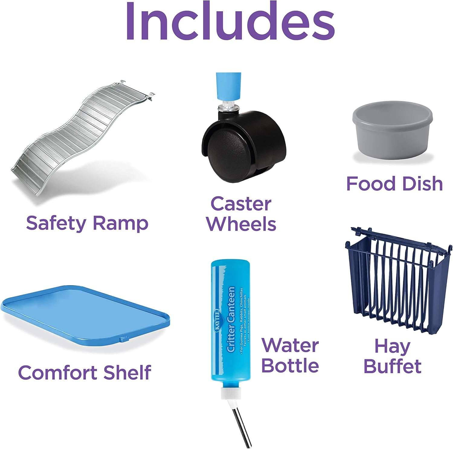 Alimentación e Hidratación: Viene con una botella de agua (bebedero), un plato de comida (comedero) y un buffet de heno (henero) para mantener el alimento limpio y accesible.