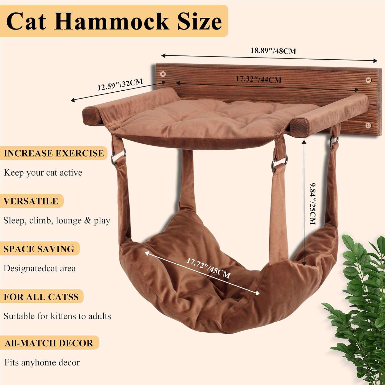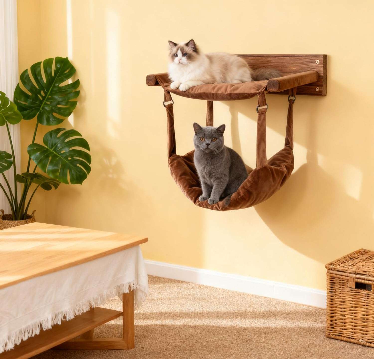 Hamaca de Pared para Gatos de Madera Pino (48x32x30 cm): Soporta 23 Kilos y Tela Lavable.