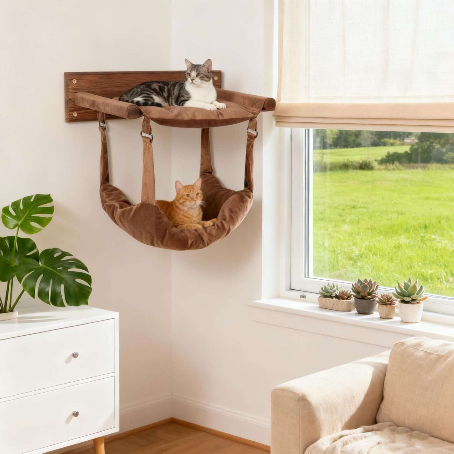 Esta hamaca mural es la solucion mas robusta del mercado para el descanso de sus mascotas. Diseñada con madera de pino maciza, ofrece seguridad total para gatos grandes o multiples felinos sin ocupar espacio en el suelo.