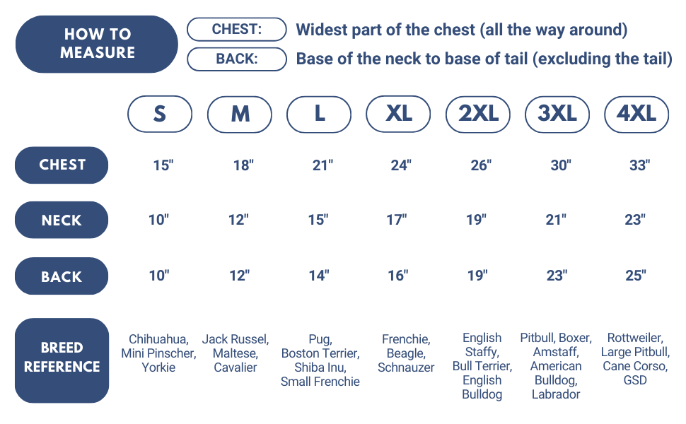 Instrucciones: La medida más importante es el CONTORNO DE PECHO. Mide la parte más ancha detrás de las patas delanteras.
