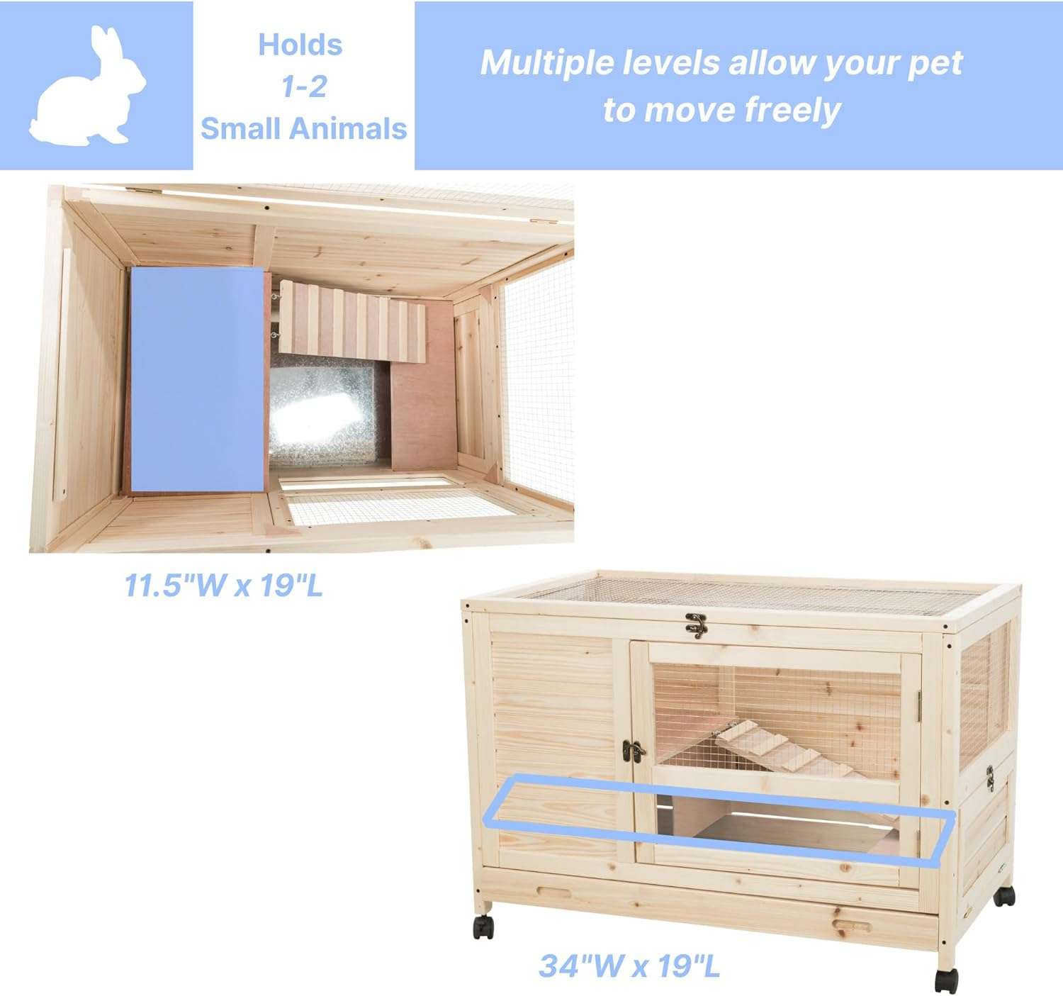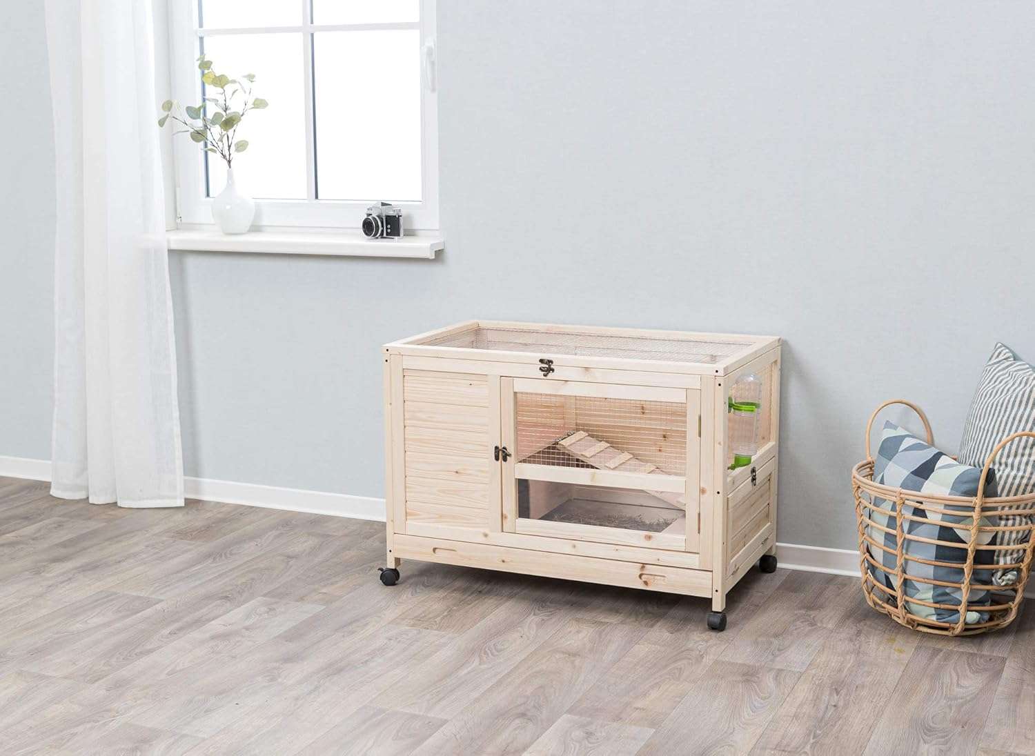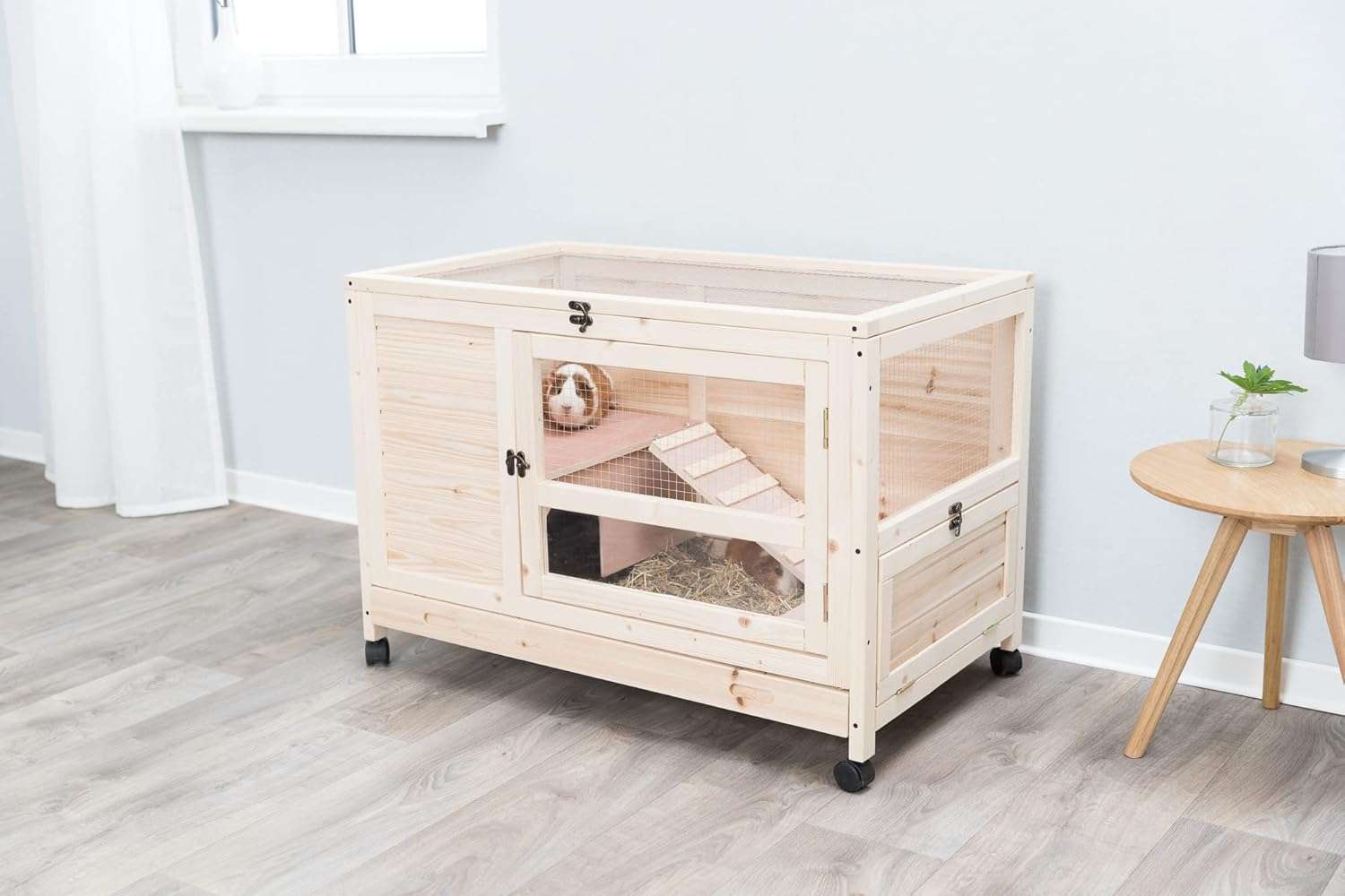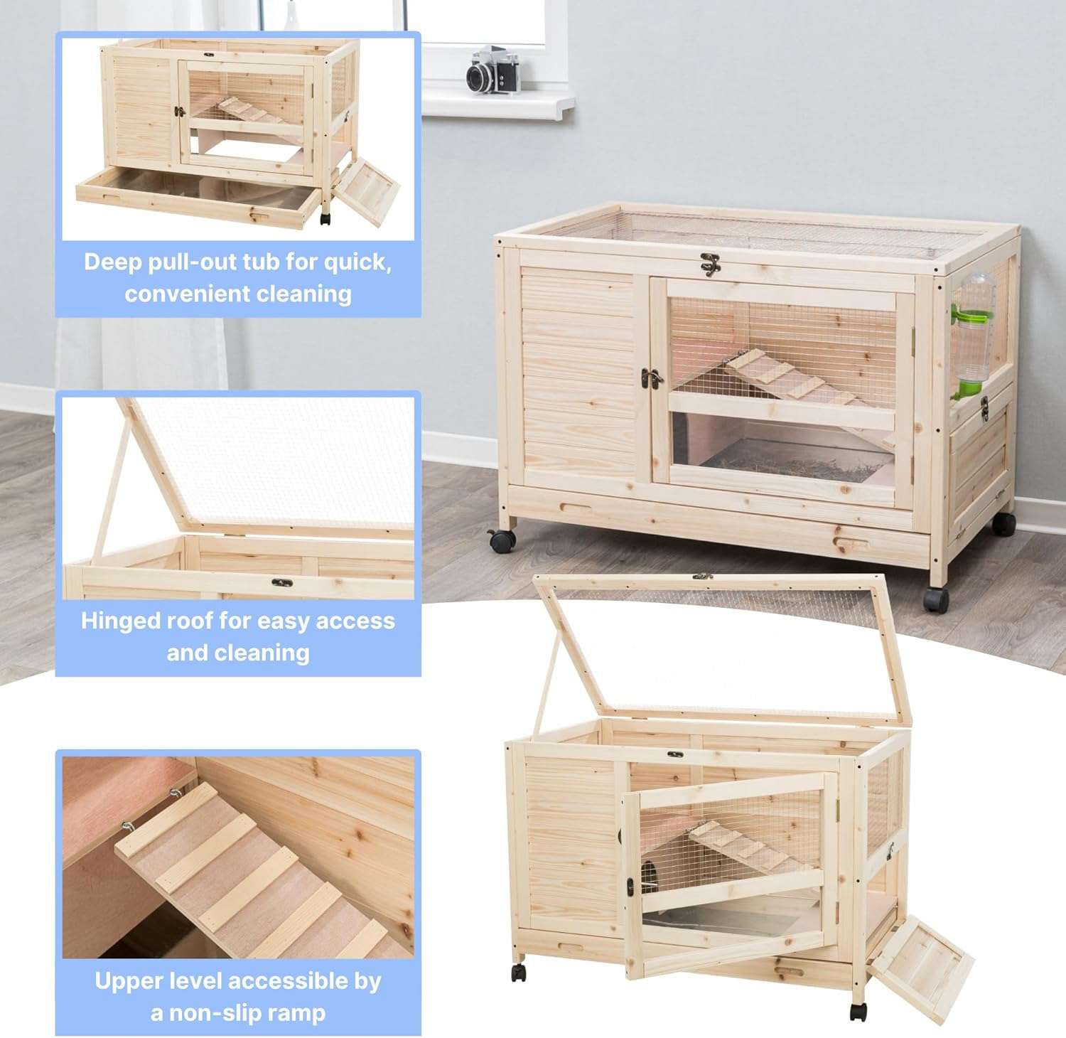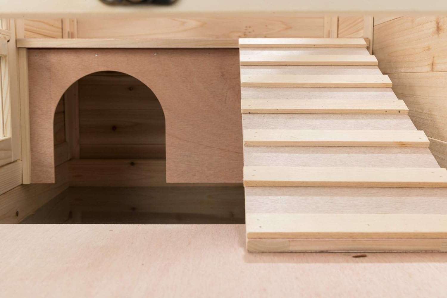 Diseñada para la vida cómoda de una mascota o una raza pequeña de conejillos de indias (cuyes) o conejos. Este corral de 2 pisos () incluye una rampa que conecta ambos niveles, fomentando el ejercicio y el juego en un ambiente seguro.