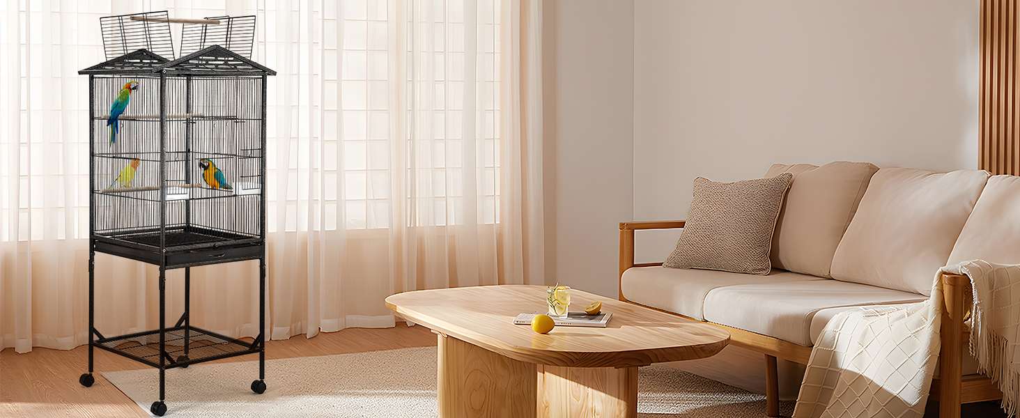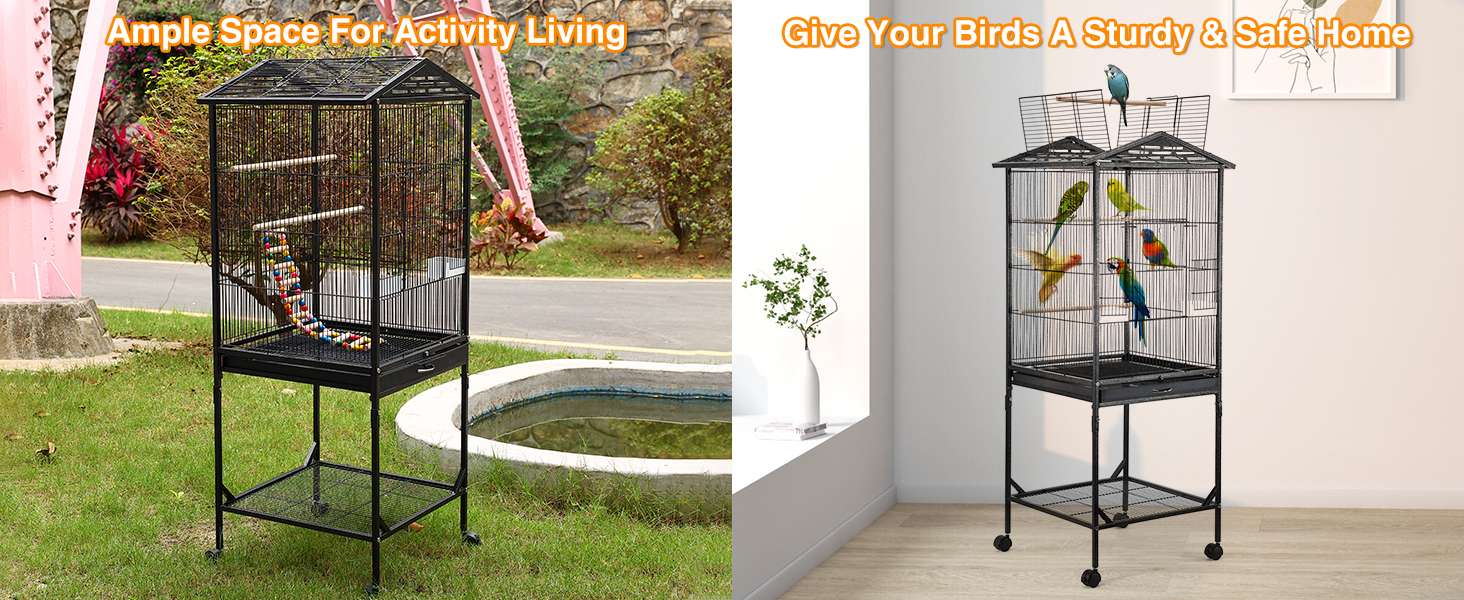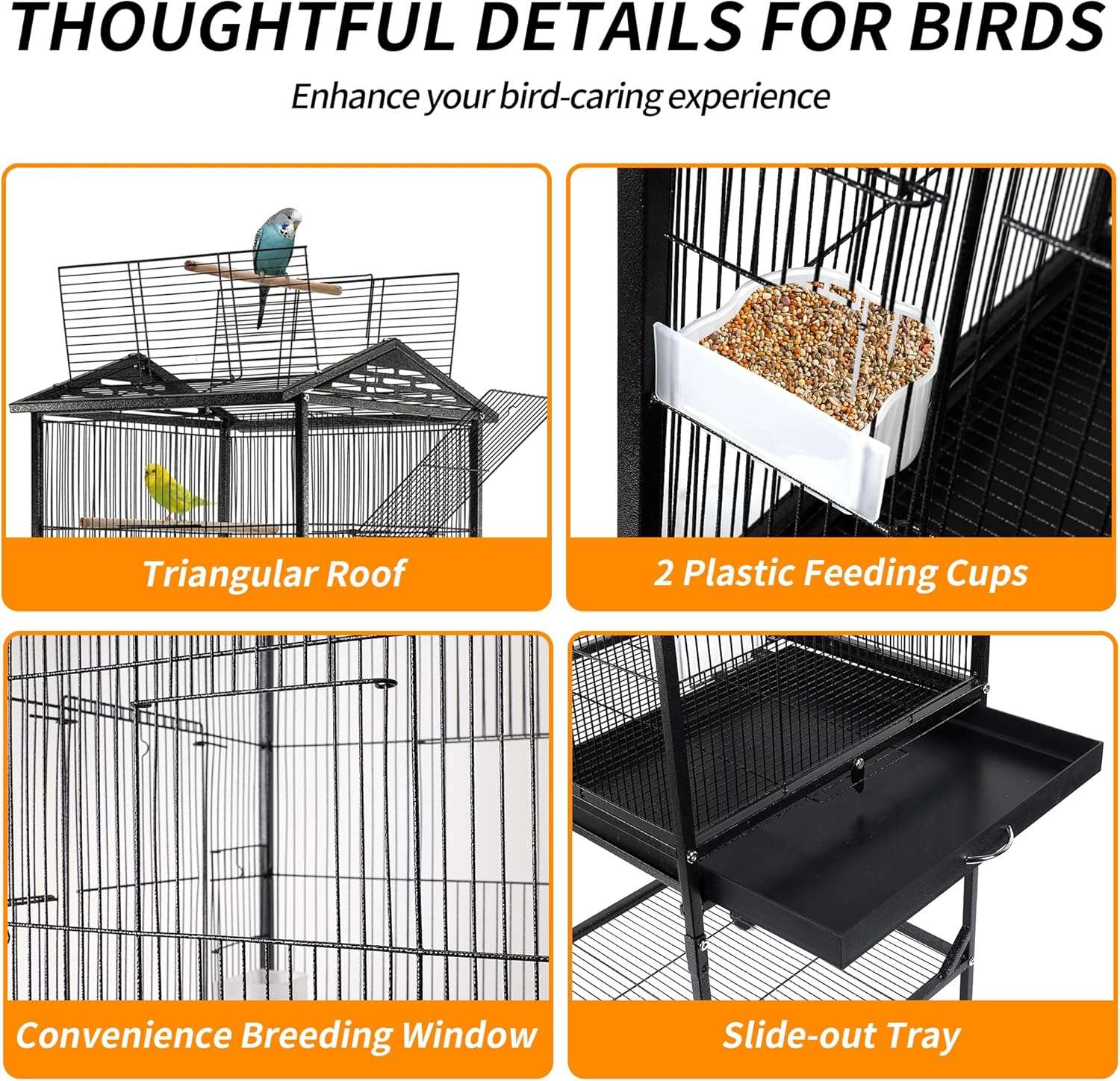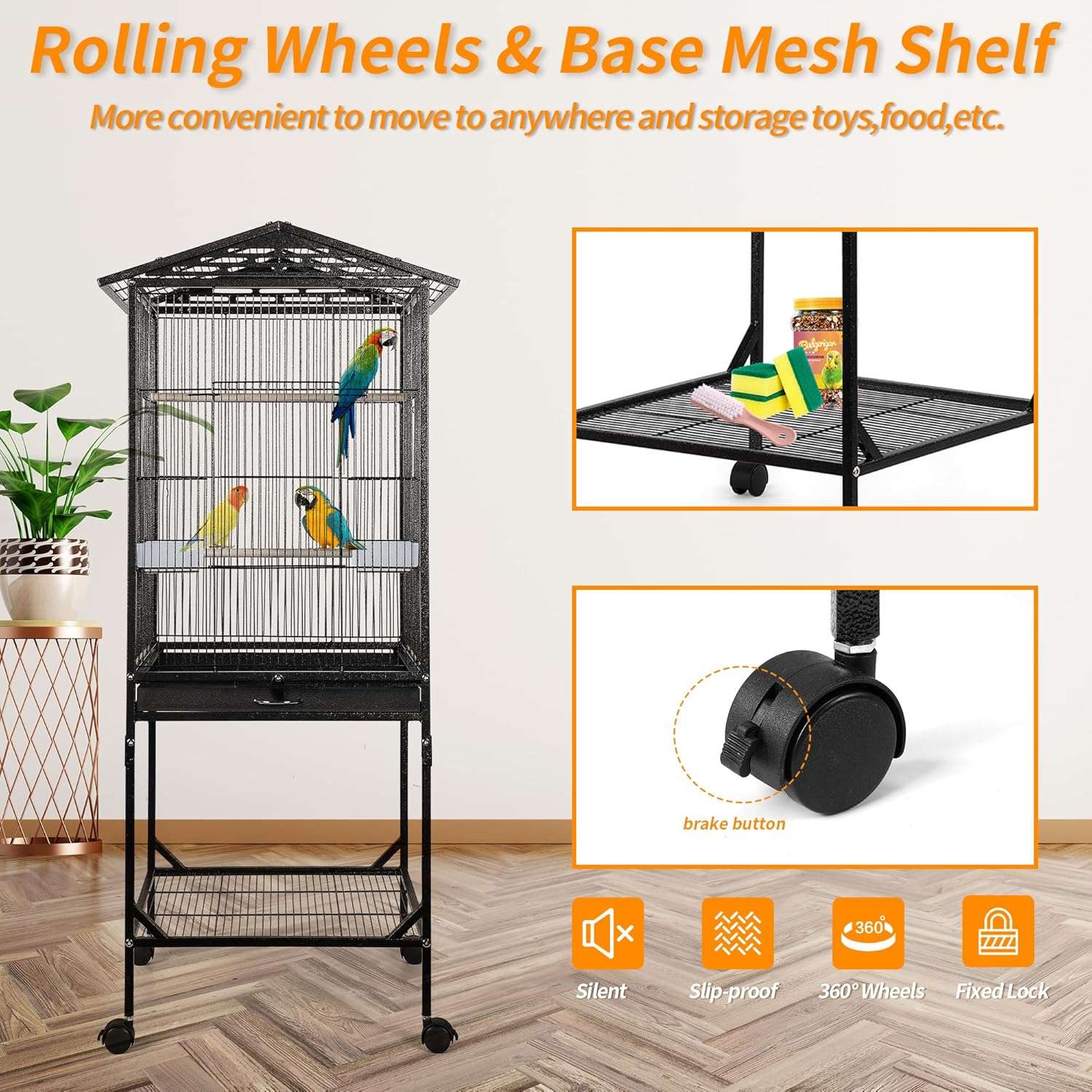 Cómodo movimiento: la jaula para periquitos se asienta en cuatro ruedas giratorias de 360 grados (dos con frenos), por lo que es fácil de mover en todas las direcciones sin problemas. El pequeño soporte de malla es conveniente para almacenar alimentos para pájaros, juguetes u otros suministros para mascotas.