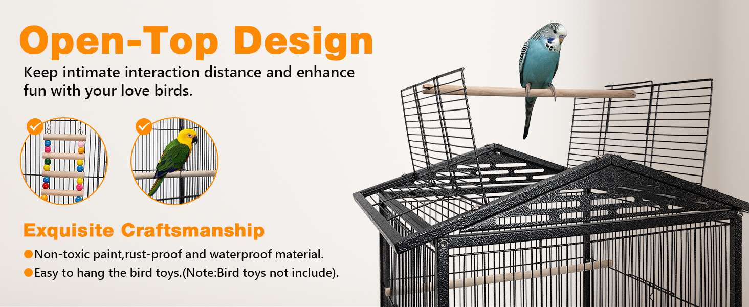Diseño bien pensado: esta jaula de cacatúa con diseño de parte superior abierta, el techo de la jaula para pájaros se puede abrir y cerrar y el soporte de madera para pájaros proporciona una auténtica percha, lo que proporciona un lugar para que cultives la intimidad con tus pájaros. Los paneles delanteros y laterales cuentan con 4 pequeñas ventanas de alimentación, no solo se utilizan para alimentar y rellenar agua, sino que también puede montar cajas de cría o baño de pájaros.