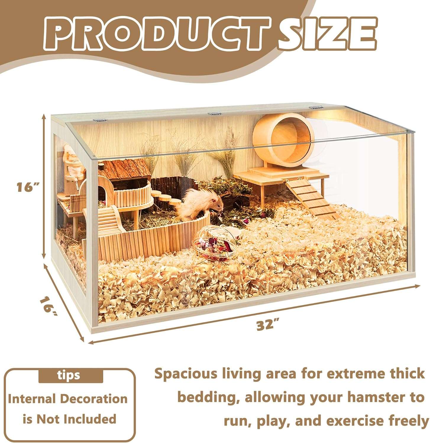Calidad prémium: construido con madera natural firme y de alta densidad con acabado resistente a la putrefacción y a la corrosión e impermeable. El material de las ventanas son paneles acrílicos transparentes, por lo que siempre puede tener una visión clara para observar las actividades de sus preciosos hámsters. También viene con una lámina acrílica transparente para colocar en la parte inferior de la jaula, evita la humedad y hace que la limpieza sea mucho más fácil. Esta jaula será una gran inversión debido a su diseño duradero y estético.