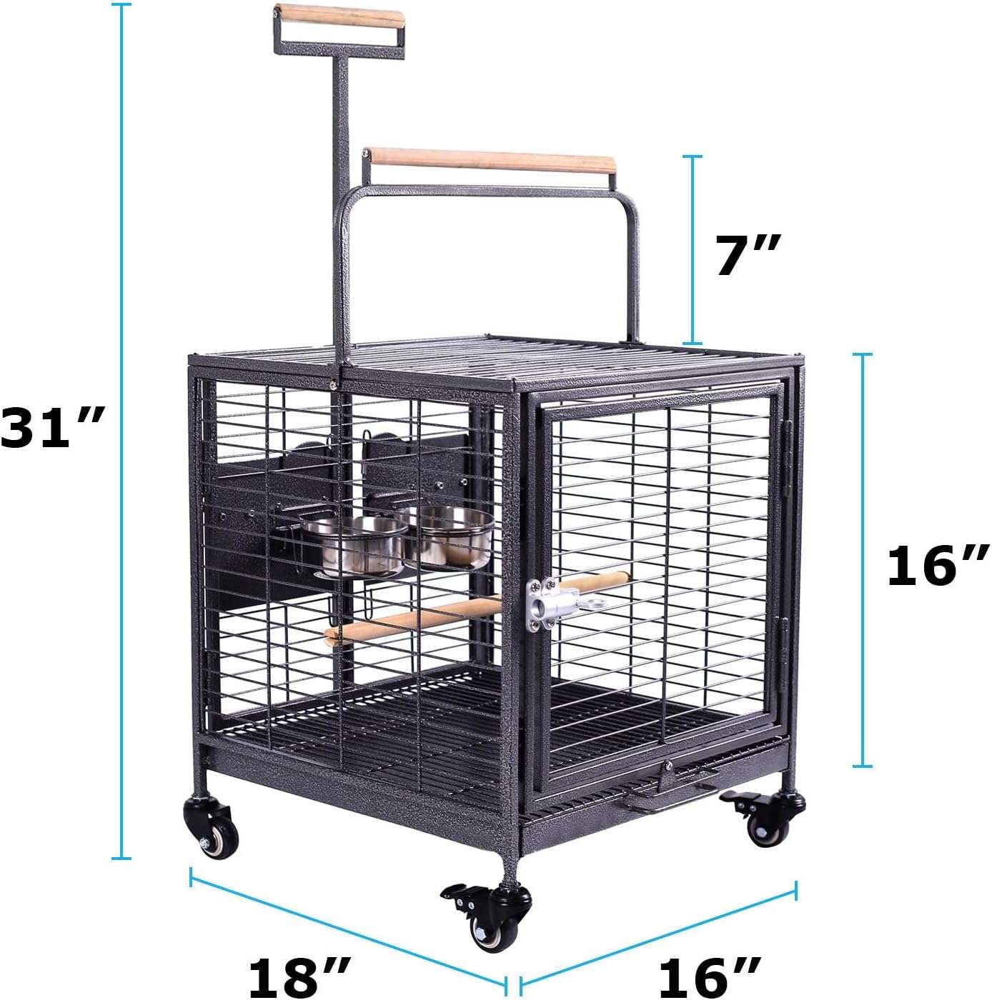 Construido para durar: el marco portátil de jaula para pájaros está hecho de hierro forjado de alta calidad, acabado en un revestimiento negro para un material duradero, a prueba de óxido y sin astillas, por lo que es seguro para los picos de pájaros más duros. Dimensiones de la jaula: 18 pulgadas de largo x 16 pulgadas de ancho x 16 a 31 pulgadas de alto. Esto es la jaula perfecta para loros pequeños, conures, tortolitos, cacatúas, periquitos y cuáqueros.
