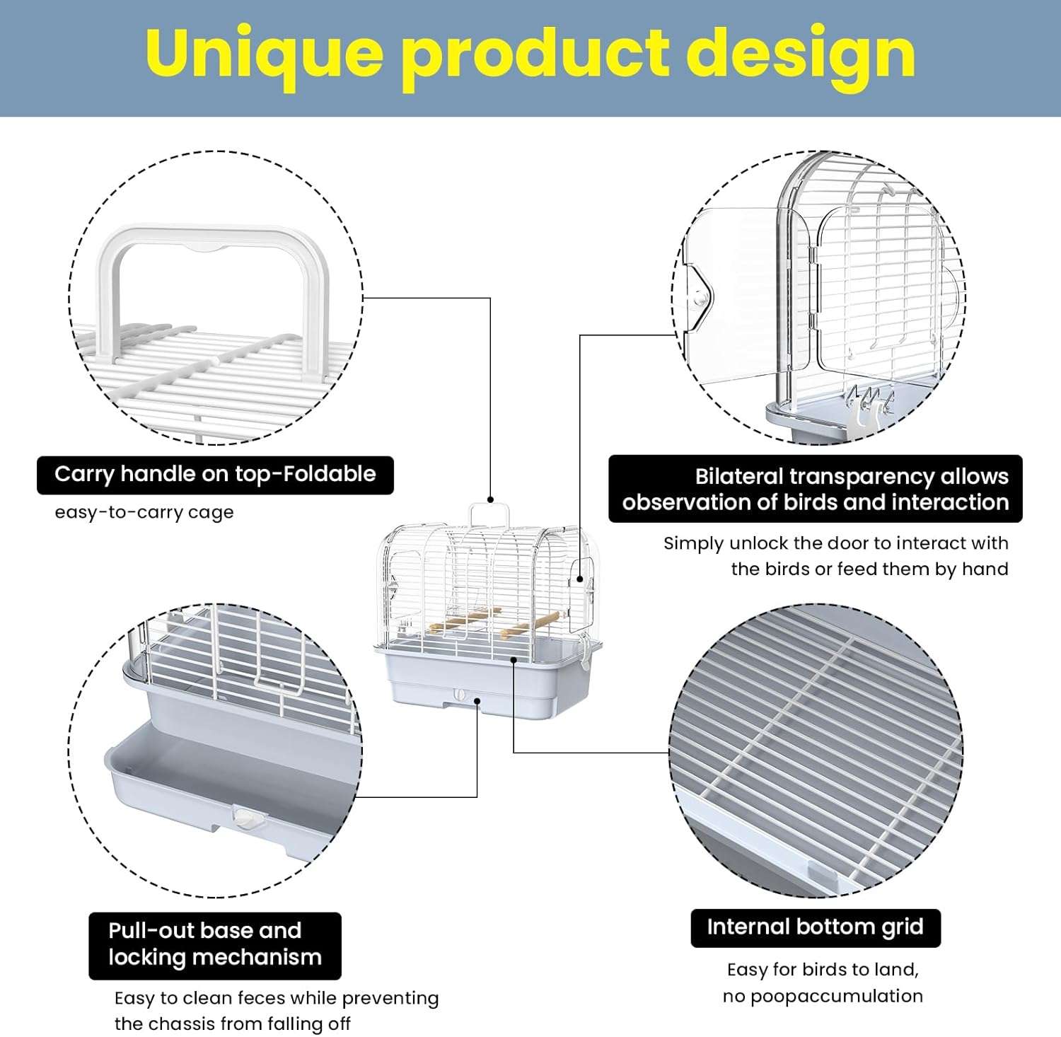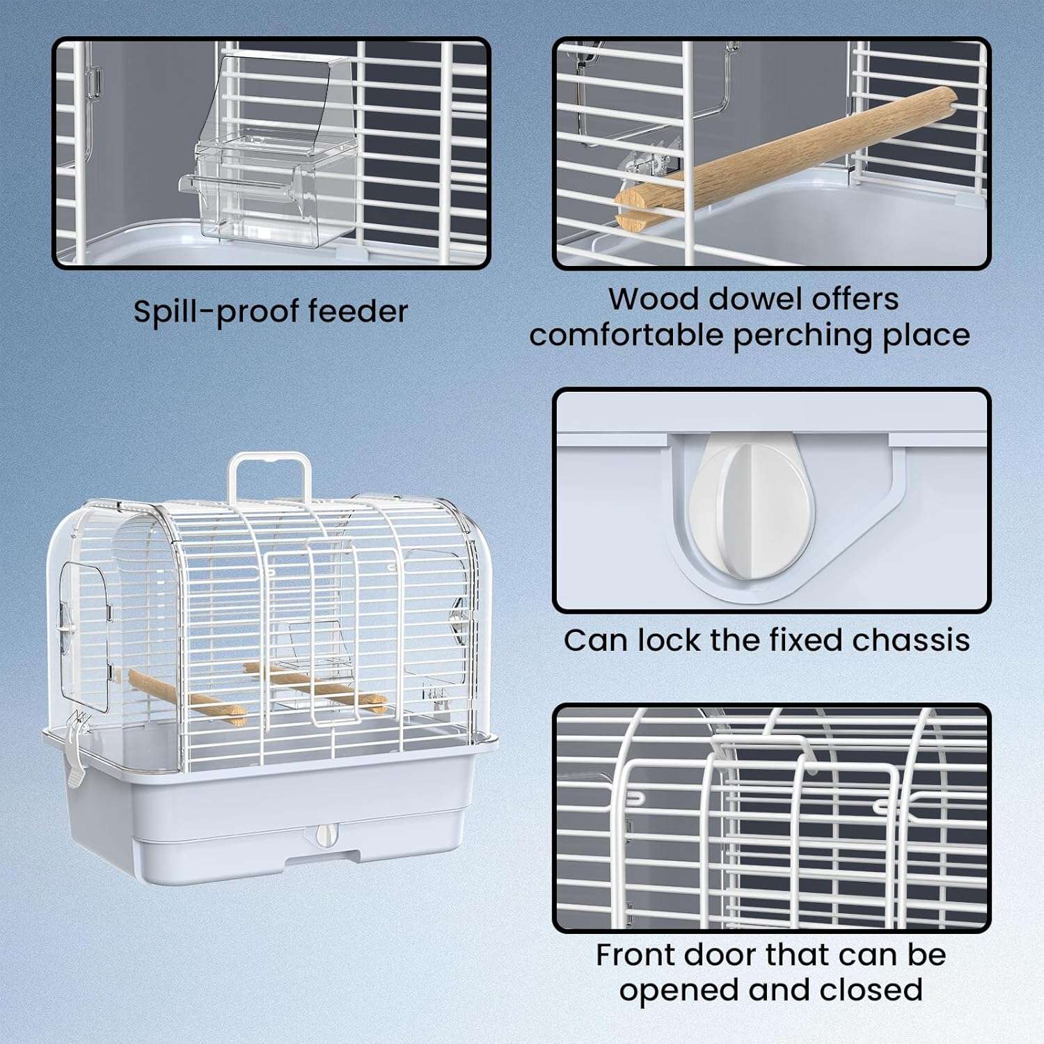 Portátil y ligera: esta jaula para pájaros pesa solo 2.5 libras. Su diseño ligero hace que sea fácil de transportar, por lo que es la mejor opción para el transporte diario de aves. Dimensiones del producto: longitud 16.5 pulgadas, ancho 11.57 pulgadas, altura 14.37 pulgadas. Adecuado para llevar loros, cacatúas, canarios y otras aves durante viajes, campamento o visitas veterinarias.