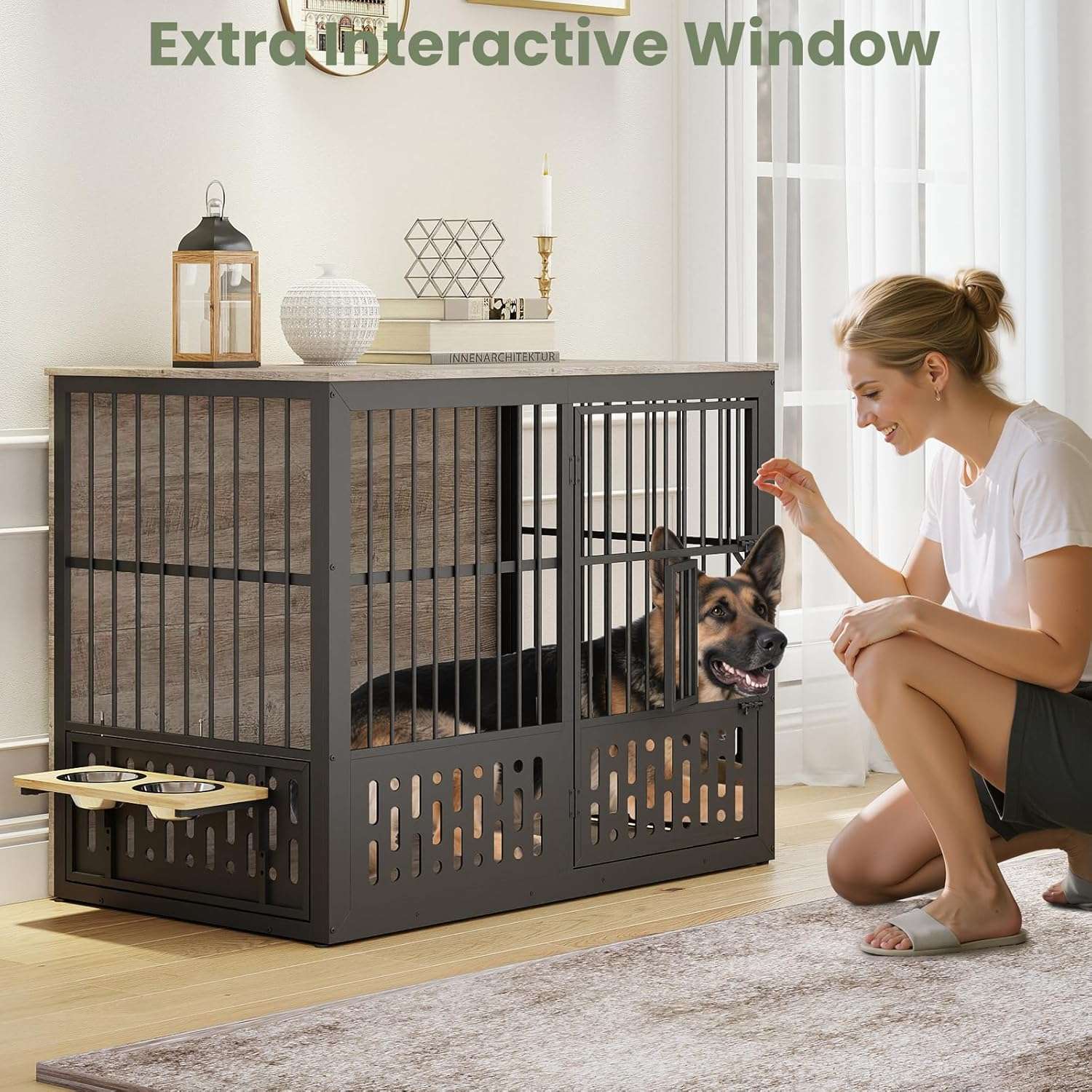 Cuenta con dimensiones muy amplias de 120 centimetros de largo 72 centimetros de ancho y 95 centimetros de alto proporcionando el espacio ideal para que su perro pueda pararse girar jugar y descansar con total comodidad Una de sus mayores innovaciones es su ventana interactiva diseñada especificamente para perros ansiosos Esta abertura permite que el animal asome la cabeza para aliviar la sensacion de encierro mientras usted puede acariciarlo y tranquilizarlo sin necesidad de abrir la puerta principal