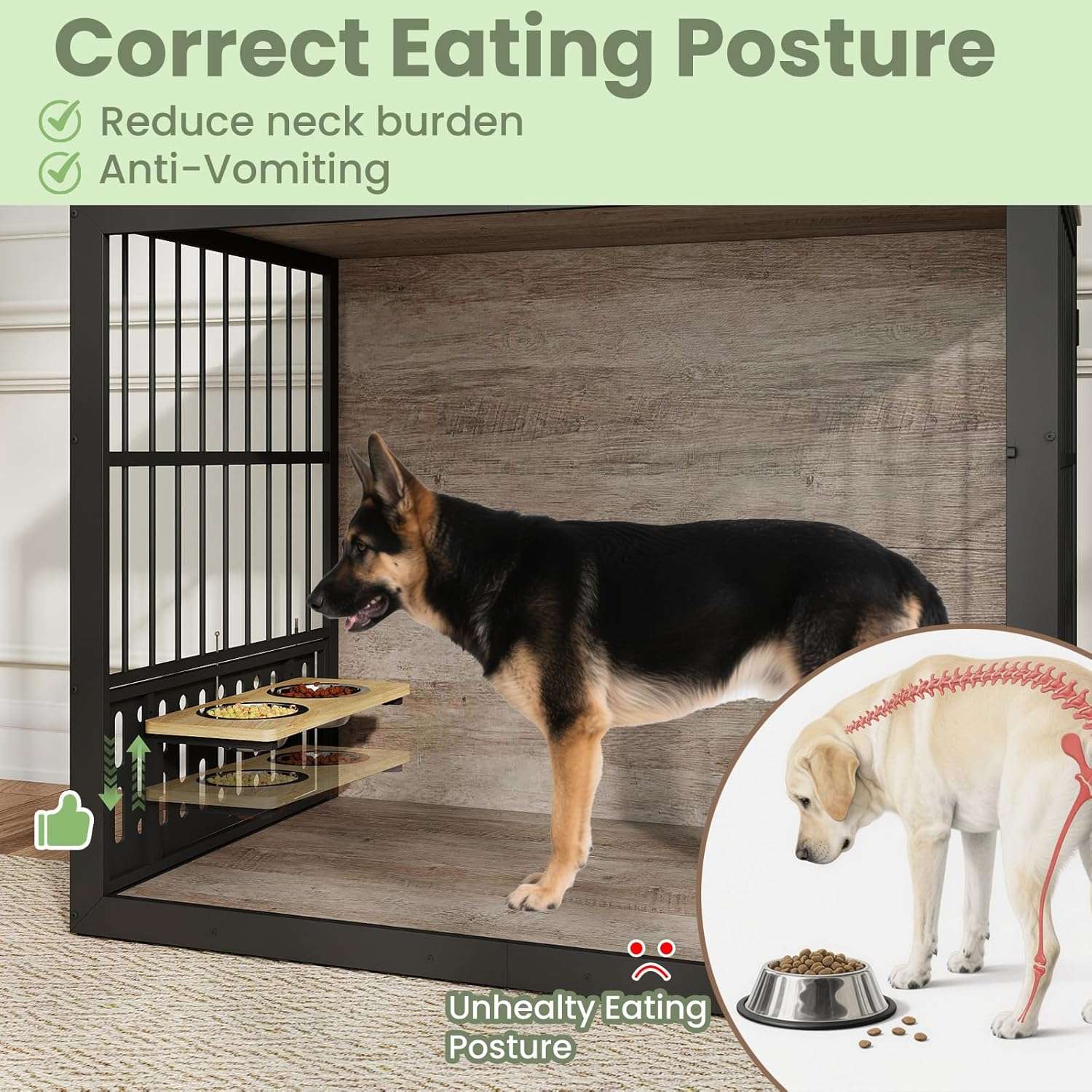 Para facilitar el cuidado diario incluye un exclusivo sistema de alimentacion giratorio en 360 grados Este soporte estabilizado cuenta con dos cuencos de acero inoxidable que se pueden ajustar facilmente en cinco niveles de altura diferentes Esto promueve una digestion saludable y cuida la columna cervical de su perro permitiendole entregar comida y agua desde el exterior de forma rapida y segura