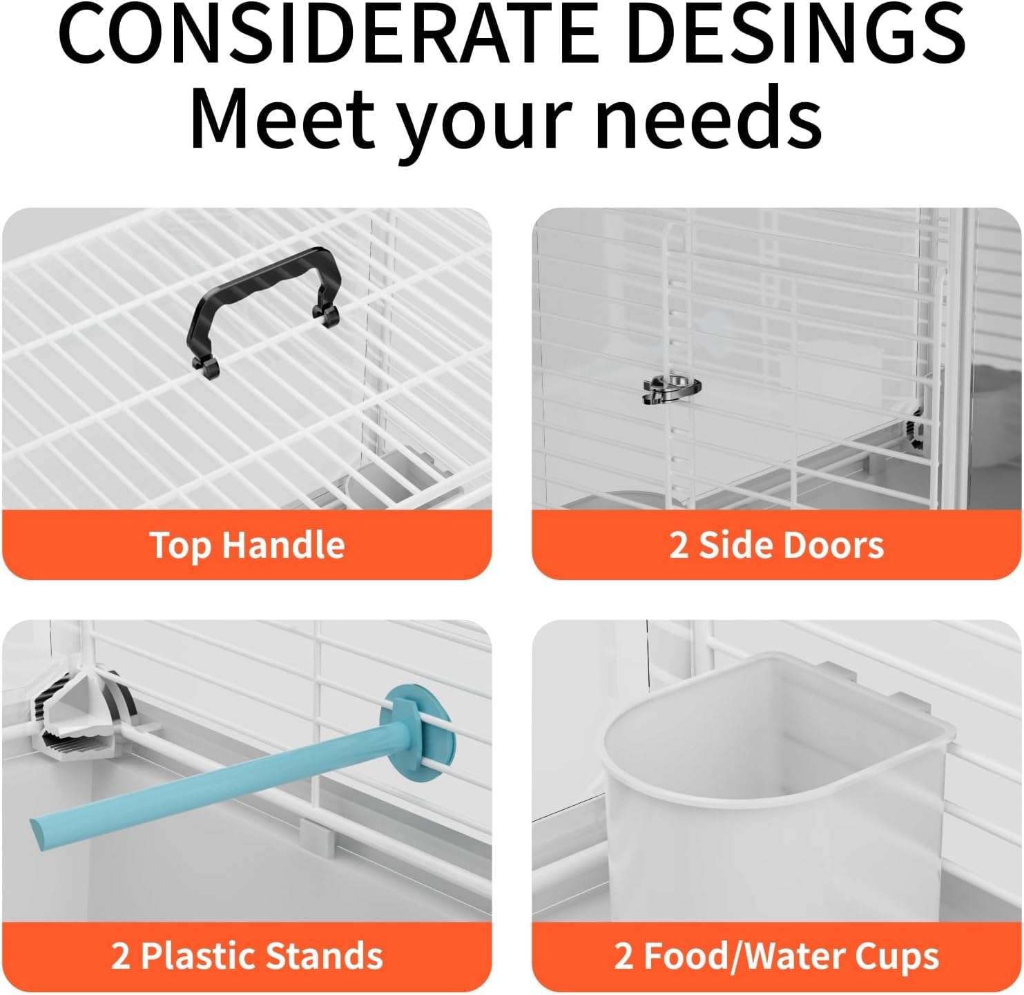 Accesorios completos: esta jaula para loros viene con 2 soportes rodantes y 2 cuencos, proporcionando un lugar cómodo para que tus pájaros descansen y coman. Y las puertas correderas en ambos lados te permiten añadir fácilmente comida y agua, mientras que también hace que sea más conveniente interactuar con tus pájaros mascotas.