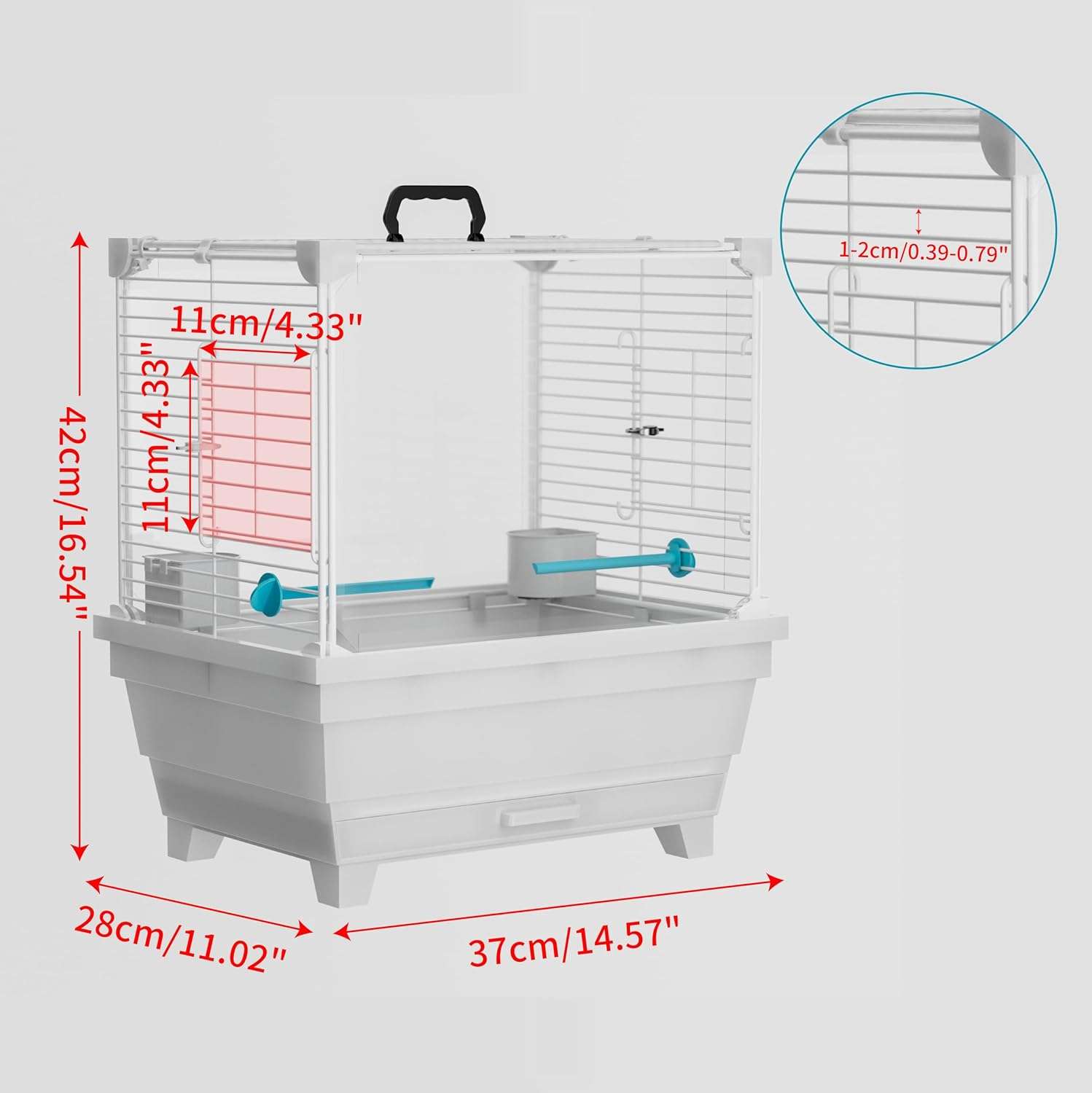 Jaula para pájaros pequeña: esta jaula para pájaros mide 14.57 x 11.02 x 16.54 pulgadas con espacio de barra de 0.39 a 0.79 pulgadas, por lo que es ideal para aves pequeñas como periquitos, loros, cacatúas, conures, periquitos y más. Ofrece un hogar cómodo y seguro para sus encantadoras aves.