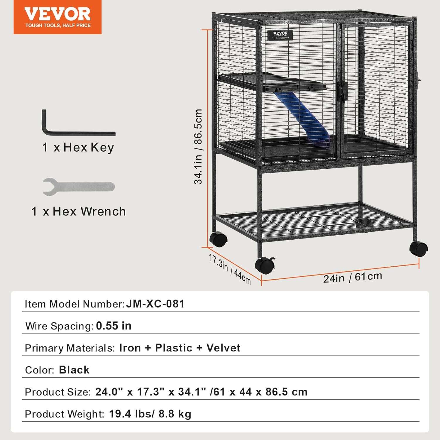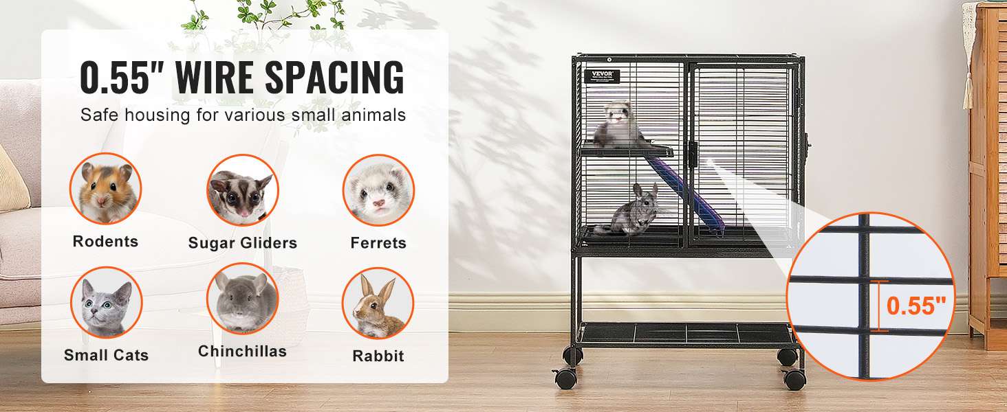 Espaciosa área de estar: esta jaula de hurones proporciona a su mascota un área de actividad espaciosa de 24″x17.3″x34.1″/610x440x865 mm. Nuestra jaula para hurones incluye una rampa antideslizante cubierta de tela para apoyar las necesidades de juego y ejercicio de tu mascota. Obtén la jaula de chinchilla de metal VEVOR para obtener un amplio espacio tanto para la vida como para las actividades