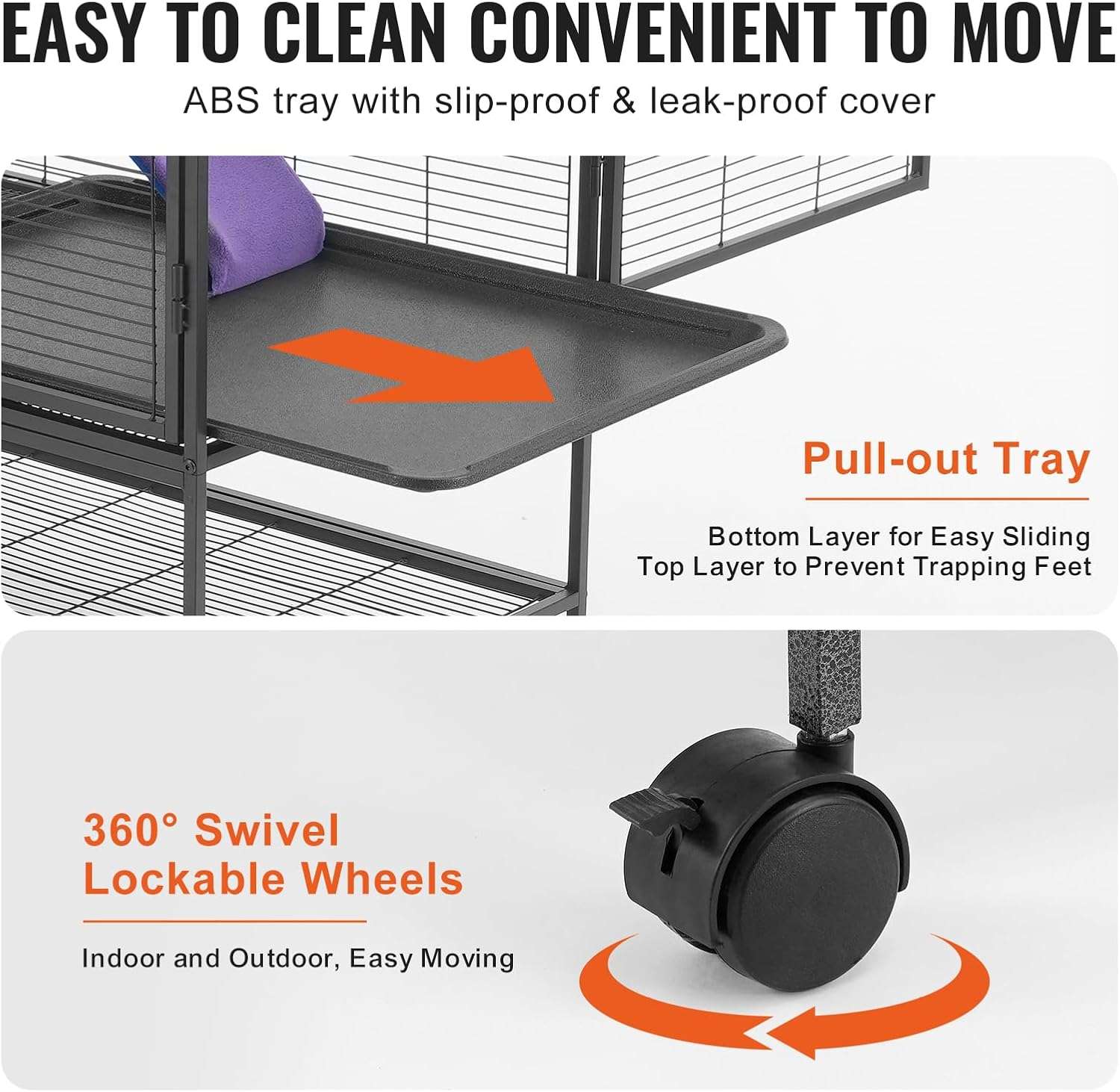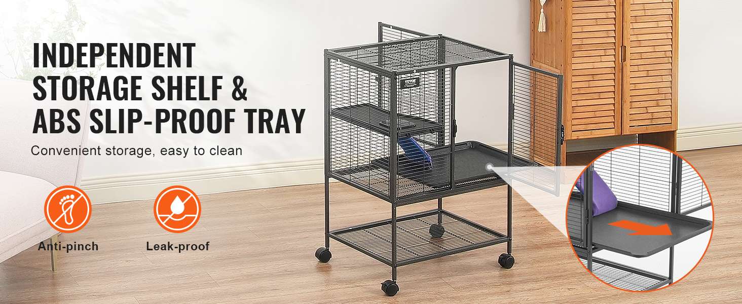 Fácil de limpiar: las plataformas y rejillas extraíbles facilitan la limpieza de la jaula de hurón. La bandeja inferior de metal con revestimiento de ABS se ajusta firmemente a la malla metálica para evitar fugas de orina y lesiones en los pies, proporcionando un ambiente seguro. La jaula VEVOR para hurones con diseño extraíble y puerta frontal que se puede abrir facilitan una limpieza rápida y cómoda.