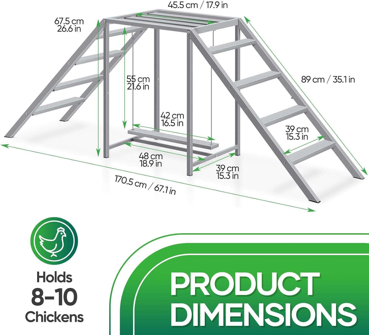 Capacidad Espaciosa para 8 a 10 Aves Con un largo total de 170 cm, este gimnasio ofrece espacio suficiente para que un grupo de 8 a 10 gallinas se mueva, socialice y descanse cómodamente. Su estructura sólida garantiza estabilidad, permitiendo que tus aves disfruten de un entorno seguro durante todo el año.