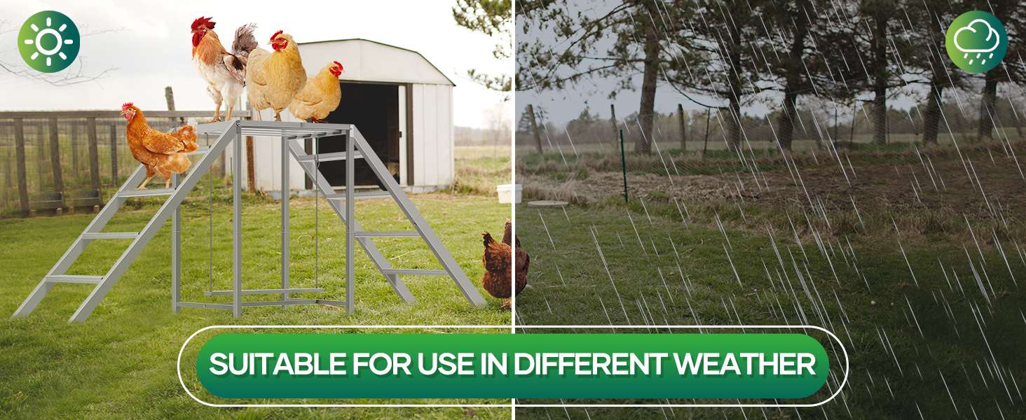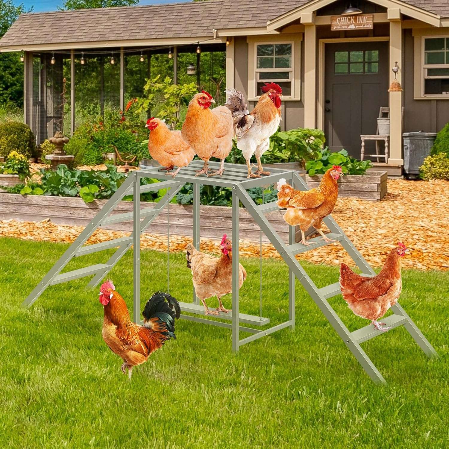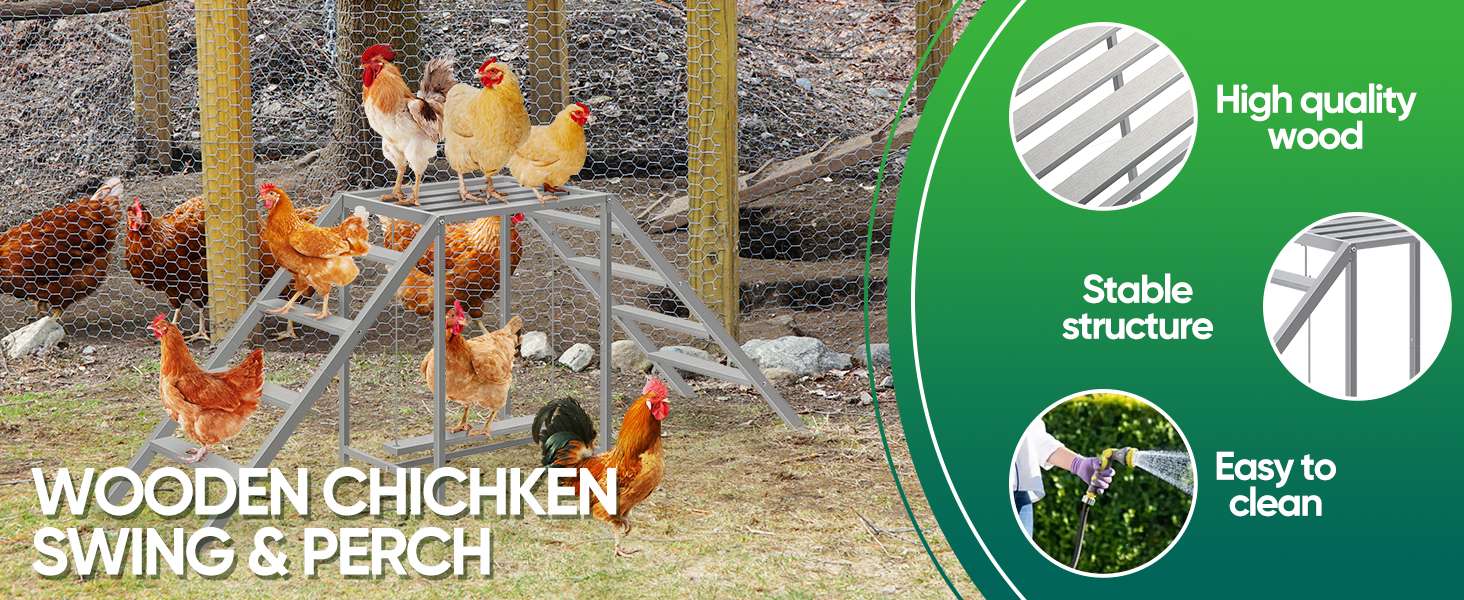 Diversión para Todo el Corral y Mascotas Gracias a sus múltiples perchas y niveles, este juego permite que muchas aves interactúen al mismo tiempo. Es tan versátil que no solo sirve para pollos y gallinas, sino que también es ideal para gatos, conejos y otras aves domésticas. Puedes instalarlo dentro del gallinero o en el patio al aire libre.