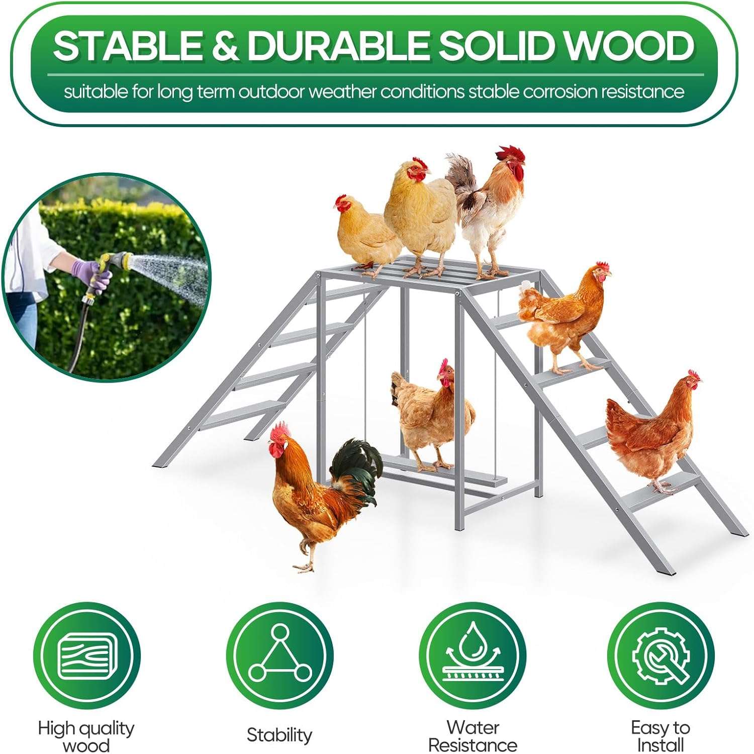 Materiales Híbridos de Alta Durabilidad Fabricado para resistir el paso del tiempo, combina tubos de metal resistentes a la corrosión con madera orgánica tratada con pintura a base de agua. Esta mezcla de metal y madera no solo es robusta, sino que crea una superficie fácil de limpiar que a las gallinas les encanta para posarse.